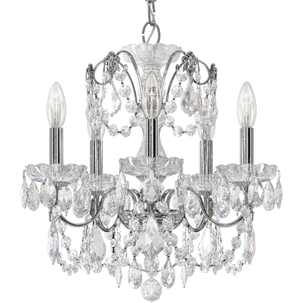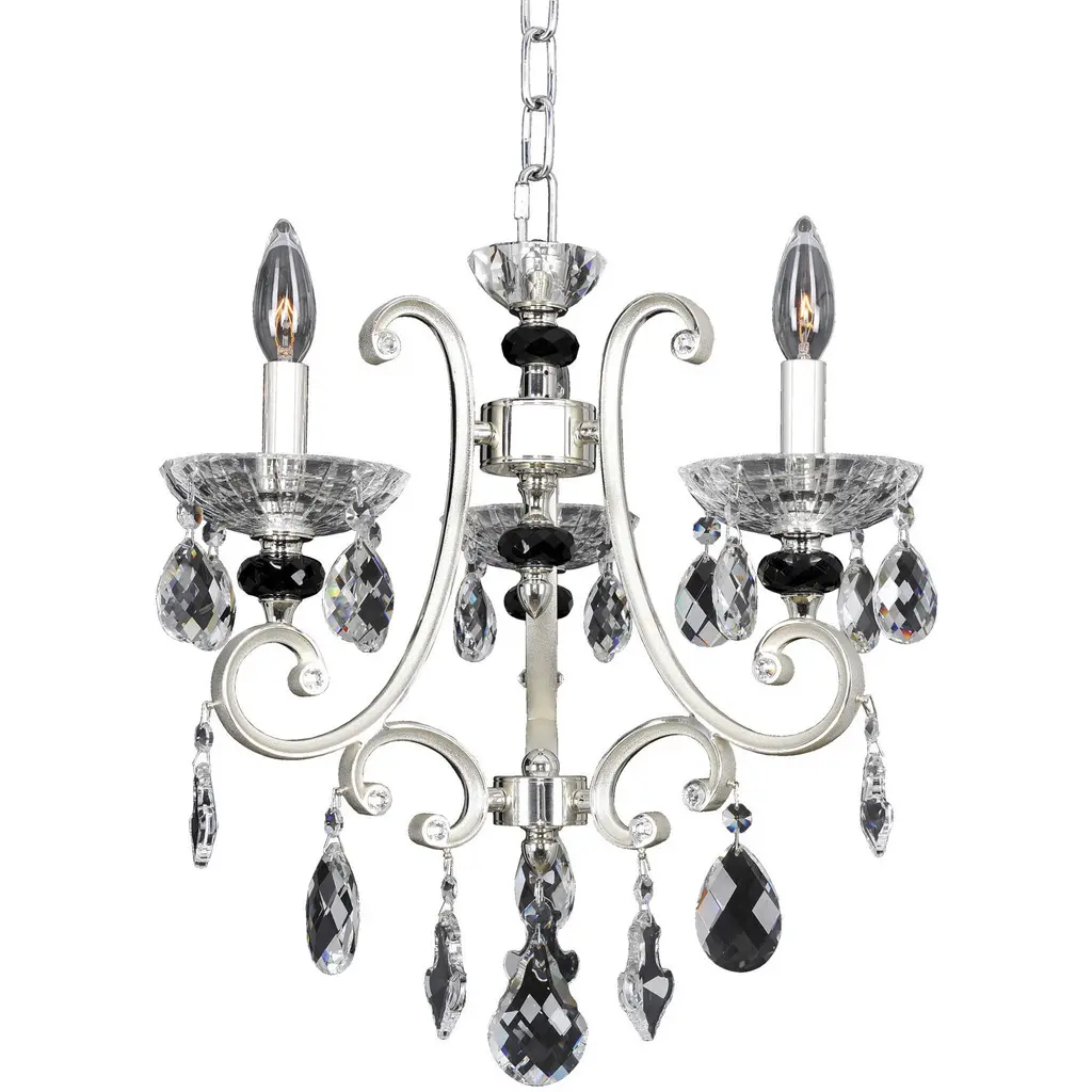 The New Orleans Mini Chandelier by Schonbek Lighting dazzles with a beautiful French Baroque motif. A dance of twirling branches embellishes a crystal crown, creating a layered and sculptural silhouette around a crystal column. Decorative cups hold a set of exposed candelabras that shine and interact playfully with the faceted crystals that adorn this decadent mini chandelier. Luxurious and elaborate, this small but mighty piece illuminates interior spaces with a delightful dose of style.