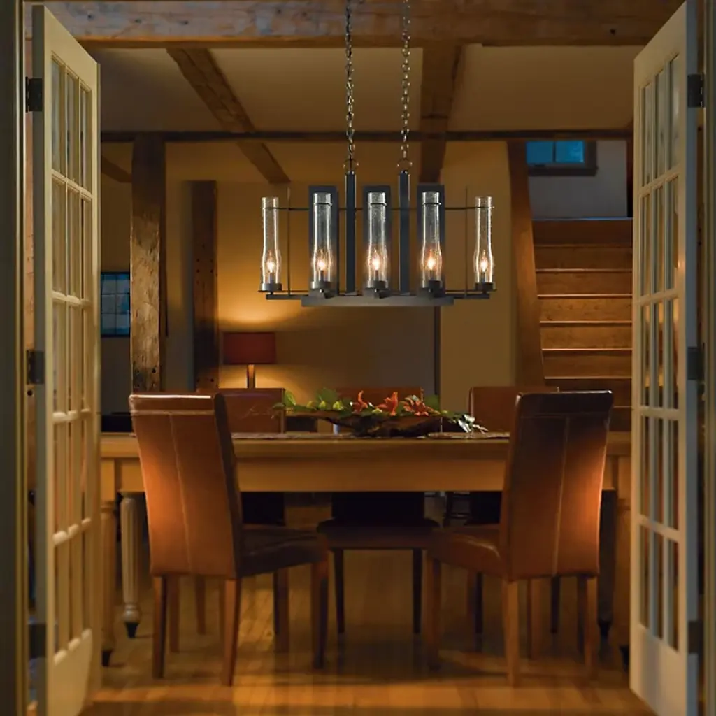The New Town Chandelier by Hubbardton Forge is a handsome and bold display of hand worked Iron and Glass. With a wagon wheel silhouette, a strong hand forged Wrought Iron frame supports a circular arrangement of hand blown Clear Seeded Glass shades. Behind each light source, a slim Iron plate with a vent allow texture, light, and shadow to play within and around this fixture. A balanced composition with a handsome touch, this chandelier makes a spacious statement.