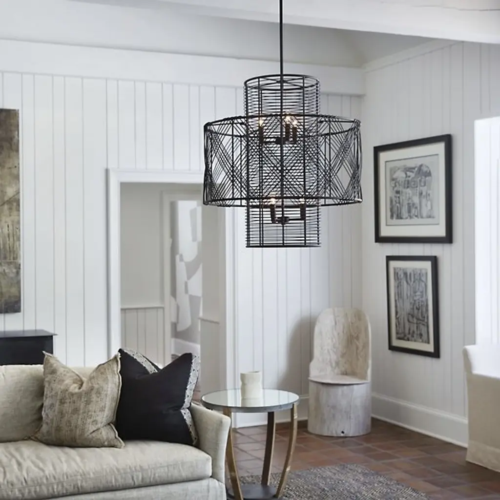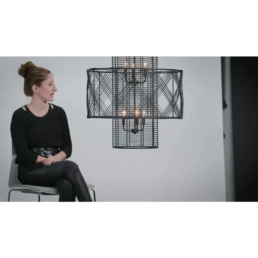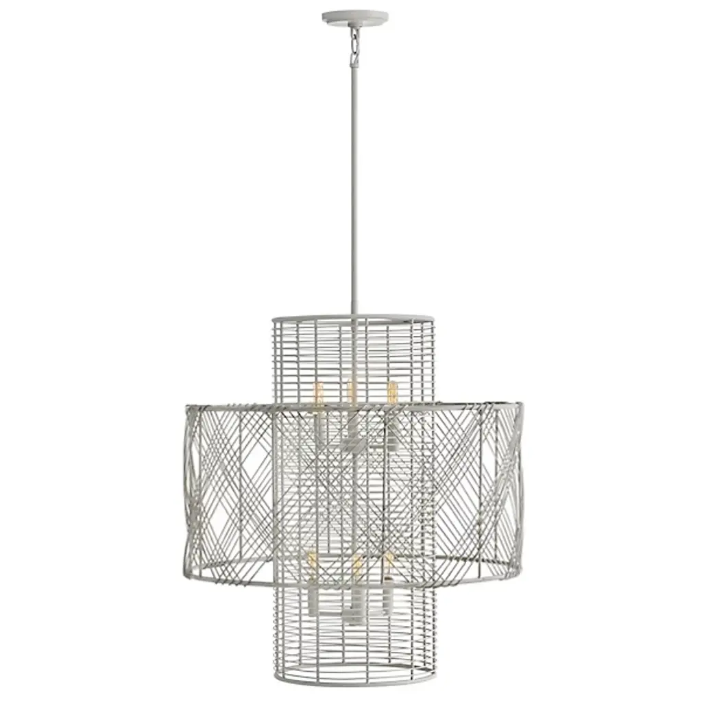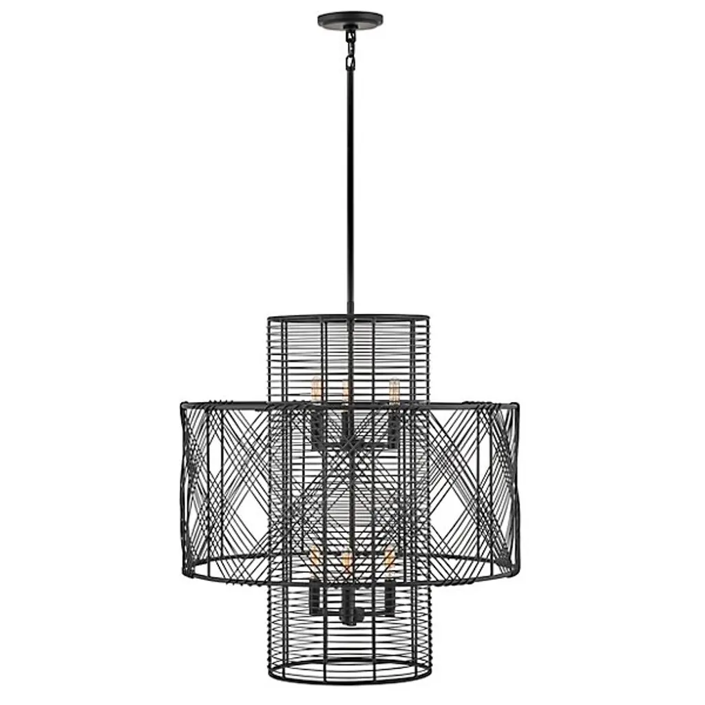 The Nikko Chandelier from Hinkley Lighting is a striking fixture that brings boldness to any space it inhabits. Its intricately designed shade consists of slender wire that is woven into a dimensional multi-tiered design. Multiple weave directions create a crosshatch aesthetic that brings interest and geometric charm to the piece while its open and airy element ensures the piece does not weigh down its surroundings. Warm light shines through the woven shade to offer its environment a bright ambient glow.