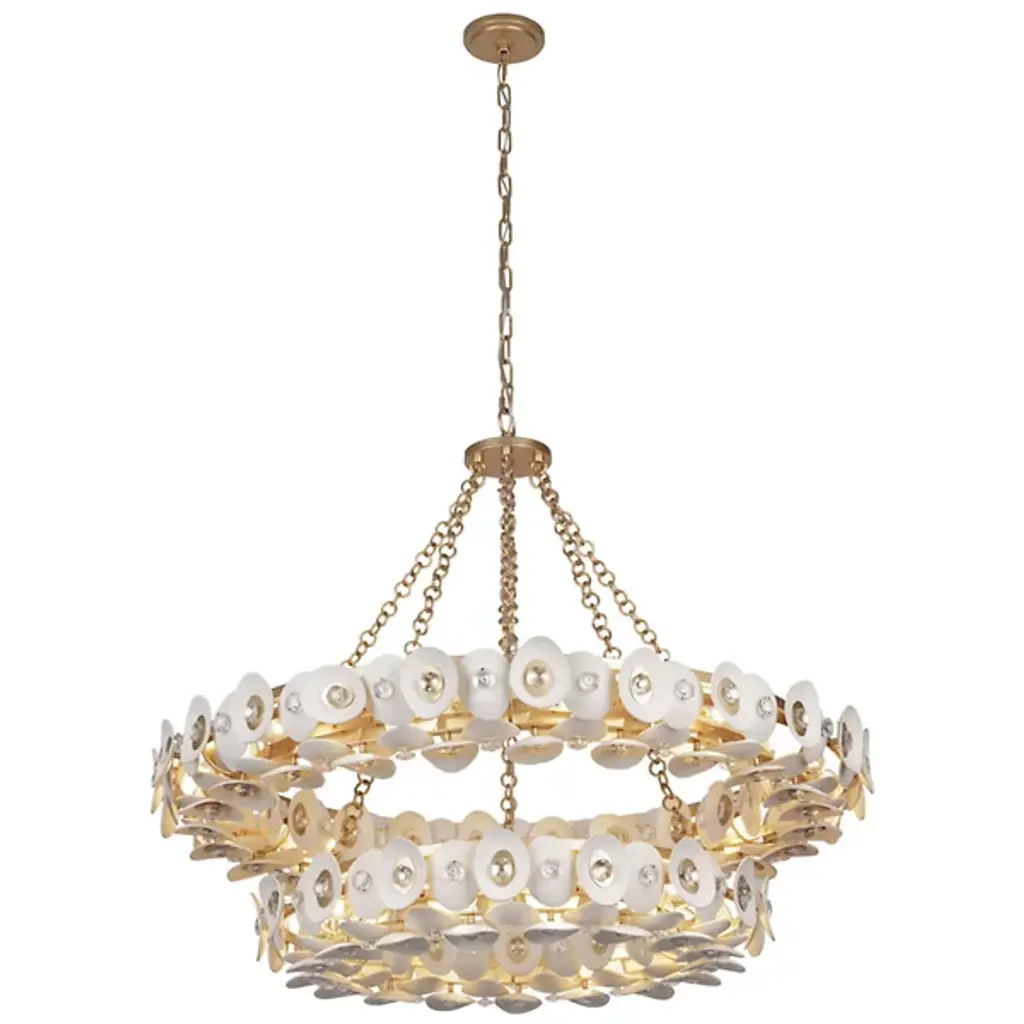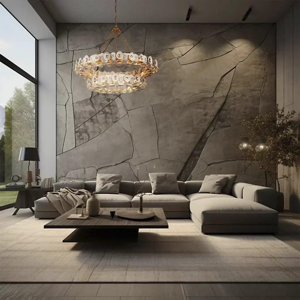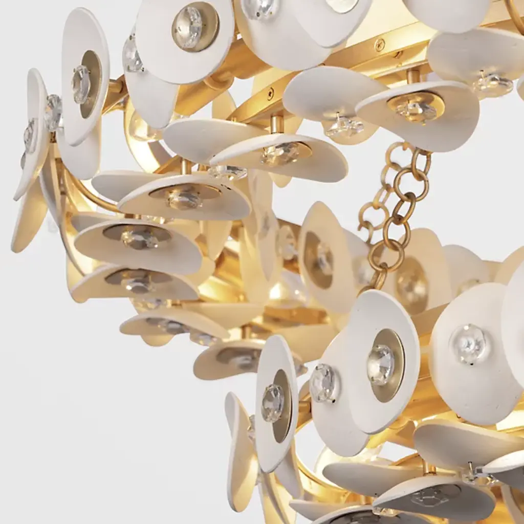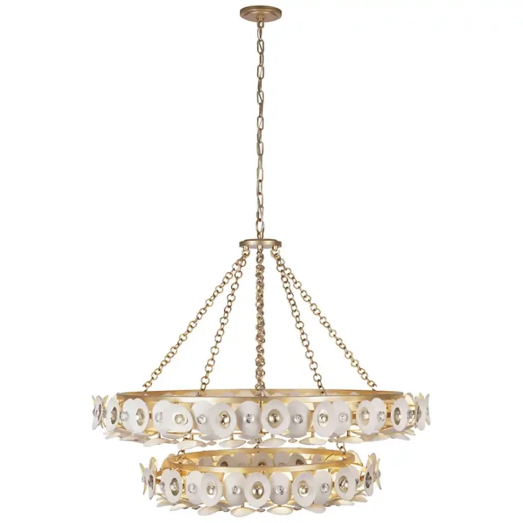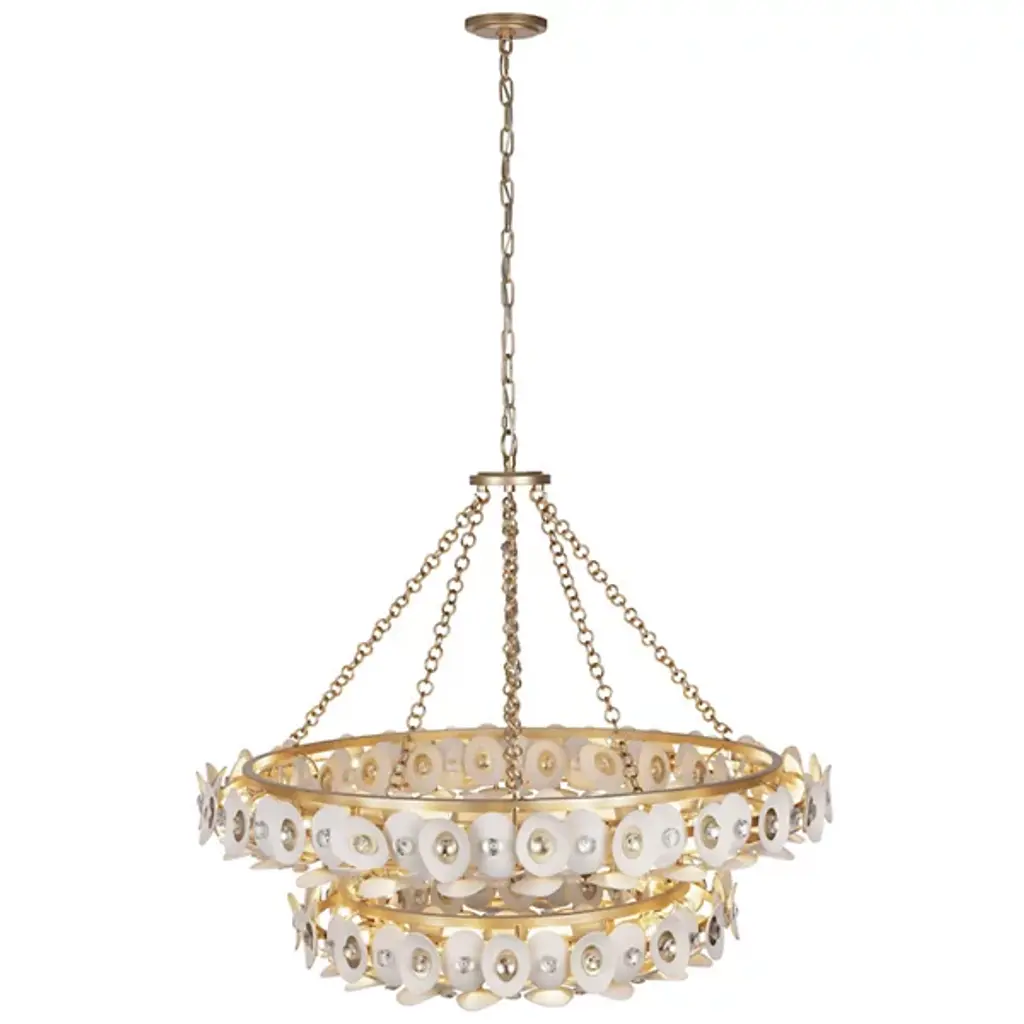 The Niu 2 Tier Chandelier from Metro Lighting arranges coconut shell discs and crystal accents in a horizontal configuration. The dual-tier design maximizes the interplay between natural and precision-cut materials. Steel supports maintain the linear form while allowing each element to catch and reflect light. The Niu Linear Suspension's extended length makes it ideal for living areas, dining tables, or kitchen islands.
