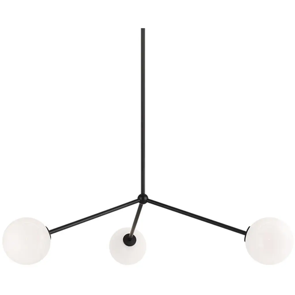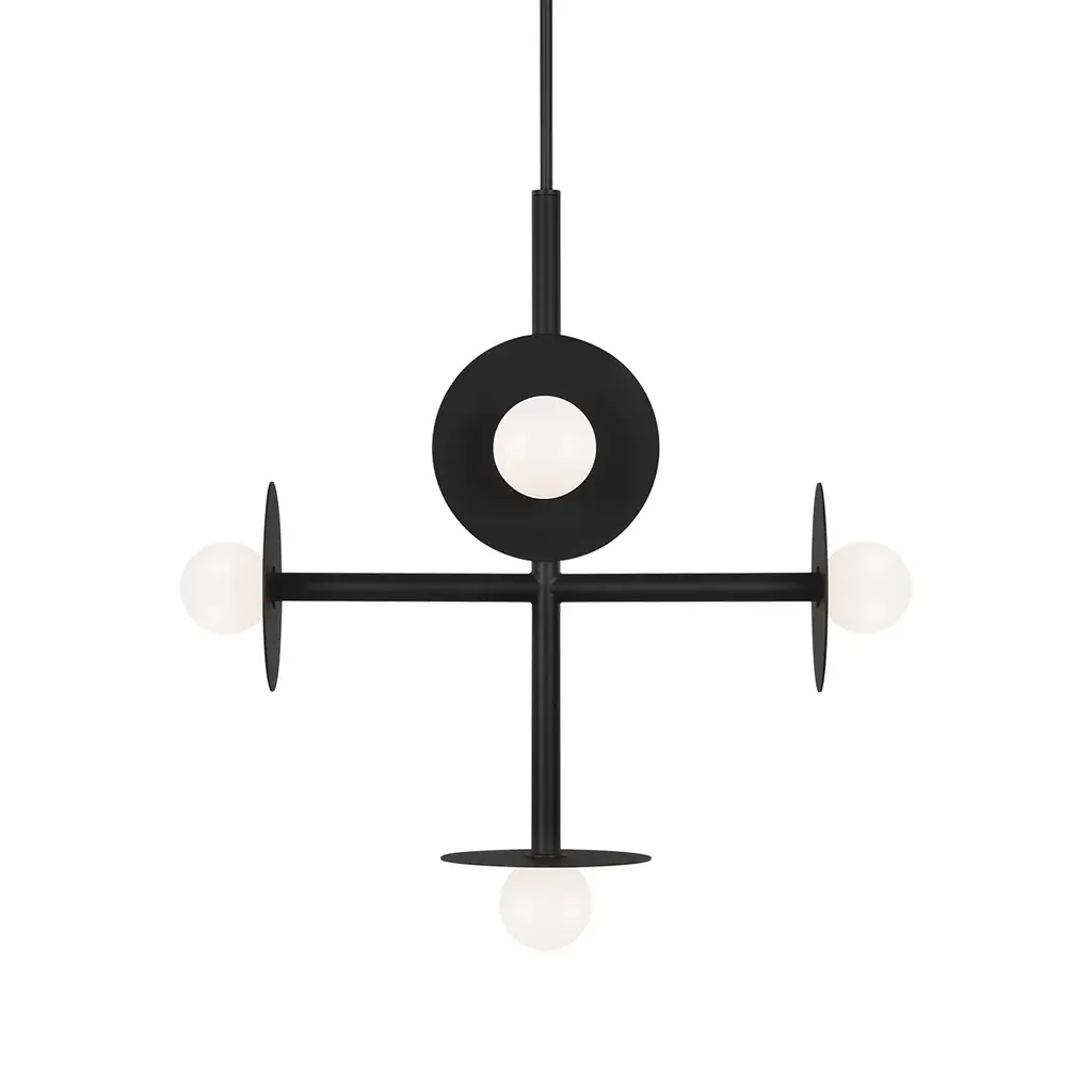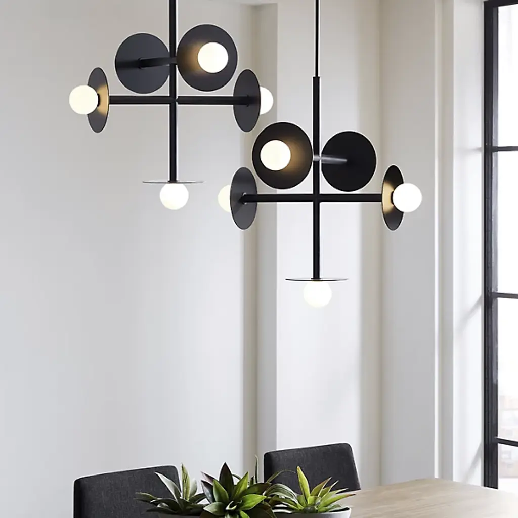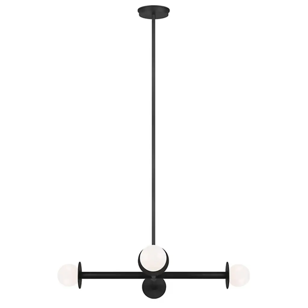 A sleek modern piece that adds style to the décor of your home, the Nodes 3 Tier Chandelier from Kelly by Kelly hangs from the ceiling with a simple round ceiling mount and a thin downrod. The cross-shaped body contains a set of arms that each end with a flat, circular backplate that shields a glass orb shade. A set of five bulbs in total spread a bright and full glow evenly throughout the surrounding space.