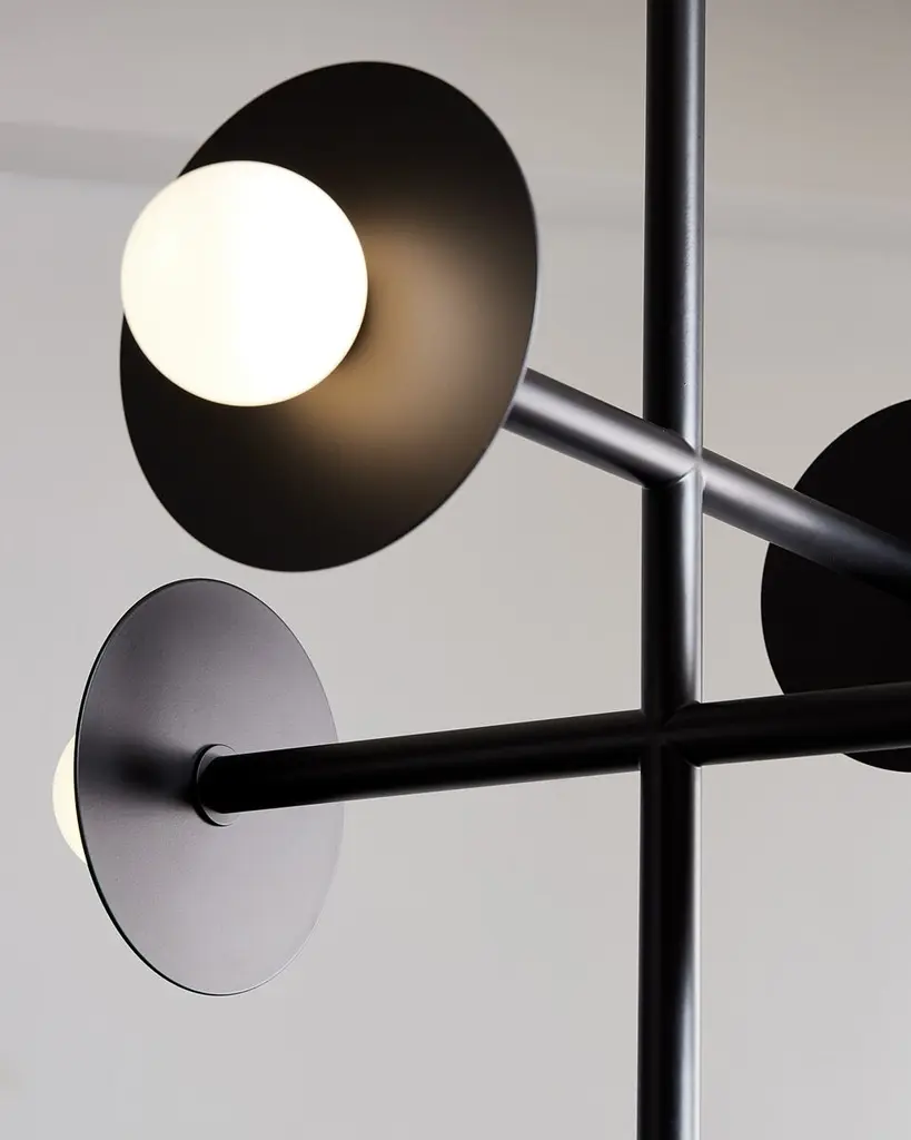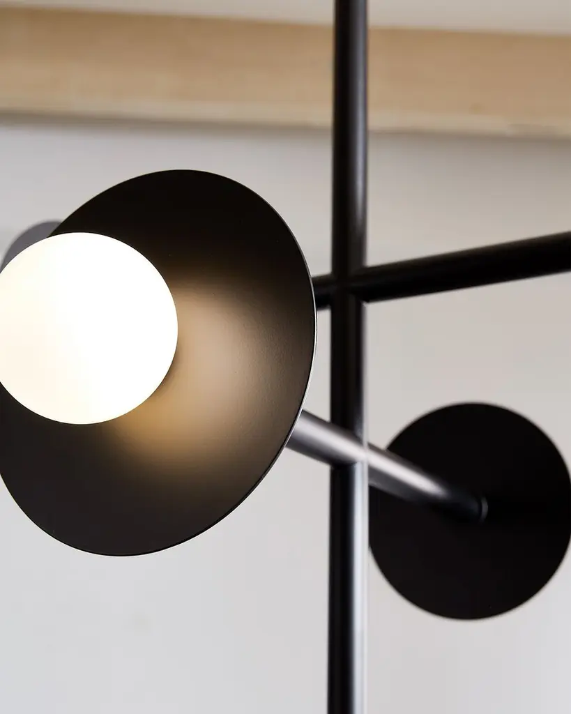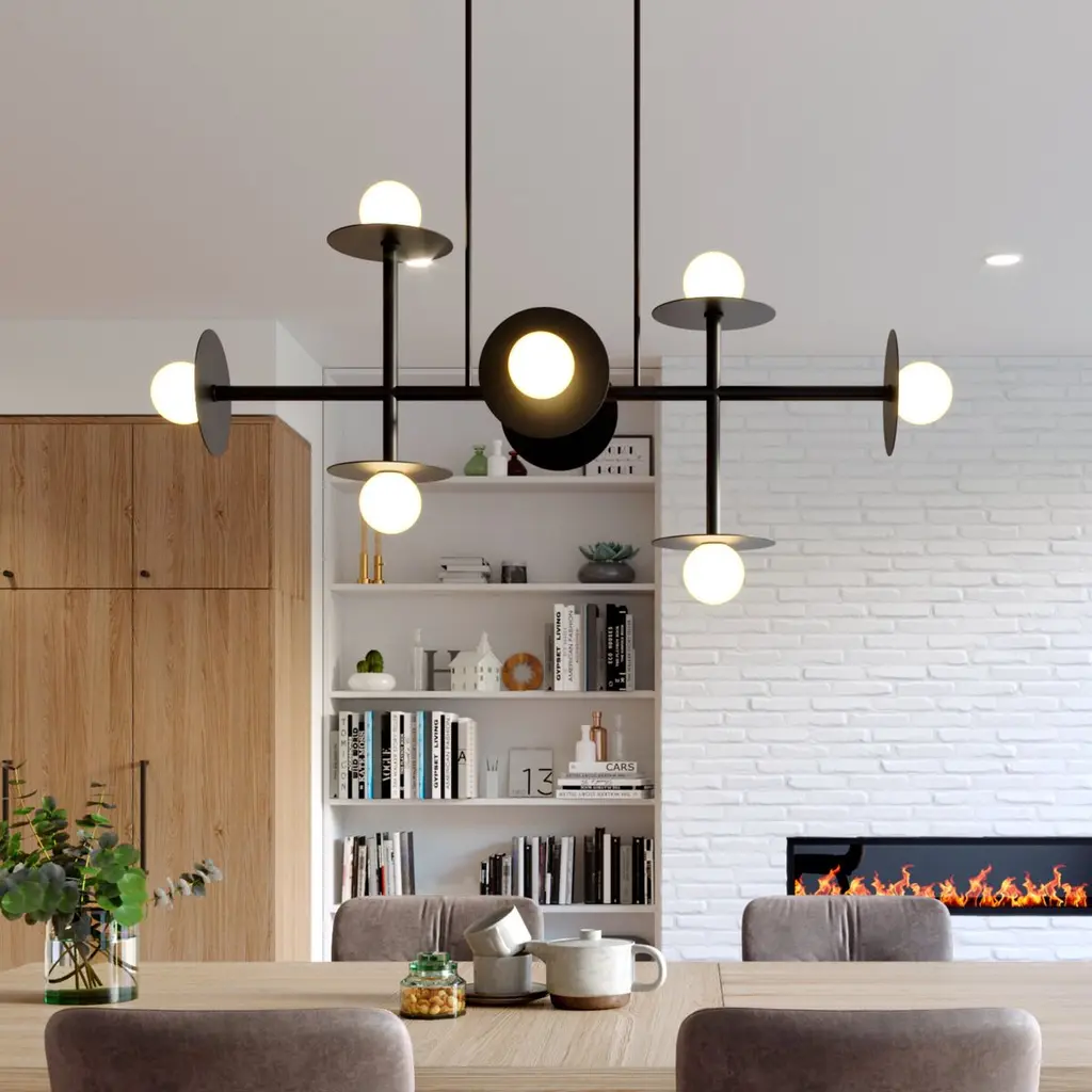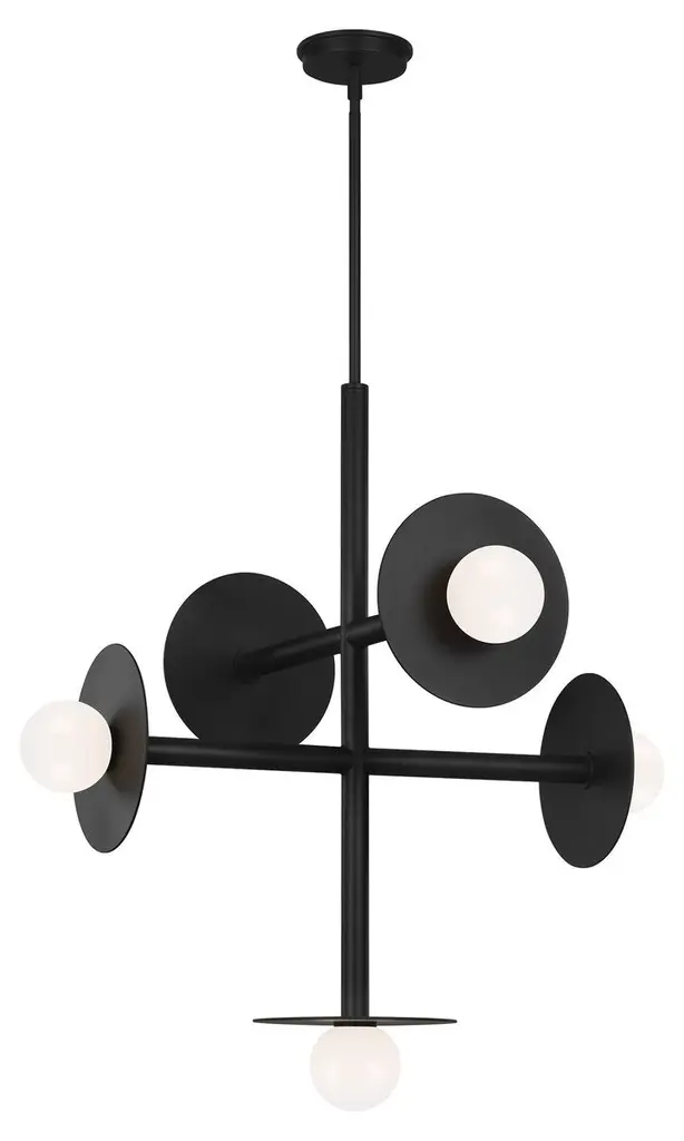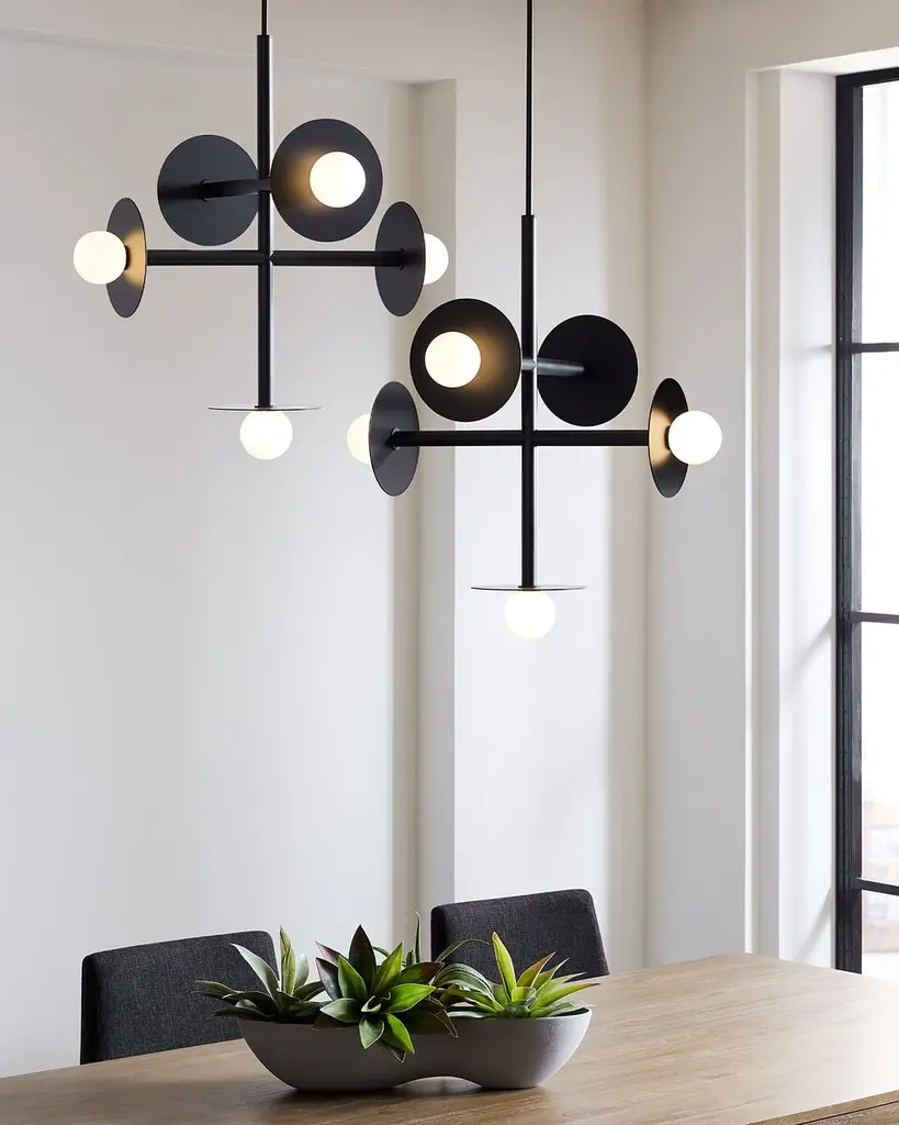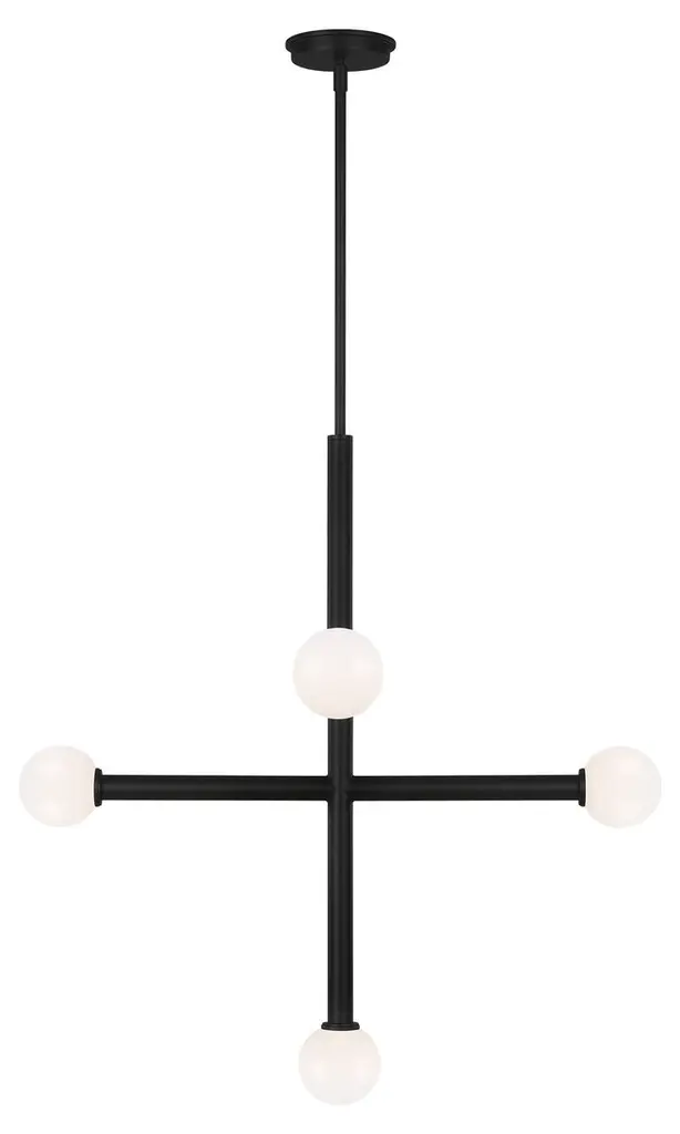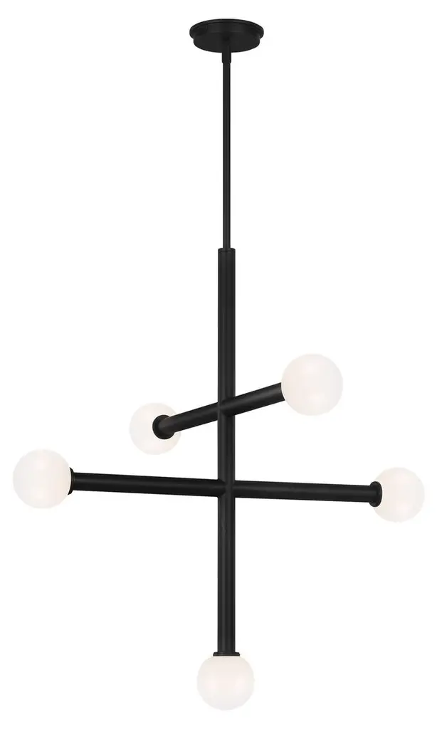 This dazzling chandelier pairs straight lines and graceful circles, opalescent mouth-blown milk glass and steel given a rich black finish.