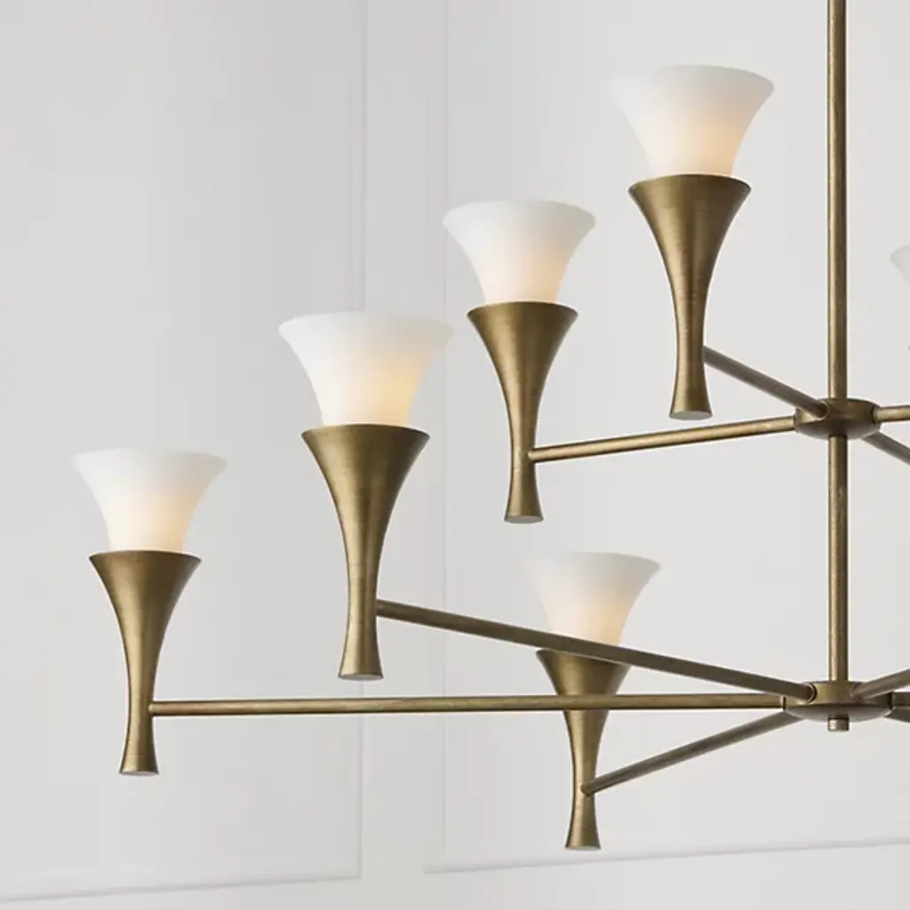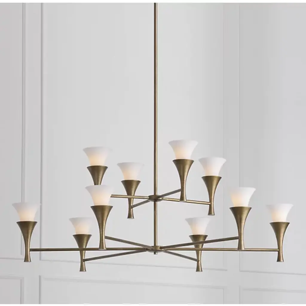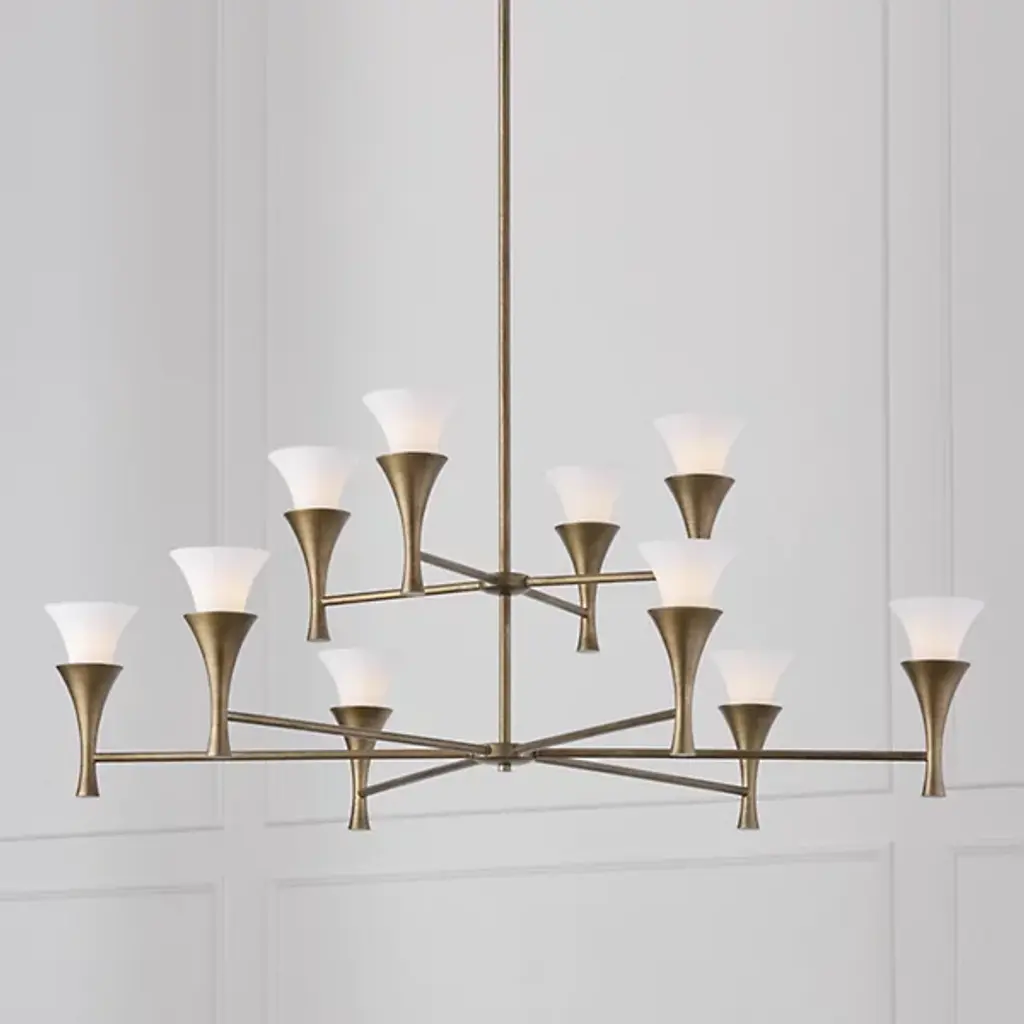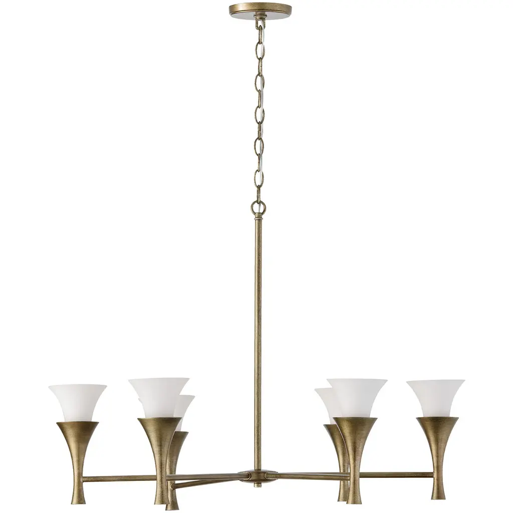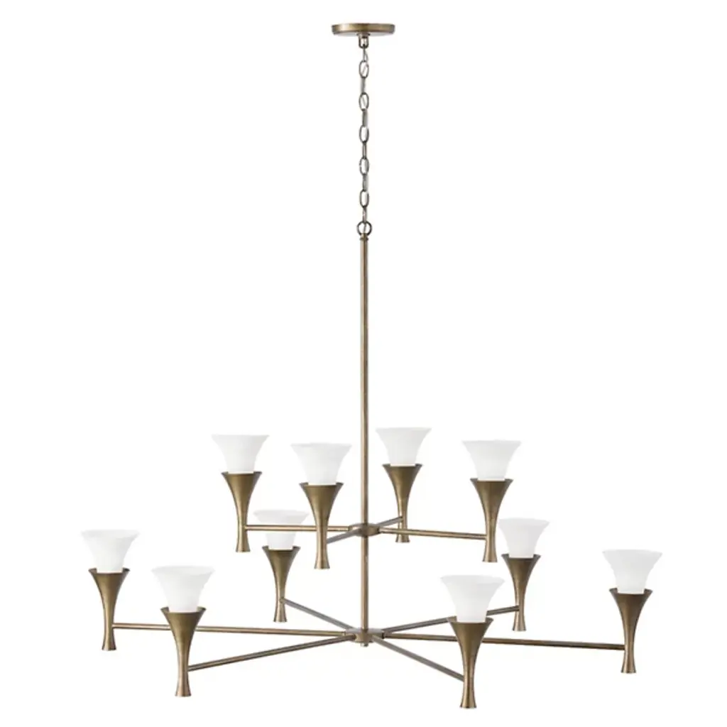 The Nola 2-Tier Chandelier from Capital Lighting reinvents traditional candlestick designs with unexpected flair. Metal arms extend gracefully from the central column, each cradling a soft glass shade within flared holders. The mystic luster finish catches and reflects light, creating lively effects as you move around the room. Handcrafted with attention to detail, this fixture brings personality through its subtle variations. The two-tier arrangement provides generous illumination while maintaining visual lightness. When lit, the ambient glow filters through the glass, washing your space in gentle radiance that complements the metalwork's amber tones.