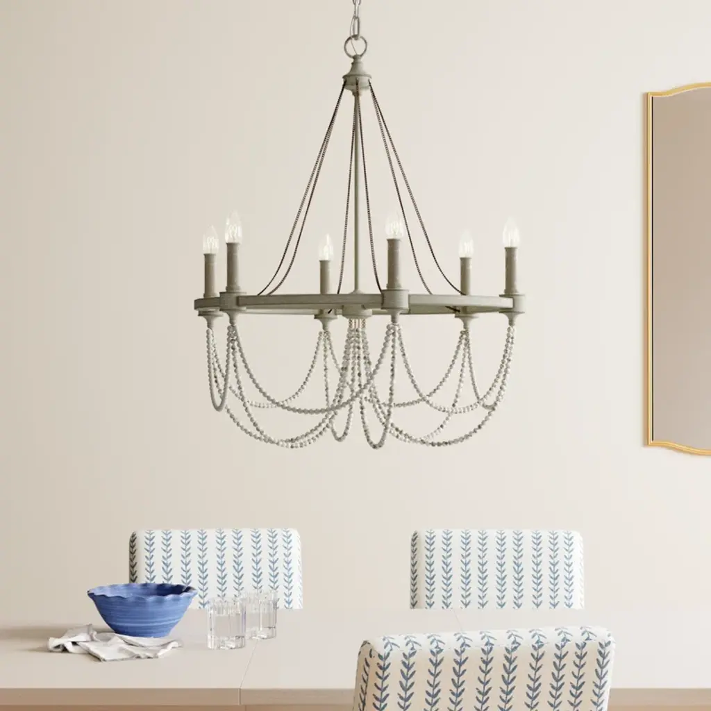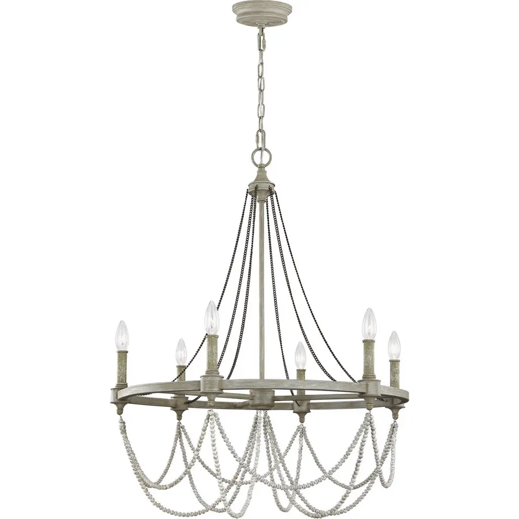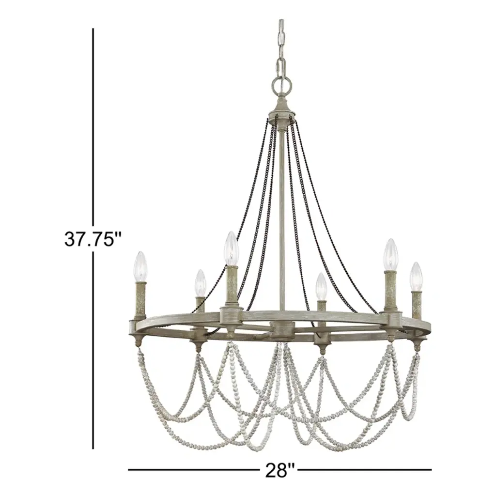 This 6-light wagon wheel chandelier brings just the right amount of farmhouse style (and light) to your entryway or dining room. Its slim downrod and spoked wheel have a French washed oak finish that looks like wood for a rustic touch. Six matching candle holders surround the center, and accommodate 60W bulbs, which are sold separately. This chandelier features draped chain details up top, which are mirrored by swaths of beaded ropes that hang down below from the candle holders. Something to keep in mind: Assembly is required for this chandelier.
