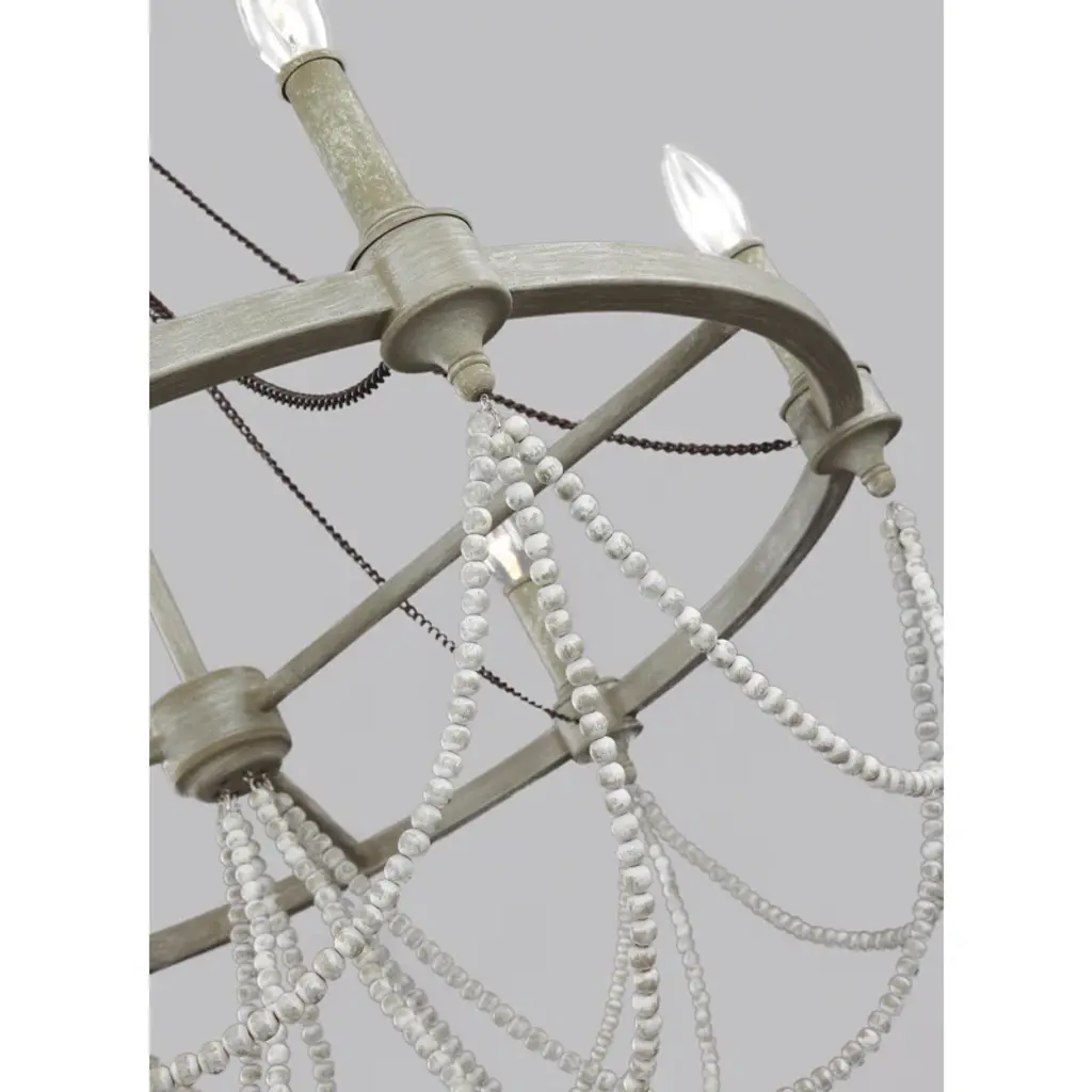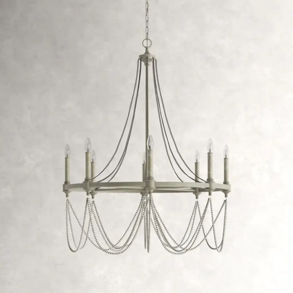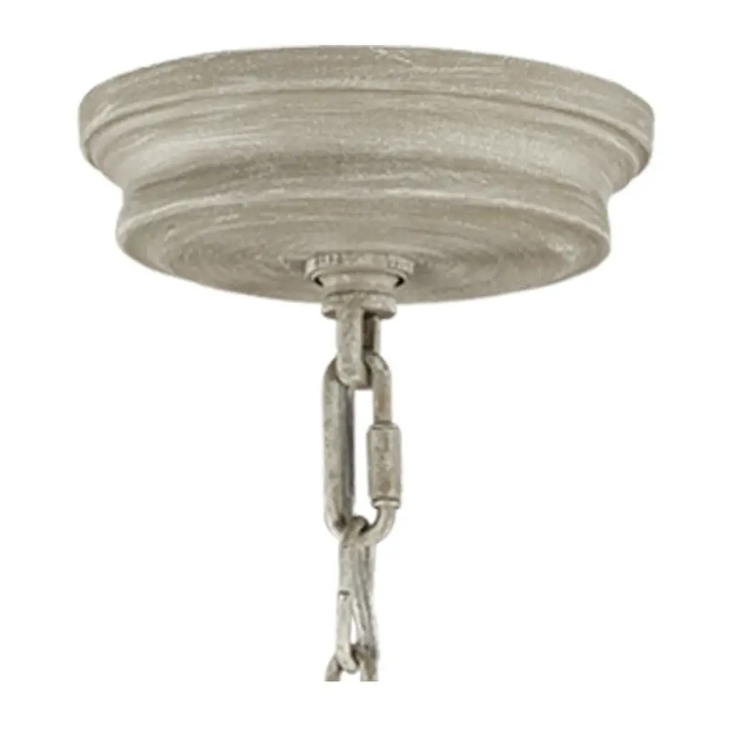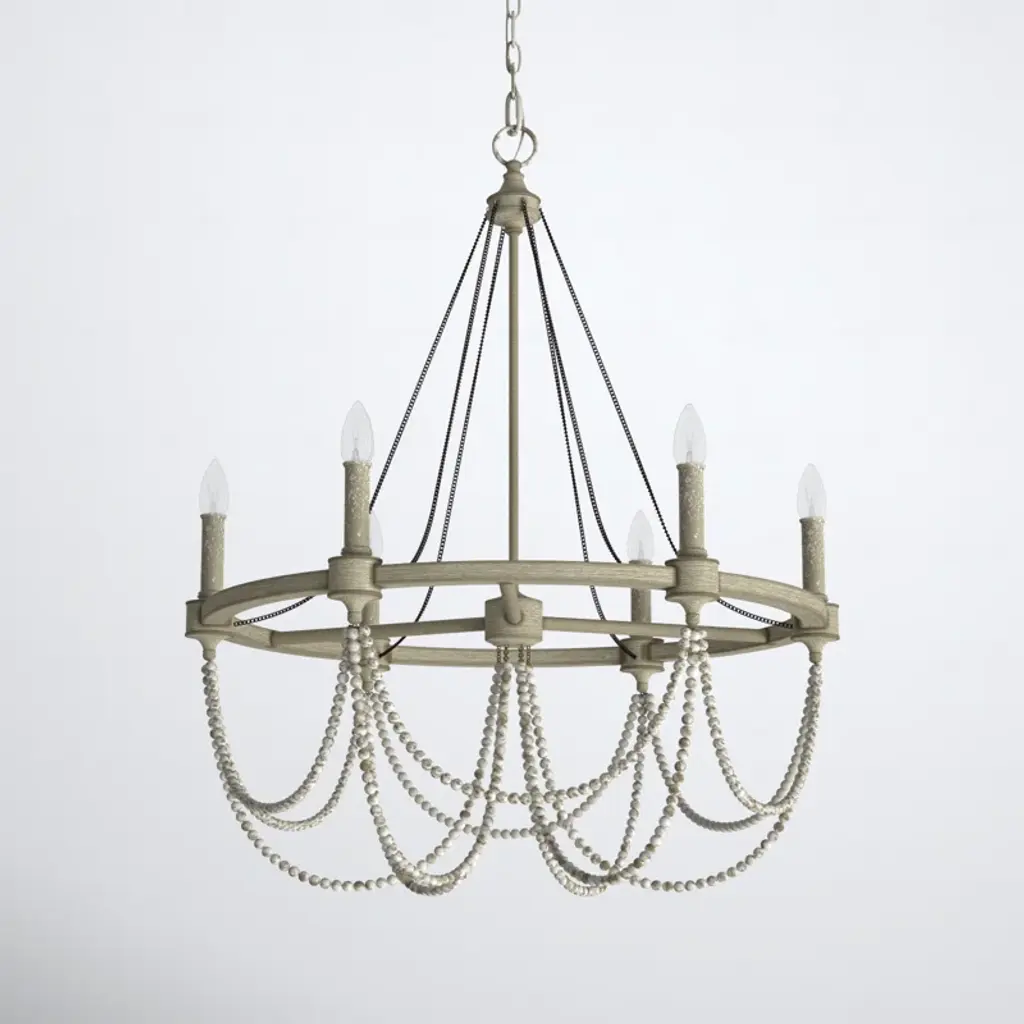 This 6-light wagon wheel chandelier brings just the right amount of farmhouse style (and light) to your entryway or dining room. Its slim downrod and spoked wheel have a French washed oak finish that looks like wood for a rustic touch. Six matching candle holders surround the center, and accommodate 60W bulbs, which are sold separately. This chandelier features draped chain details up top, which are mirrored by swaths of beaded ropes that hang down below from the candle holders. Something to keep in mind: Assembly is required for this chandelier.