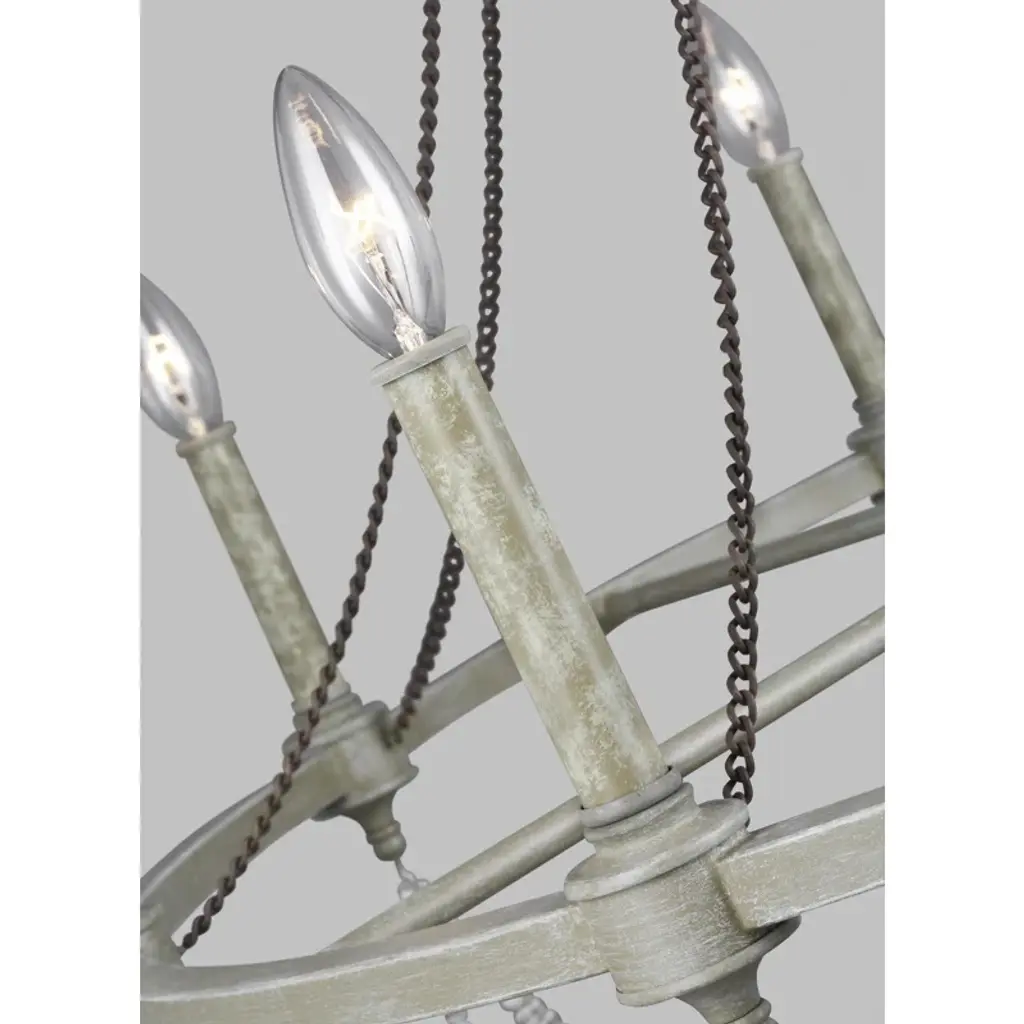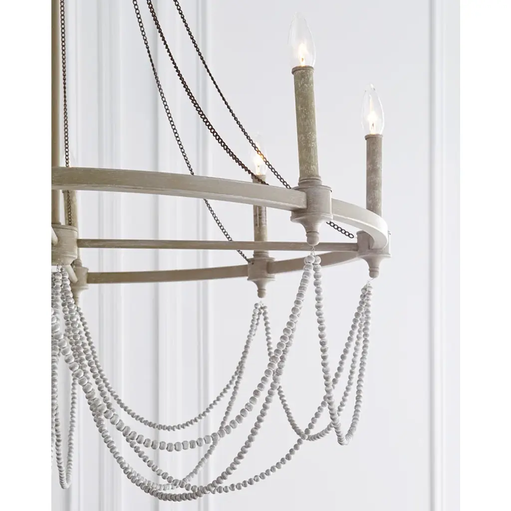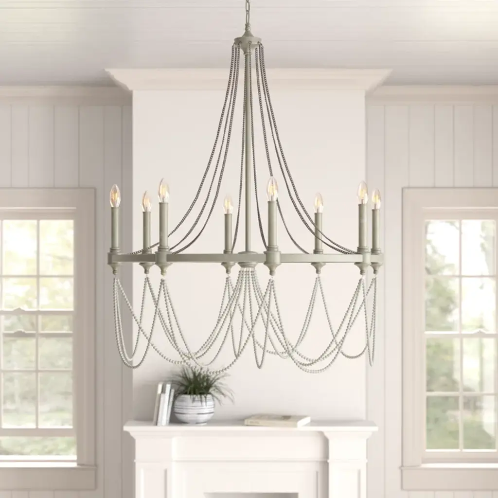 This empire chandelier turns on the farmhouse charm with the help of an airy, open frame and rugged materials. It's crafted from metal in a distressed white finish, with dark metal chains and strings of whitewashed beads slung casually off the frame. This 8-light chandelier takes 60W candelabra bulbs (sold separately), so be sure to pick some up. Plus, it's dimmable, so you can set an inviting ambience for dinnertime in your dining room. This chandelier swings from an adjustable chain with a sloped ceiling adapter, so you can choose just the right height.