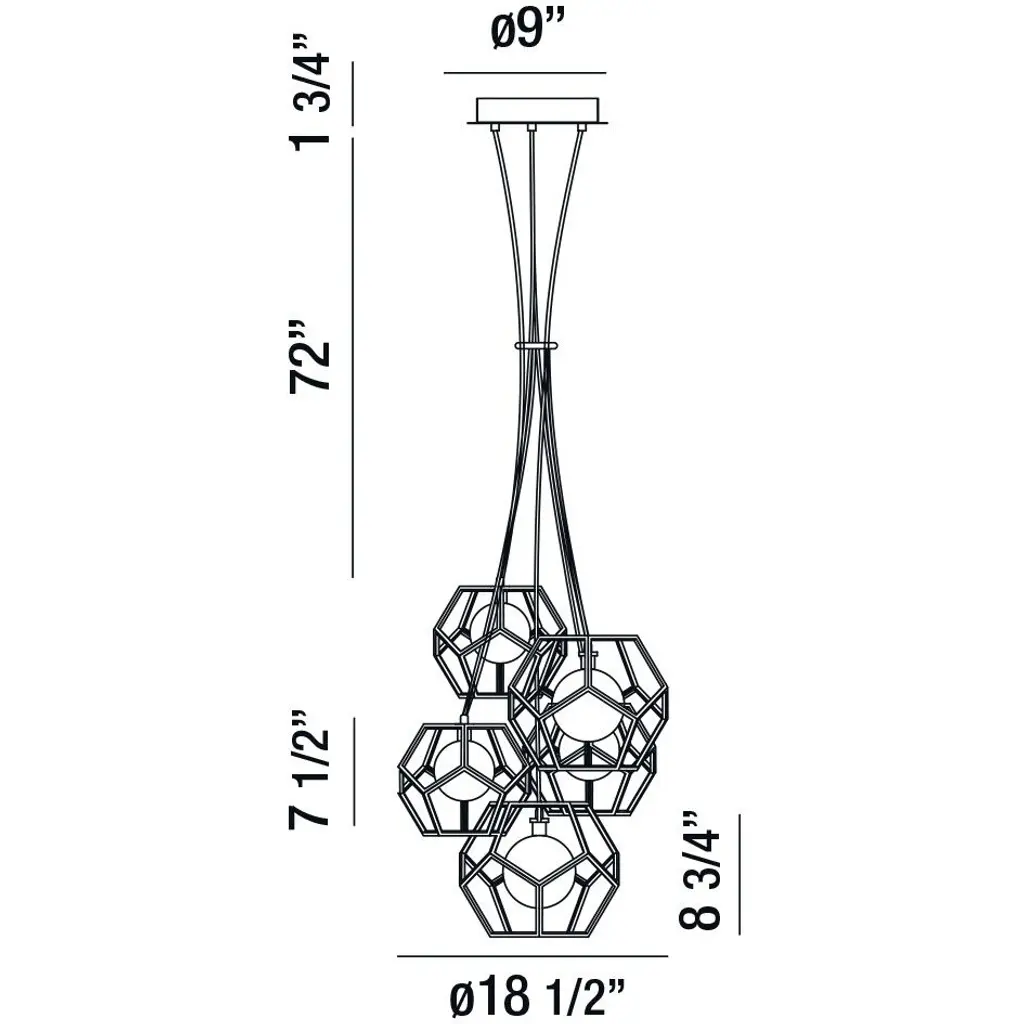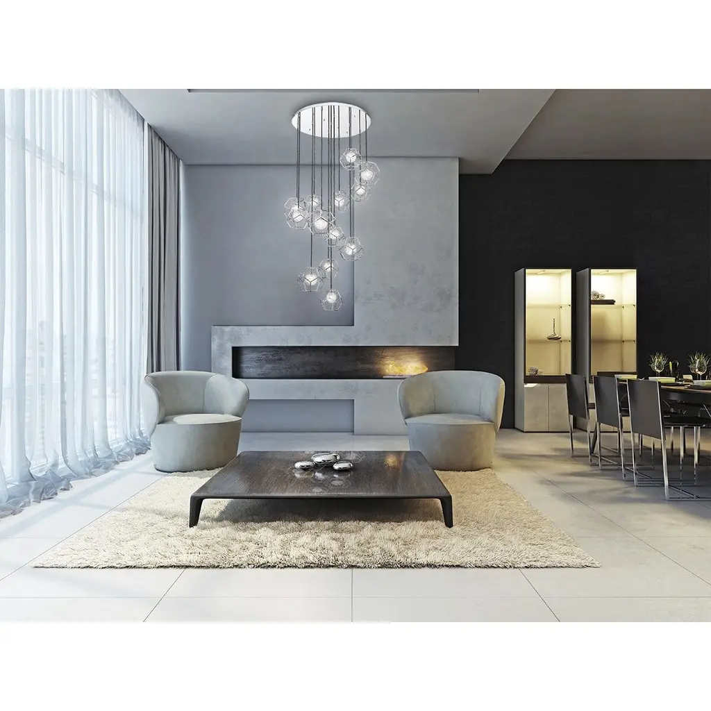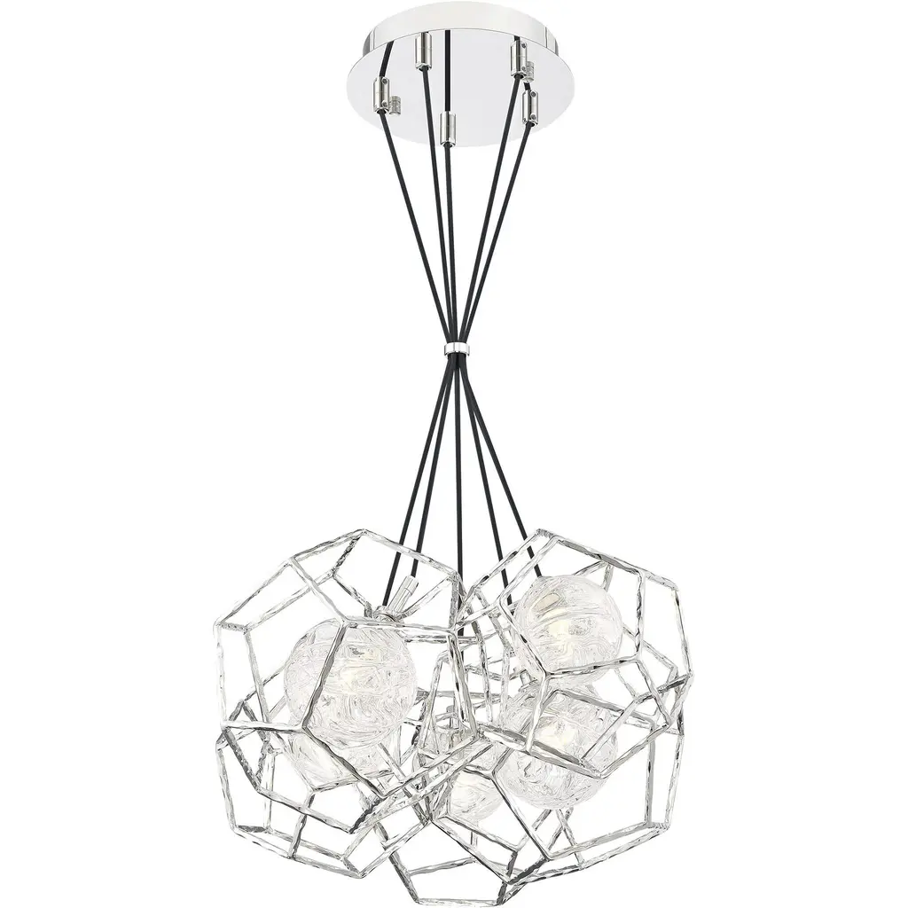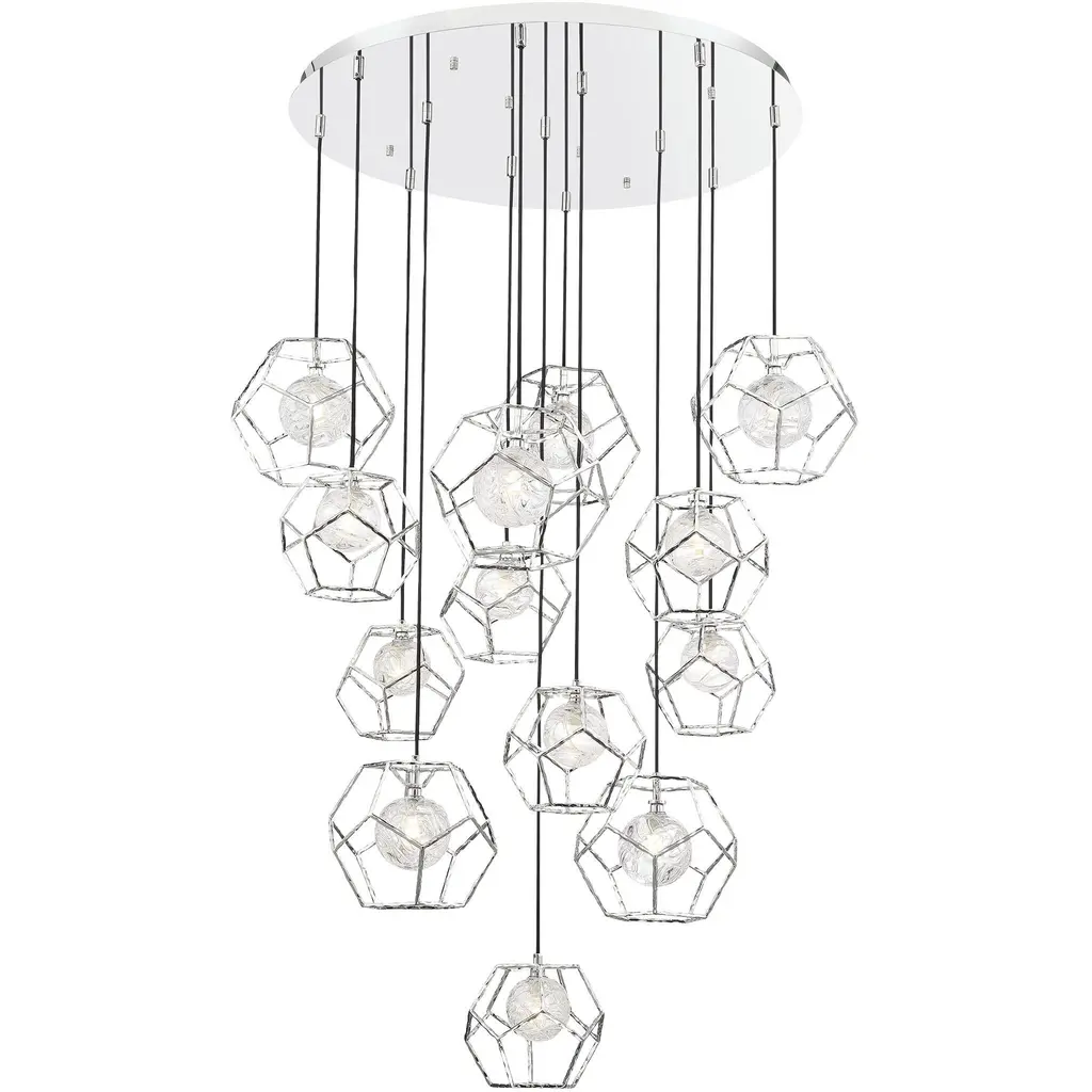 A handmade hexagonal cage suspends an ice glass feature within. Despite the webbing of the chrome cage, the open-framework adds a lightness and atmospheric quality. This contemporary piece is sure to attract attention.