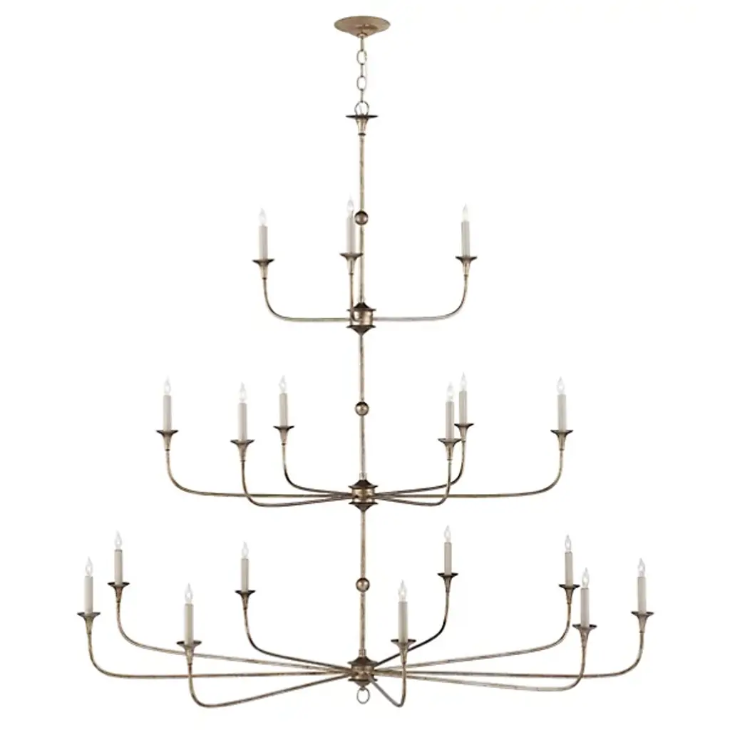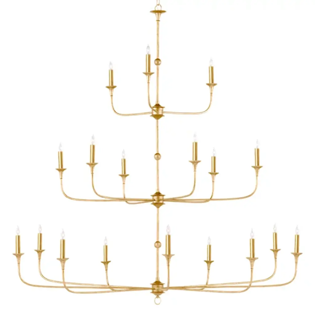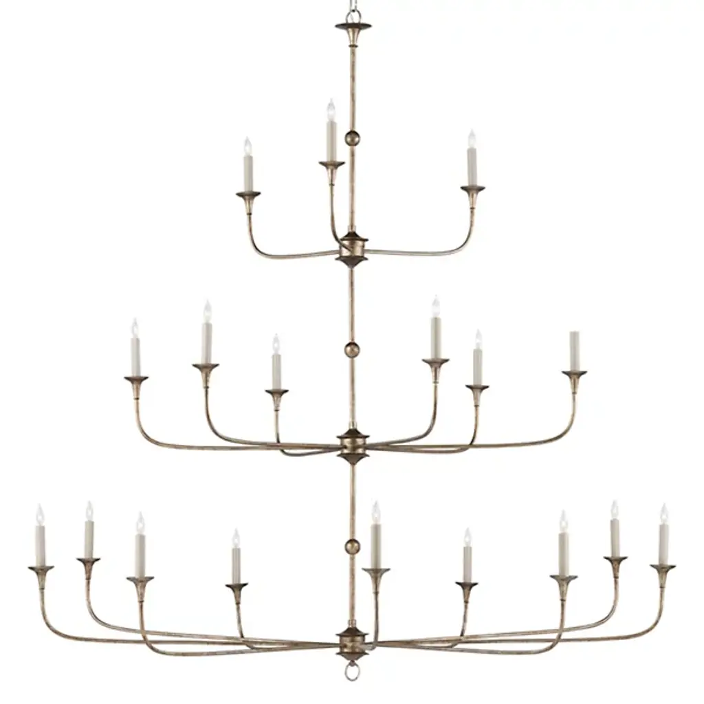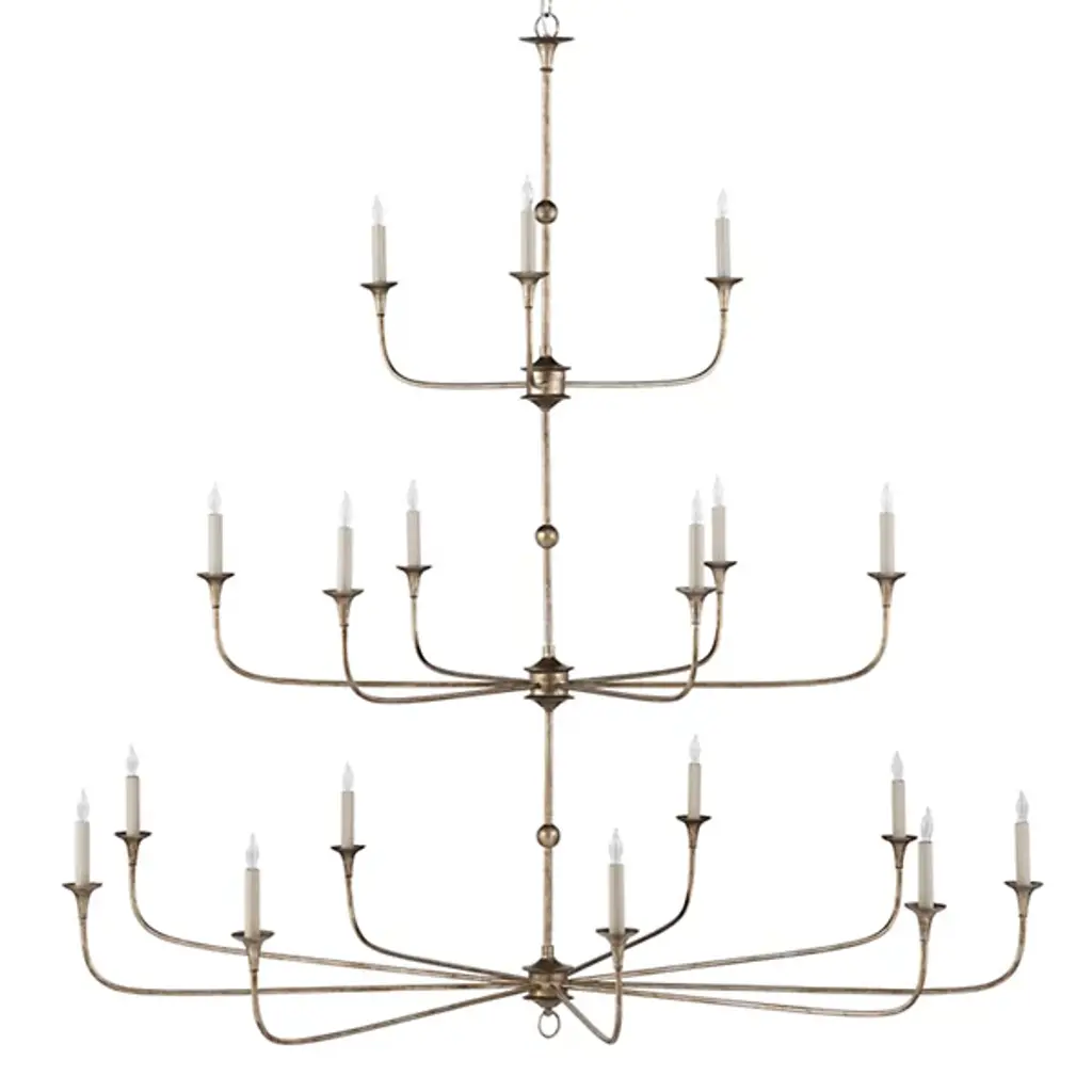 The Nottaway Grande Chandelier from Currey & Company is an exquisite chandelier that offers a captivating candlelight-style illumination, creating a warm and inviting atmosphere. The transitional style is evident in the upward curve of the framework, adding an artful touch to your space. Crafted from durable wrought iron, Nottaway is sturdily made, providing longevity and style. With 3 tiers, your chandelier makes a visual impact. Illuminated by efficient candelabra base LEDs, it provides charm and functionality.