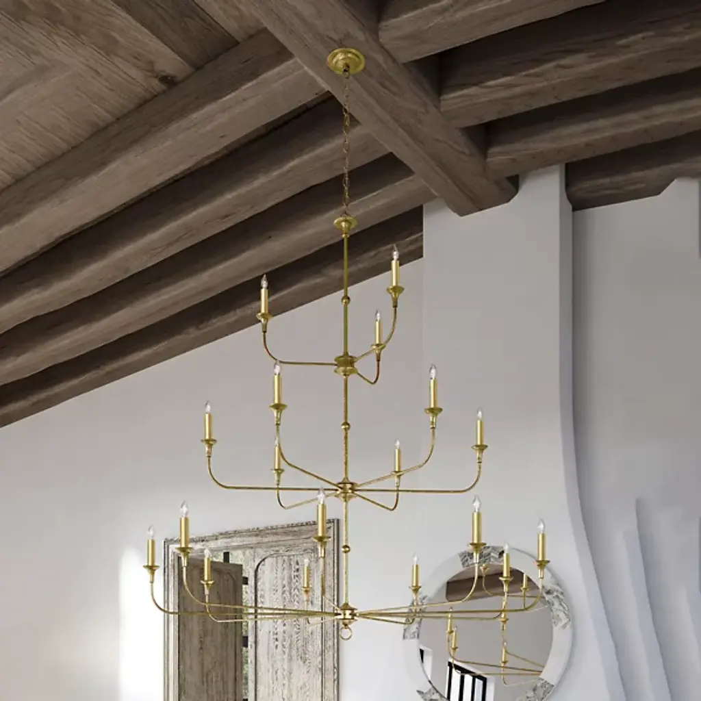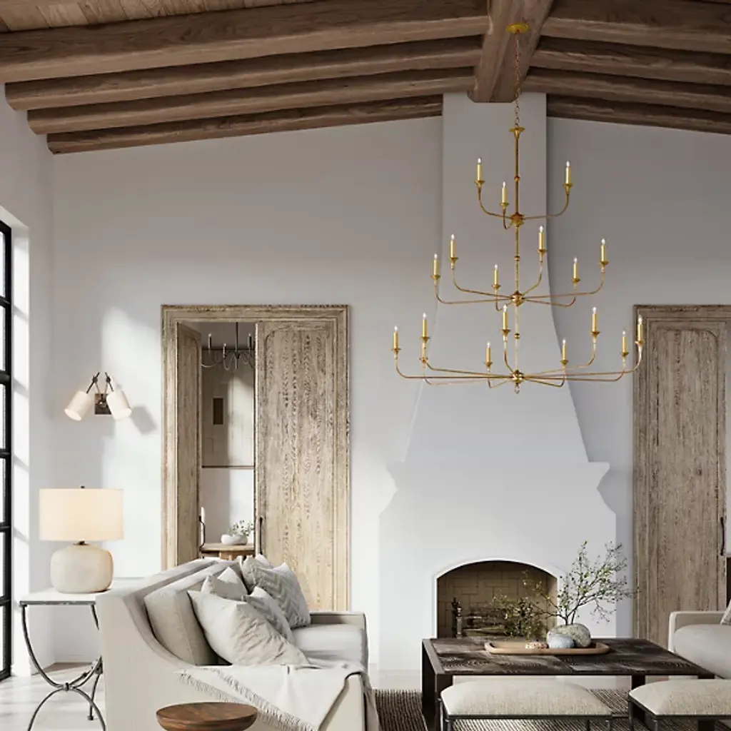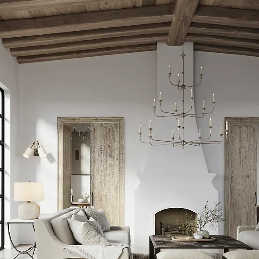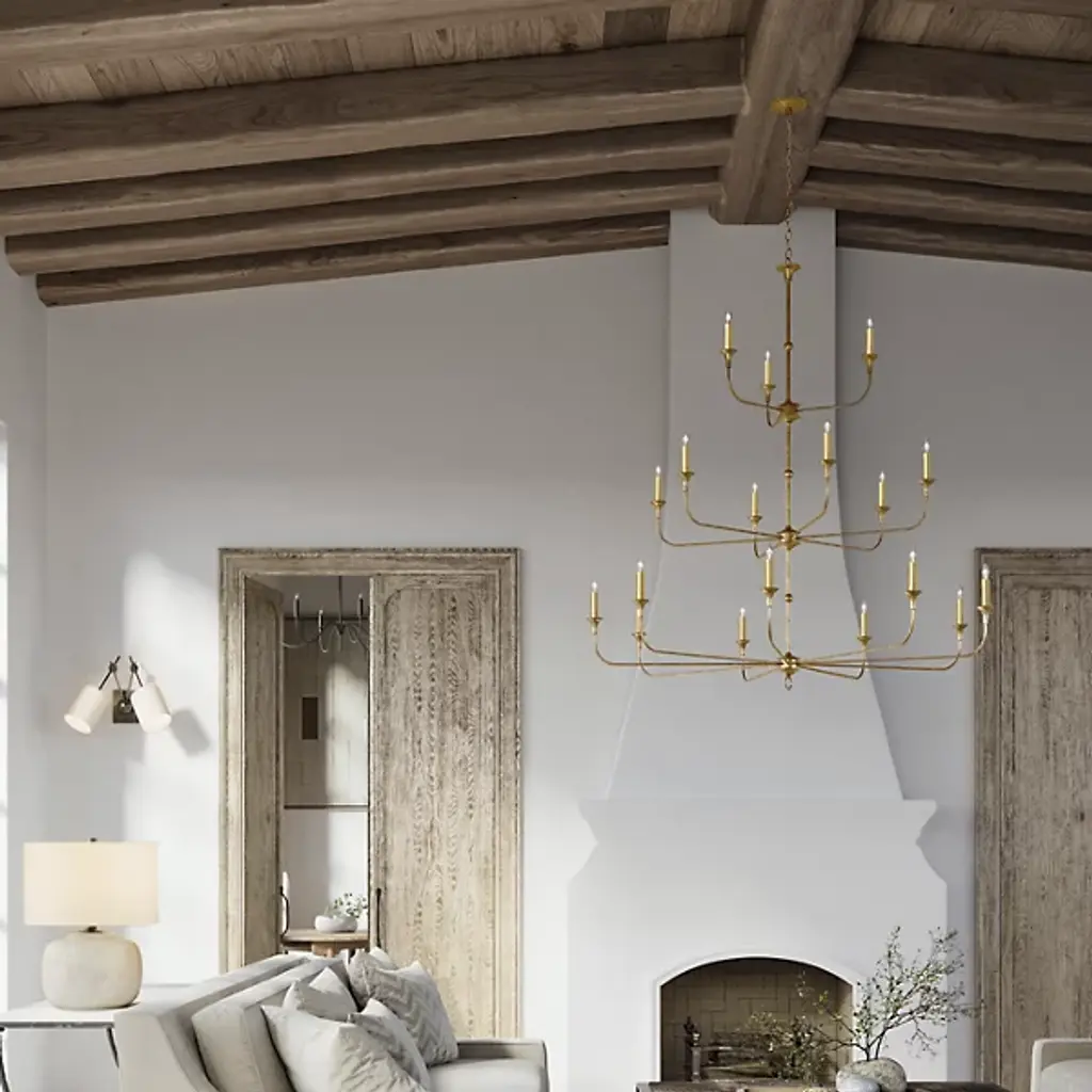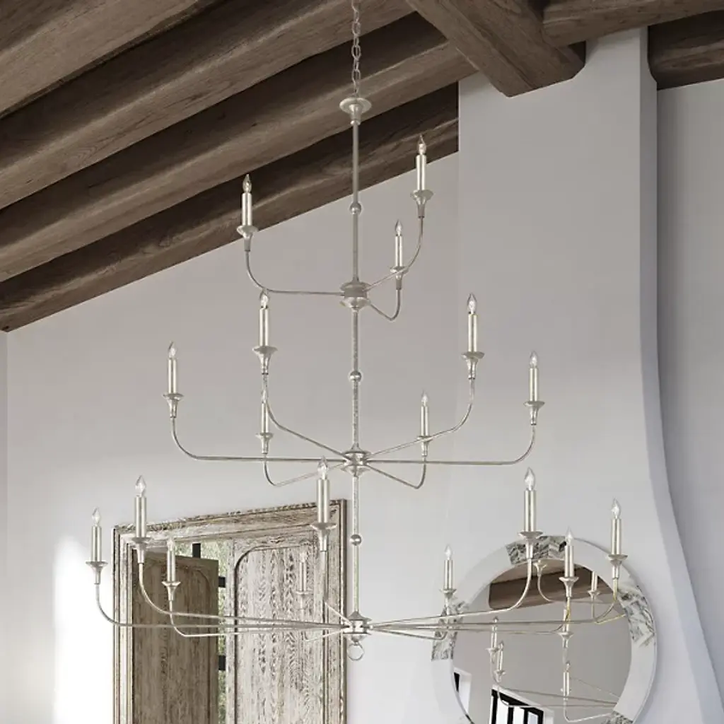 The Nottaway Grande Chandelier from Currey & Company is an exquisite chandelier that offers a captivating candlelight-style illumination, creating a warm and inviting atmosphere. The transitional style is evident in the upward curve of the framework, adding an artful touch to your space. Crafted from durable wrought iron, Nottaway is sturdily made, providing longevity and style. With 3 tiers, your chandelier makes a visual impact. Illuminated by efficient candelabra base LEDs, it provides charm and functionality.