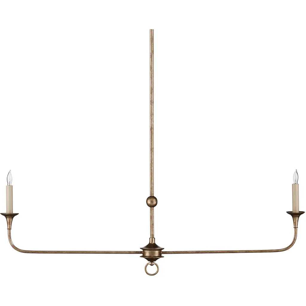 Design notes on the Nottaway Linear Bronze Chandelier include long arms that stretch gracefully from a small cog and a ring that ornaments its bottom-most point. The profile of the fixture has a lovely fluidity to it, and the Pyrite bronze finish adds textural interest to the bronze chandelier. The fact that the chandelier is hung from a rod rather than a chain modernizes this design, though it is still decidedly in the traditional design vernacular. Its shape makes it perfect for above kitchen islands and bars. Adjustable from 23.25" to 65.25" with use of included chain/rod kit/cable. If your space calls for a longer drop, additional chain/rods/cable is available for purchase.