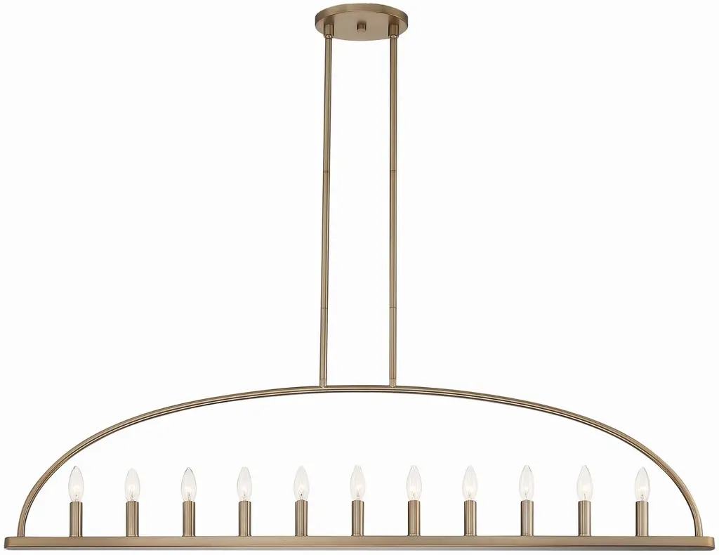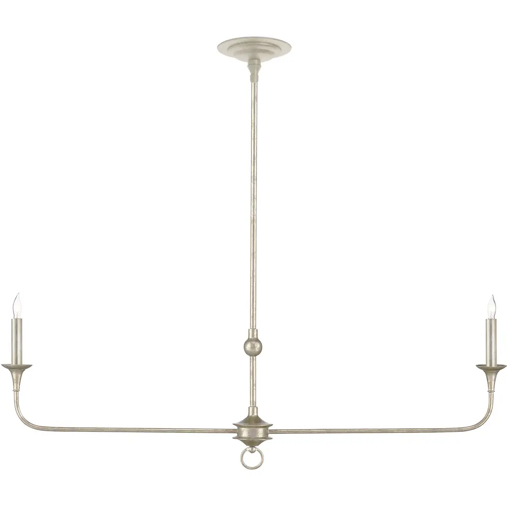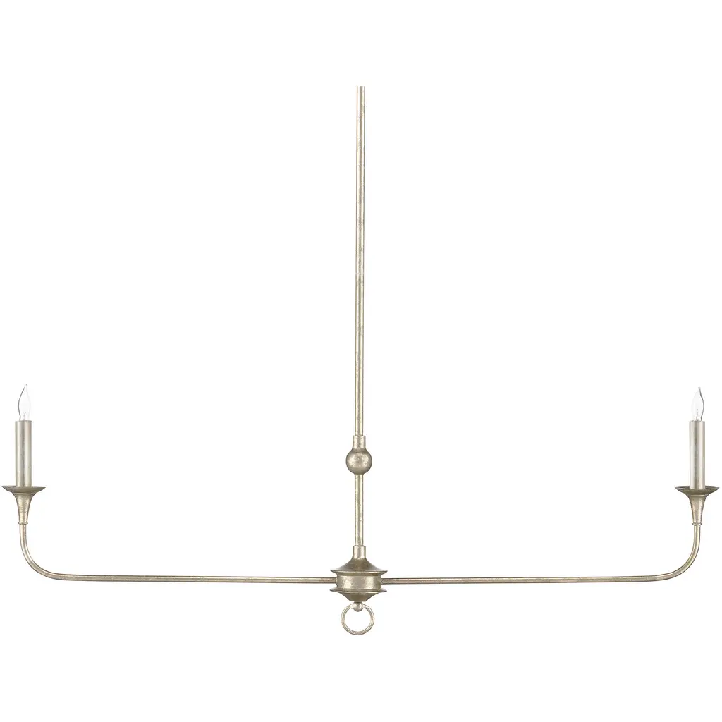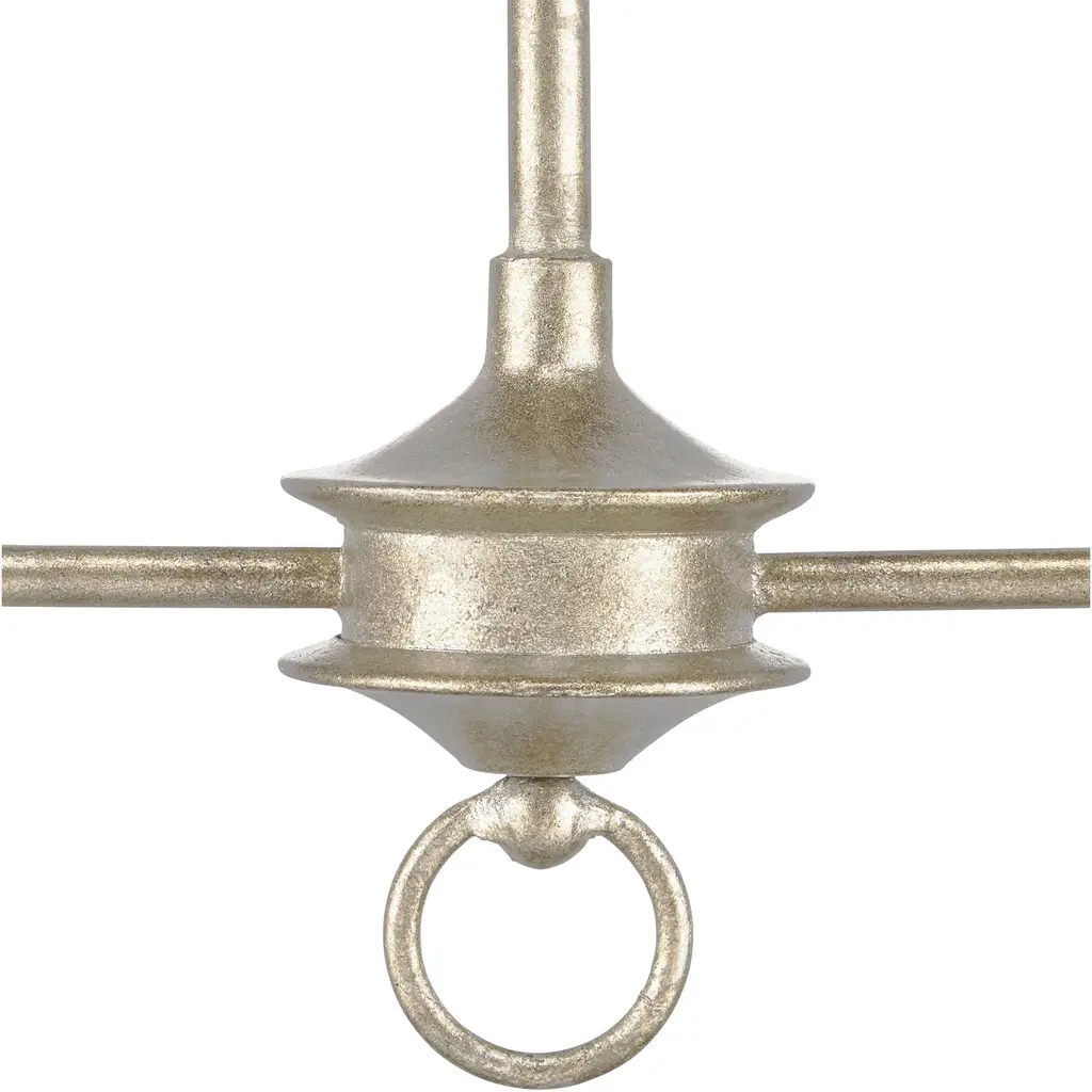 The Nottaway Linear Champagne Chandelier features slender arms that extend with subtle curves from a petite cog positioned at the bottom of its elongated stem. A delicate ring detail adds a refined touch to the lower tier. Finished in a soft champagne silver, the chandeliers shape make it especially suited for hanging above kitchen islands and bars or above long dining room tables. Adjustable from 23.25" to 65.25" with use of included chain/rod kit/cable. If your space calls for a longer drop, additional chain/rods/cable is available for purchase.