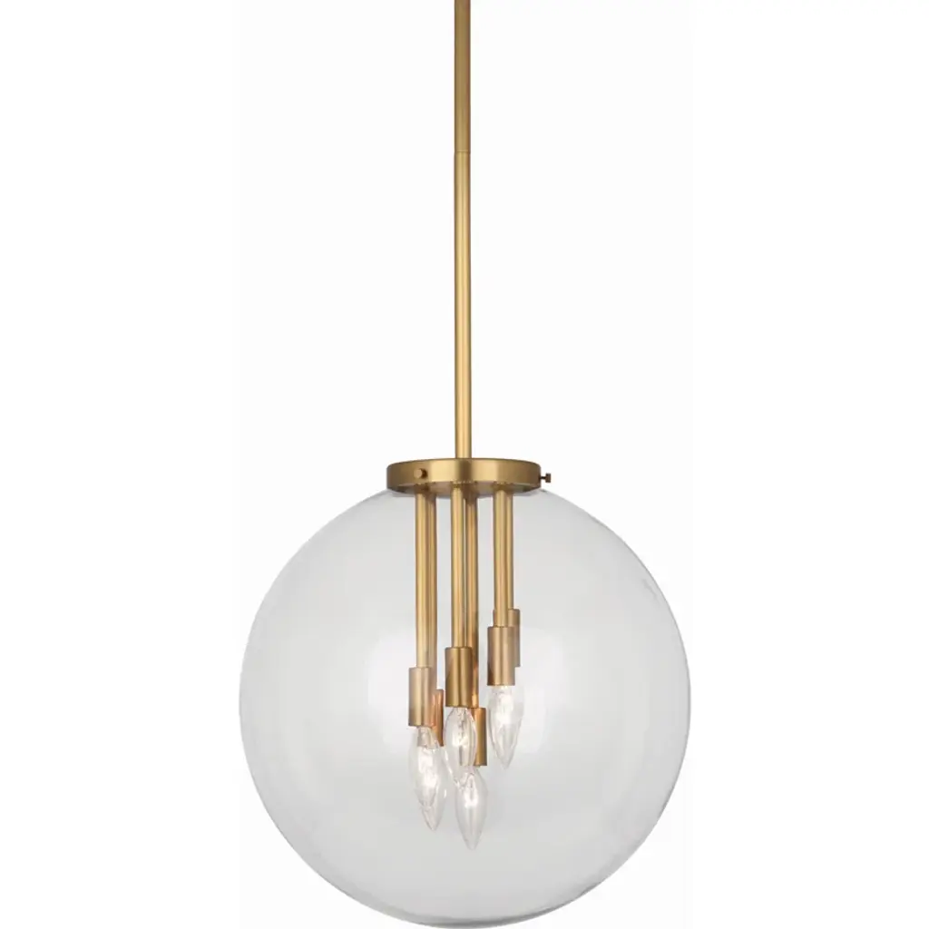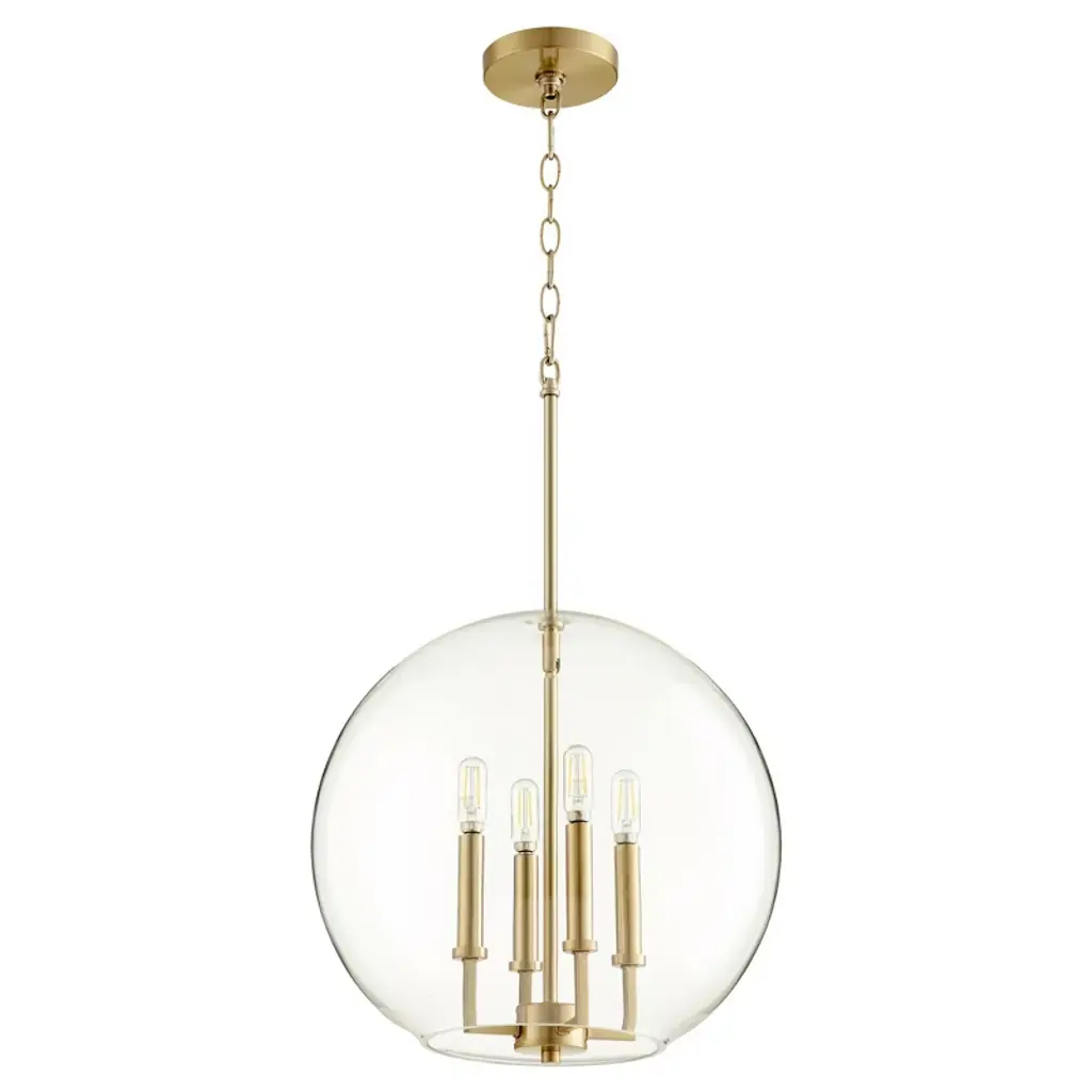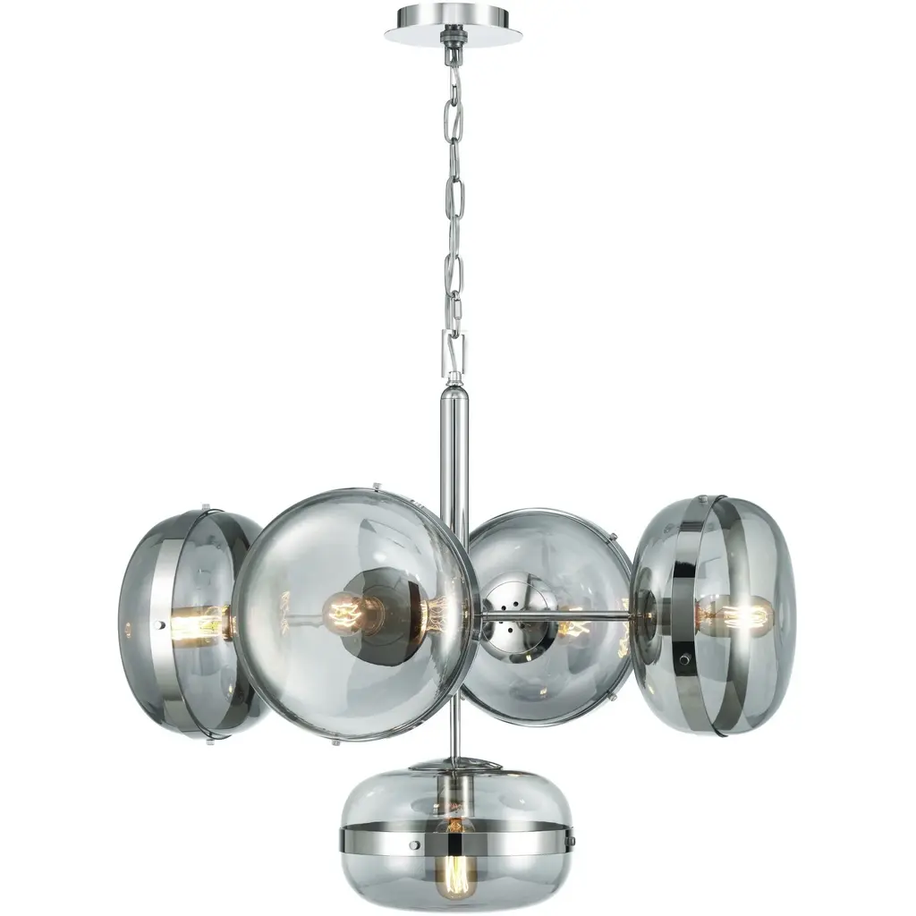 A band encircles each glass orb that beautifully reflects a warm glow from the vintage lights within. The metal support creates an inviting counterpoint to the austere design