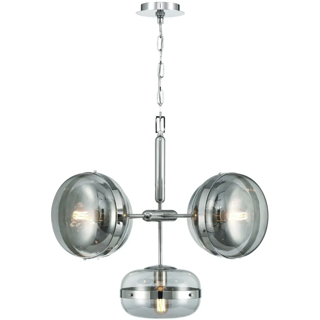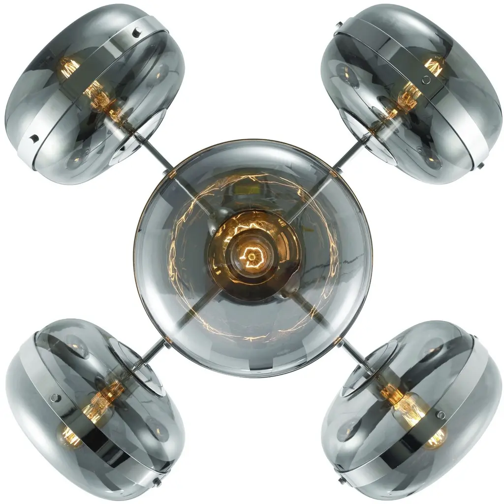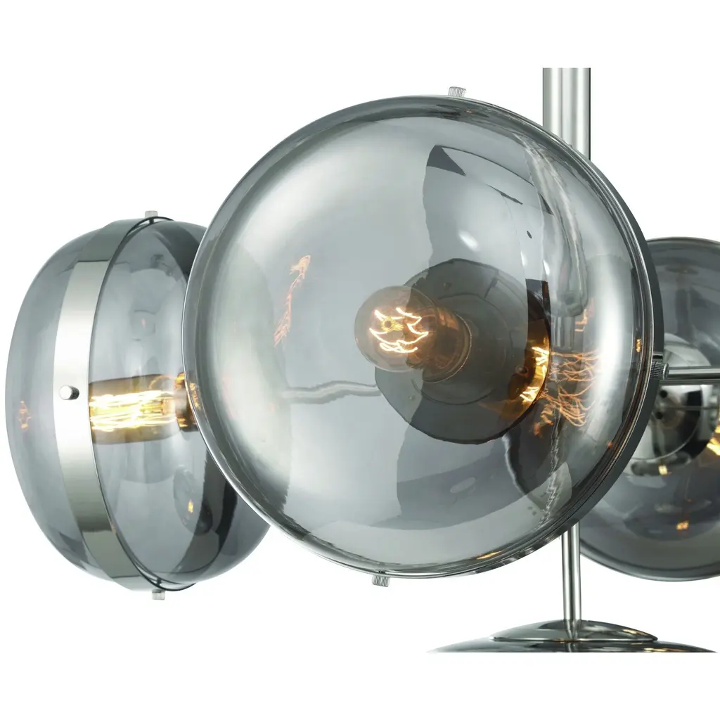 A band encircles each glass orb that beautifully reflects a warm glow from the vintage lights within. The metal support creates an inviting counterpoint to the austere design