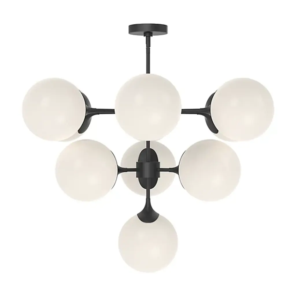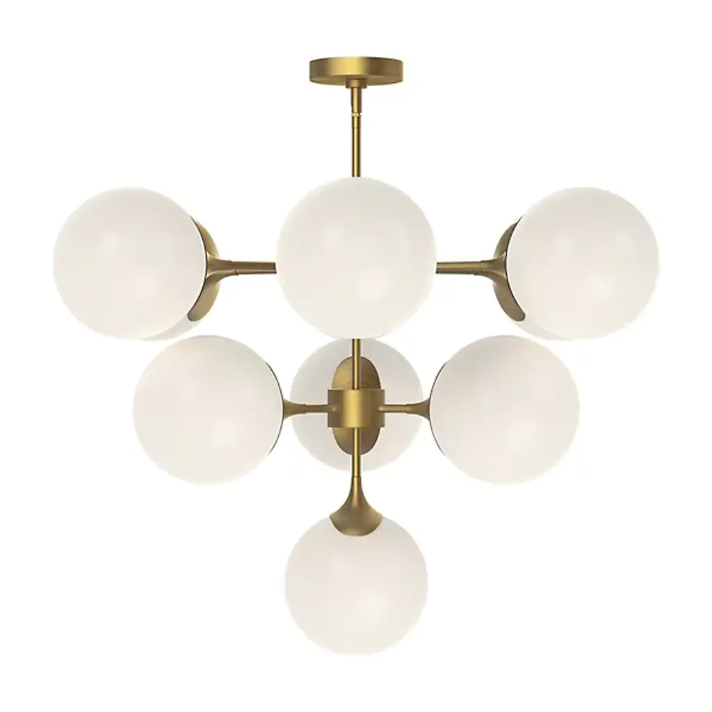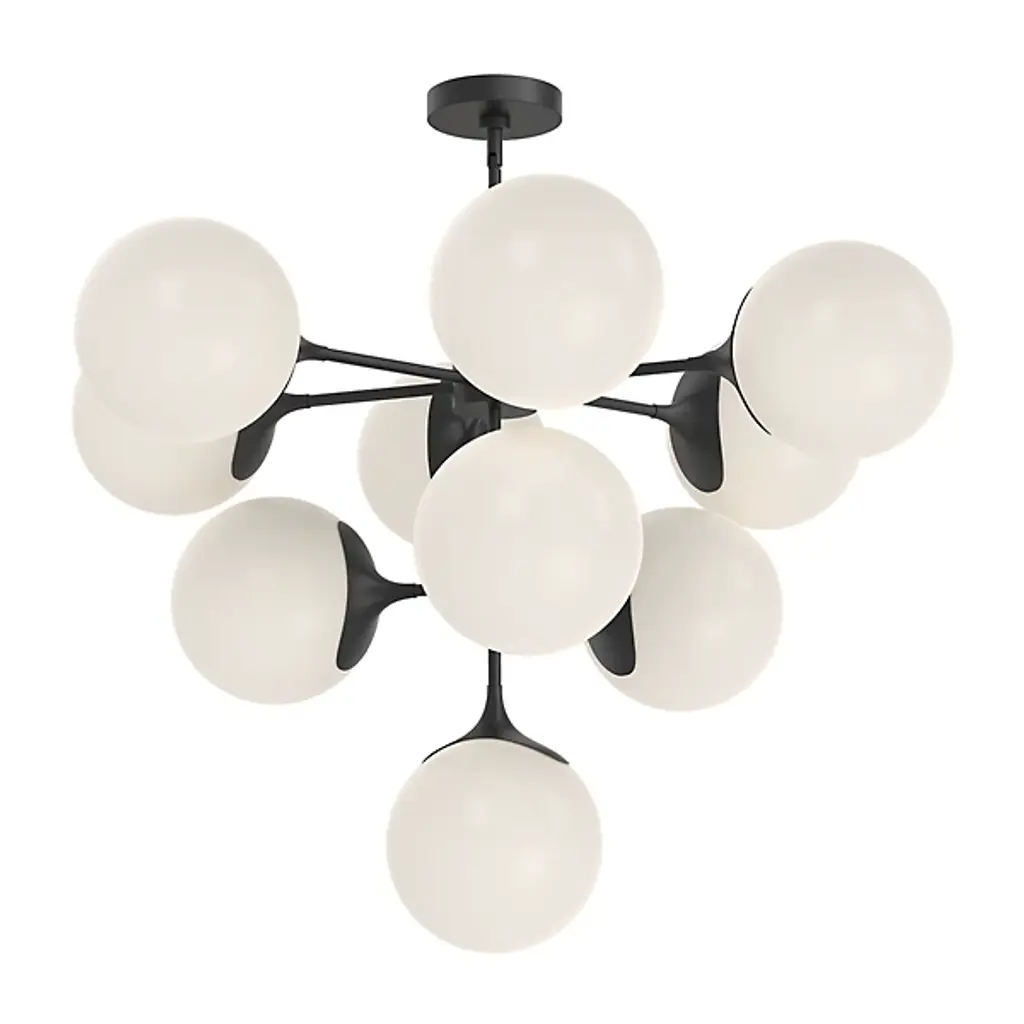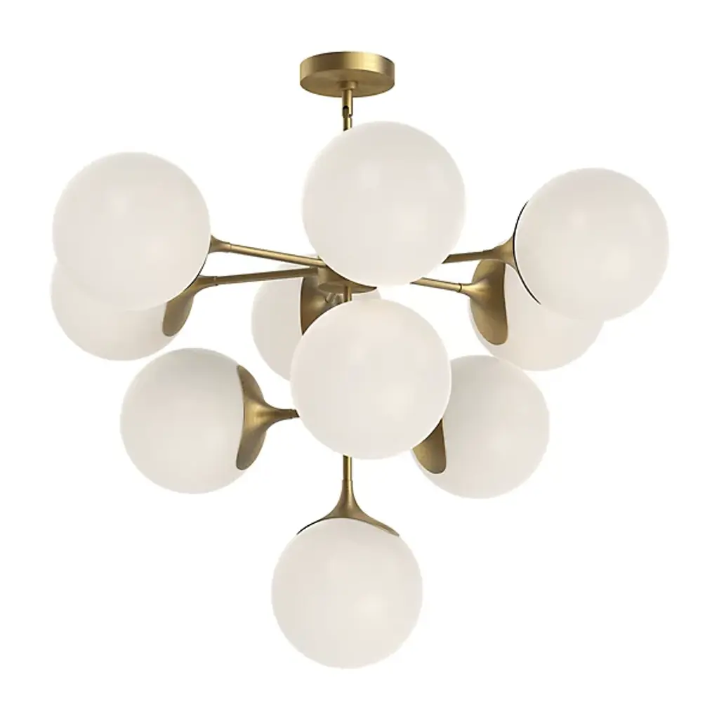 The Nouveau Chandelier from Alora Mood invigorates the room with repeating shapes and curves drawn from the early 20th century’s Art Nouveau style. The chandelier’s simple yet familiar shapes make a great addition to contemporary or throwback spaces. It enters the room like a grapevine with a tiered metal structure of smooth, tapering arms. While holding the shades, the arms prove important in adding dashes of elegant color contrast. Glass globes pop visually all around with an opaque surface that’s simply flawless. The multi-directional quality of the globes translates to a soft, surrounding aura of light free of glare.