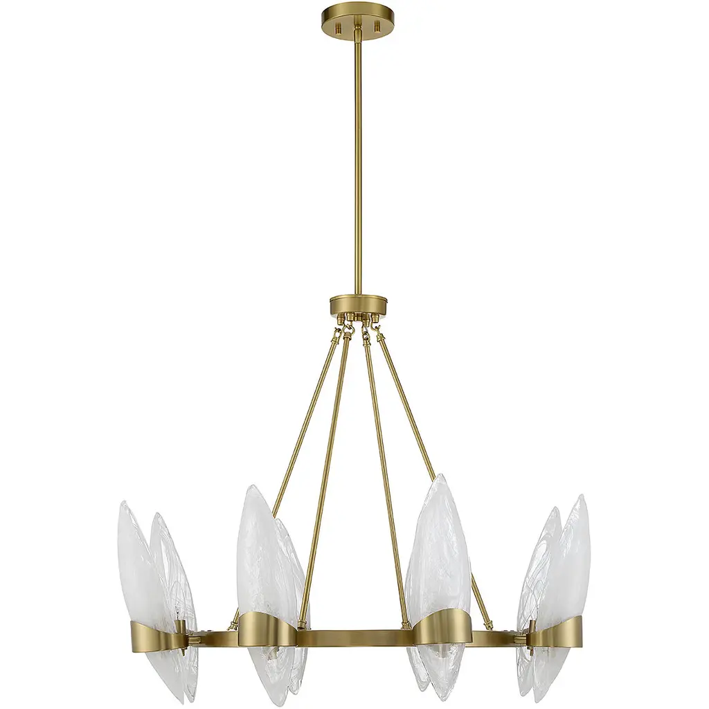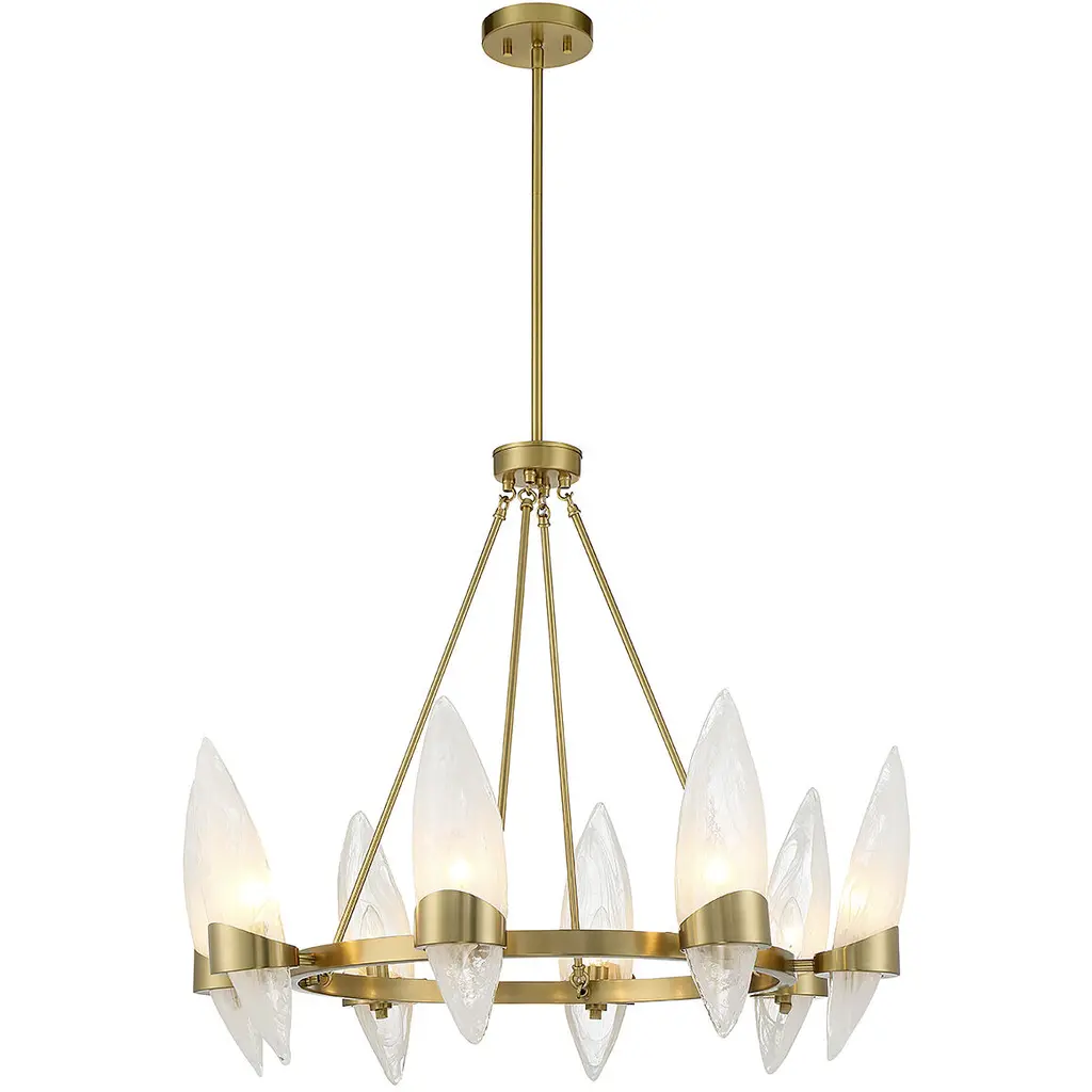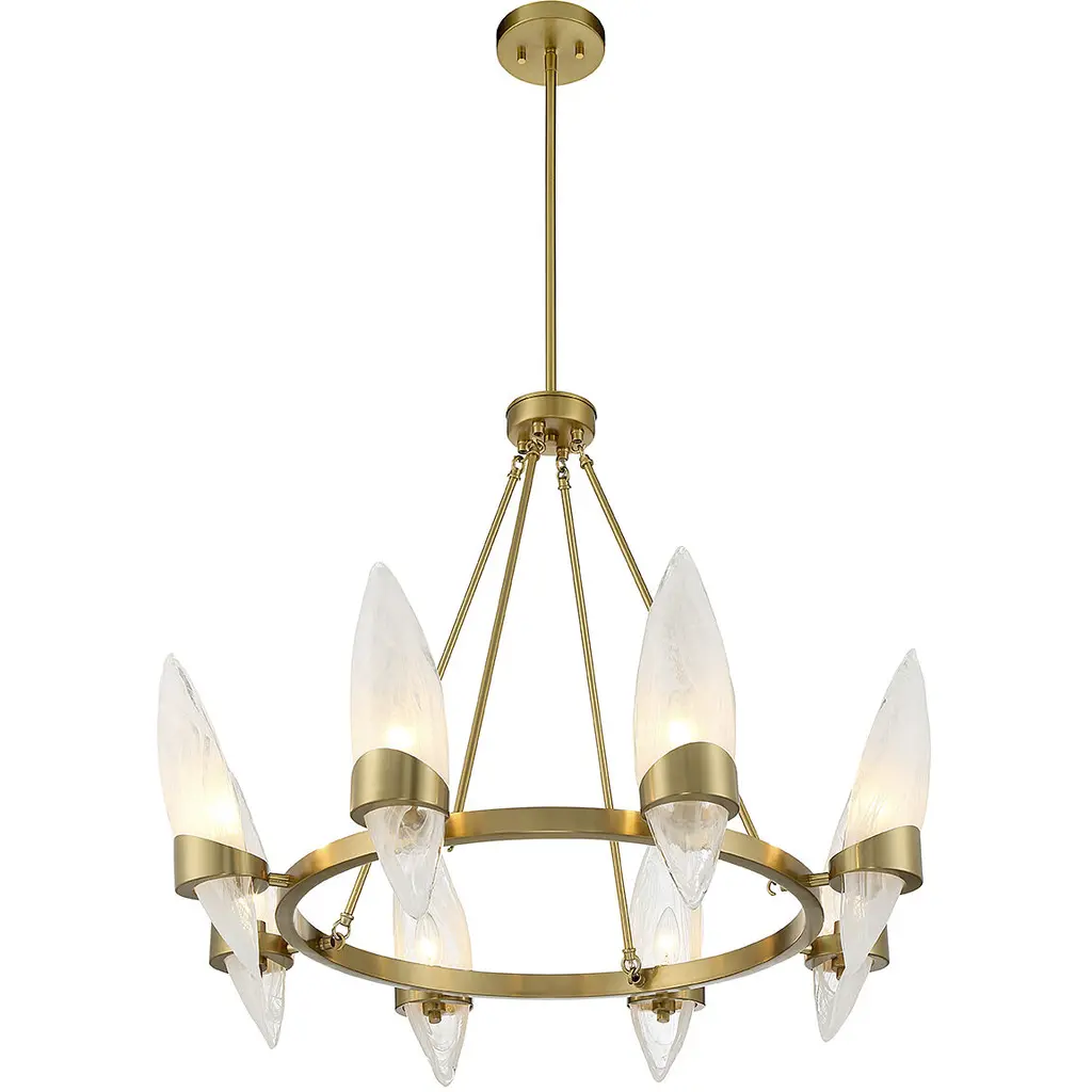 With its petals of handmade strie glass and warm brass finish, the Savoy House Nouvel 8-light chandelier blossoms like a gorgeous Art Deco-meets-contemporary flower. It will create a stunning focal point in any space. Nouvel is 31" in diameter and has an adjustable height ranging from 27.5" to 81". Comes with four 12" downrods and one 6" downrod. It uses 8 candelabra size bulbs of up to 60 watts per bulb (bulbs not included).