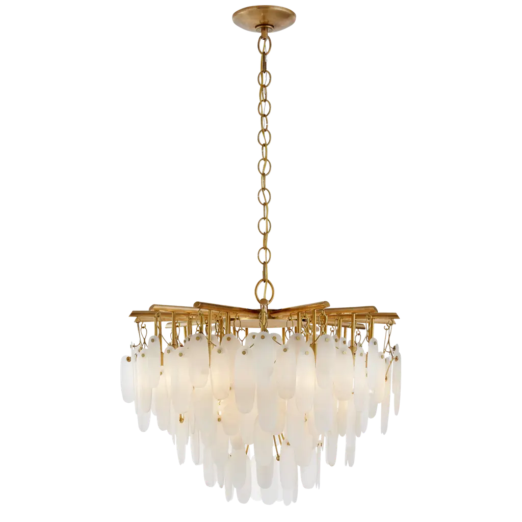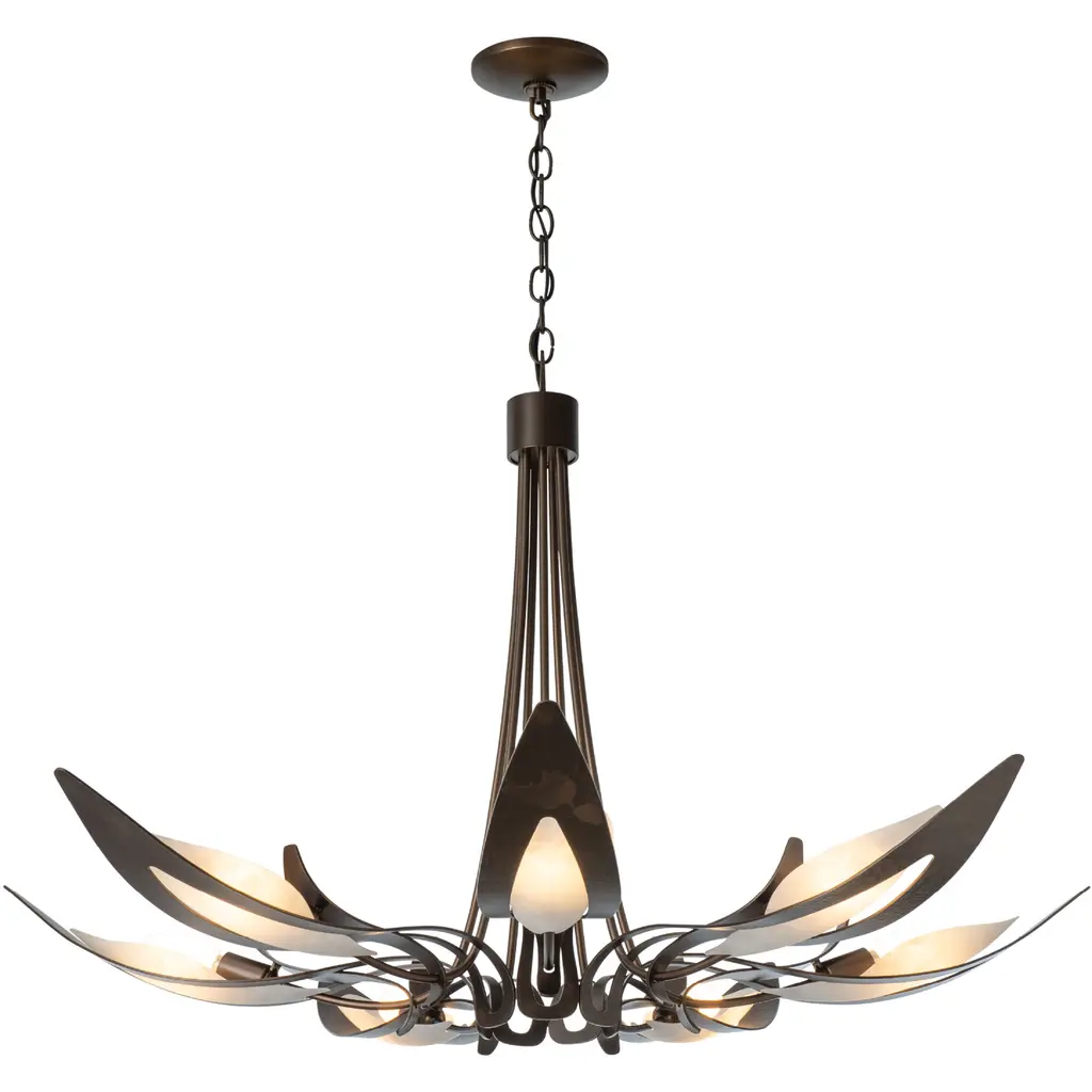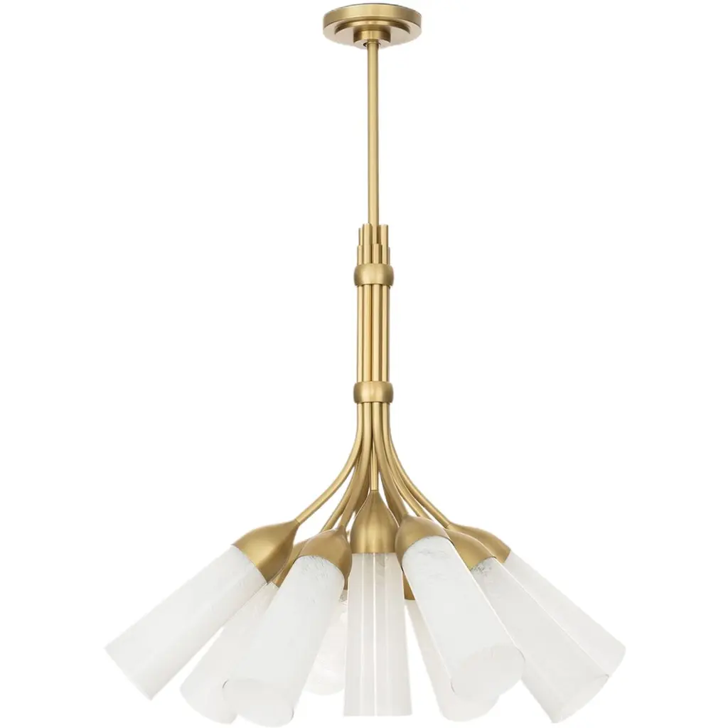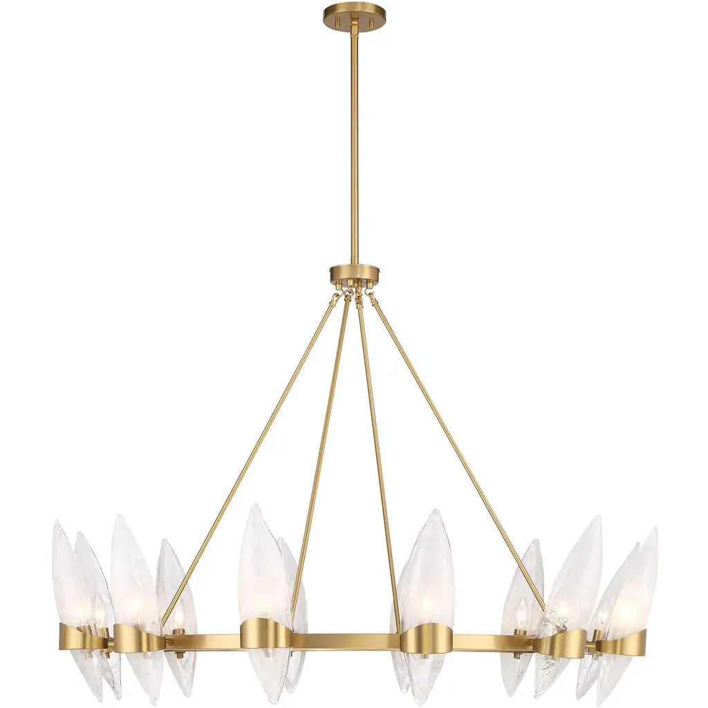 With its petals of handmade strie glass and warm brass finish, the Savoy House Nouvel 8-light chandelier blossoms like a gorgeous Art Deco-meets-contemporary flower. It will create a stunning focal point in any space. Nouvel is 31" in diameter and has an adjustable height ranging from 27.5" to 81". Comes with four 12" downrods and one 6" downrod. It uses 8 candelabra size bulbs of up to 60 watts per bulb (bulbs not included).