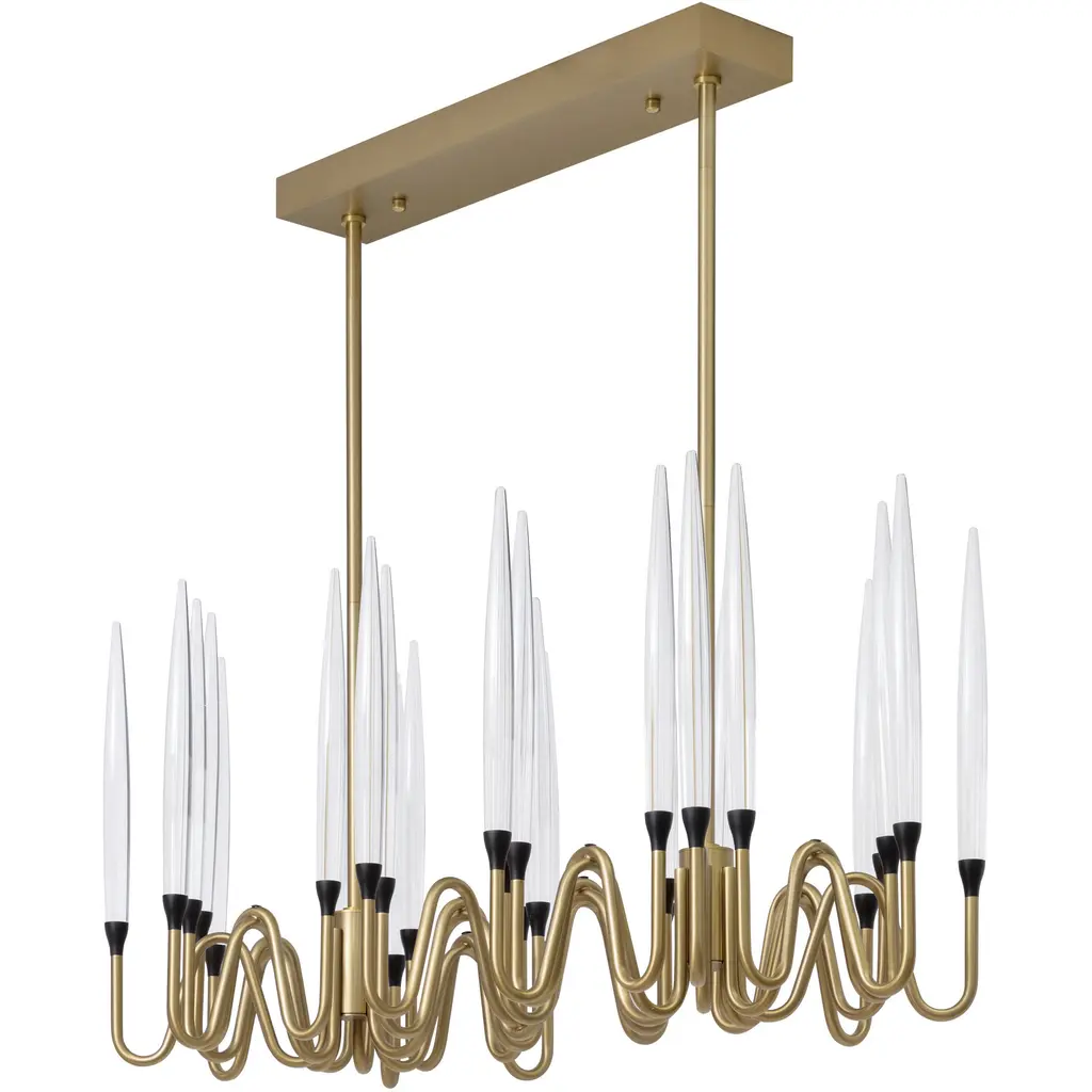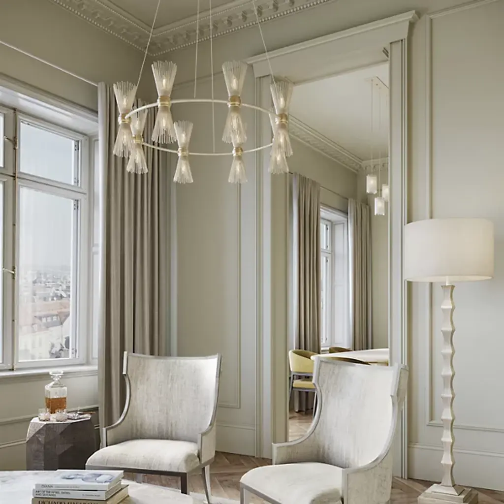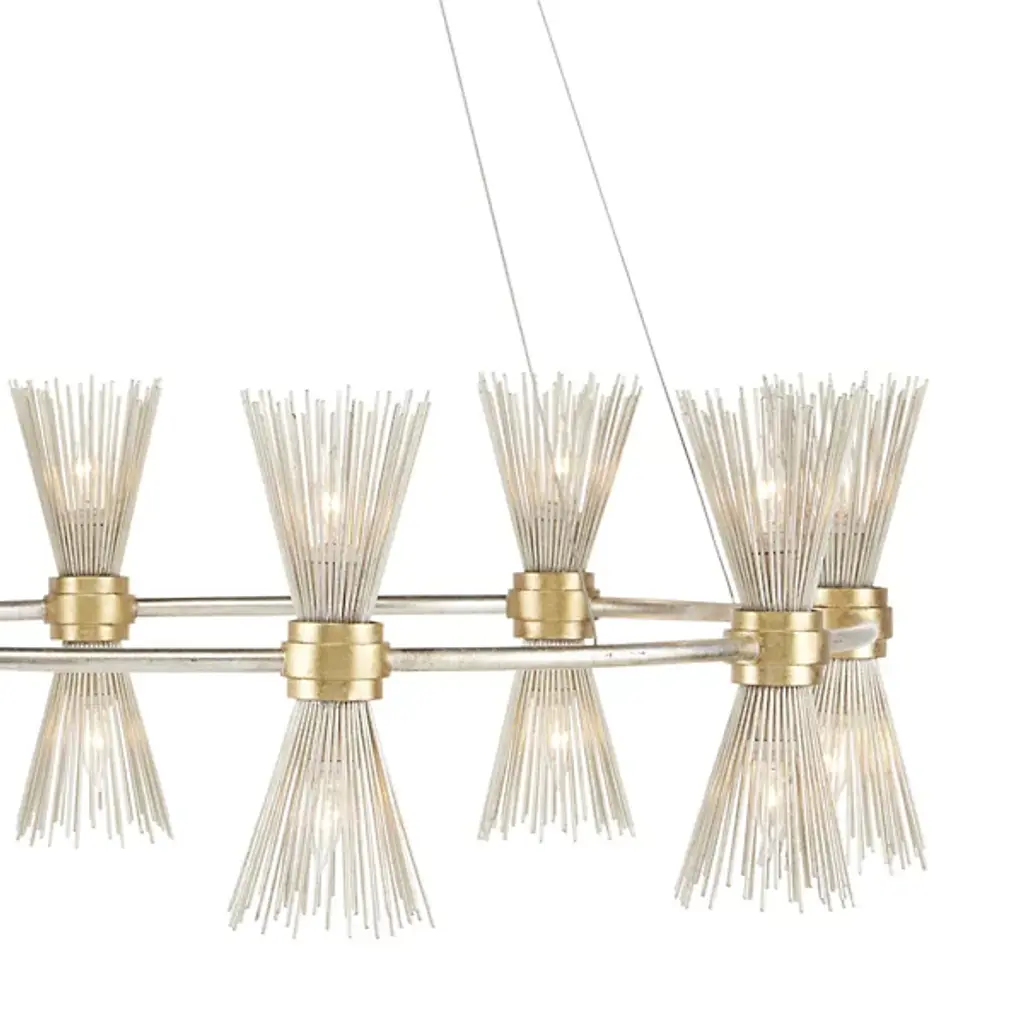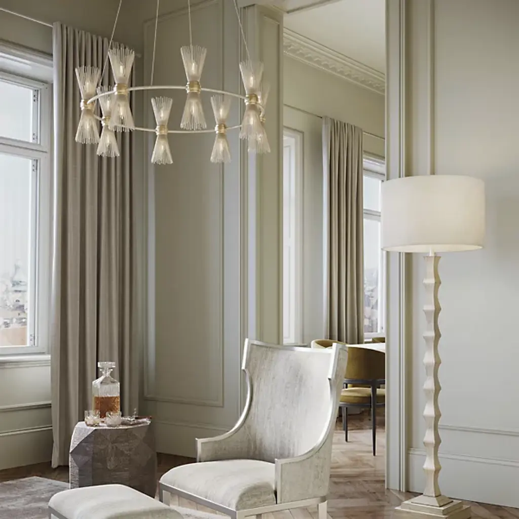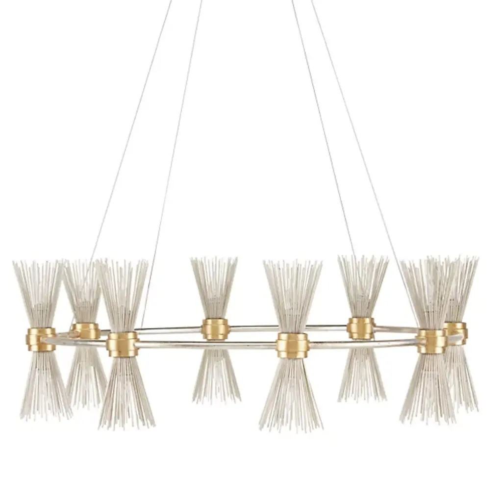 Highlight the intricacy of your interior design plan with the Novatude Chandelier by Currey & Company. A ring of metal is held in midair suspension by attachment to a ceiling canopy. The fine metalwork embodied in the frame’s fluid design creates a distinctive Mid-Century Modern sensibility. Most notable to any onlooker is the Chandelier’s collection of bundled metal stems that are held in place along the surface of the ring. The resulting visual is a bow-like appearance that maintains the tranquil aura of your setting. Incandescent light splays throughout your environment effortlessly from overhead, courtesy of the fixture’s freely hanging orientation.