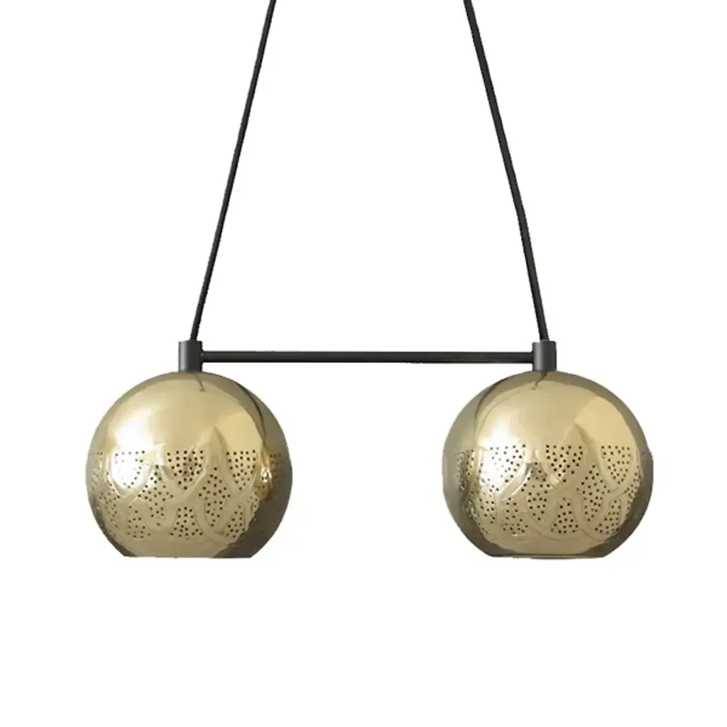 Bring warmth and light to your living spaces with the Nur Reversed Dual Globe Chandelier from Dounia Home. A contemporary construction with traditional accents, each piece of metalwork is locally-sourced and handcrafted by Moroccan artisans. A beveled-edge disc canopy holds two simple woven cables that descend to two metallic globe shades, kept separate by a minimalist metal stem. The globes are cut off at the bottom with a round opening for powerful downlight while geometric patterns and hand-punched pinholes in the sides provide a pleasant, old-style ambiance.