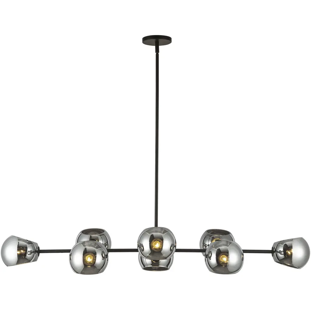 The Nyla chandelier is a modern exploration of form with graphic arms, irregular orb shades, and atmospheric smoke glass. To create the mobile-like silhouette, three carefully balanced arms extend dramatically in space. The slender minimalist frame is made relatable by the soft shaping of the glass. Choose from an Aged Brass finish for a brighter look, or True Bronze for a more industrial effect.