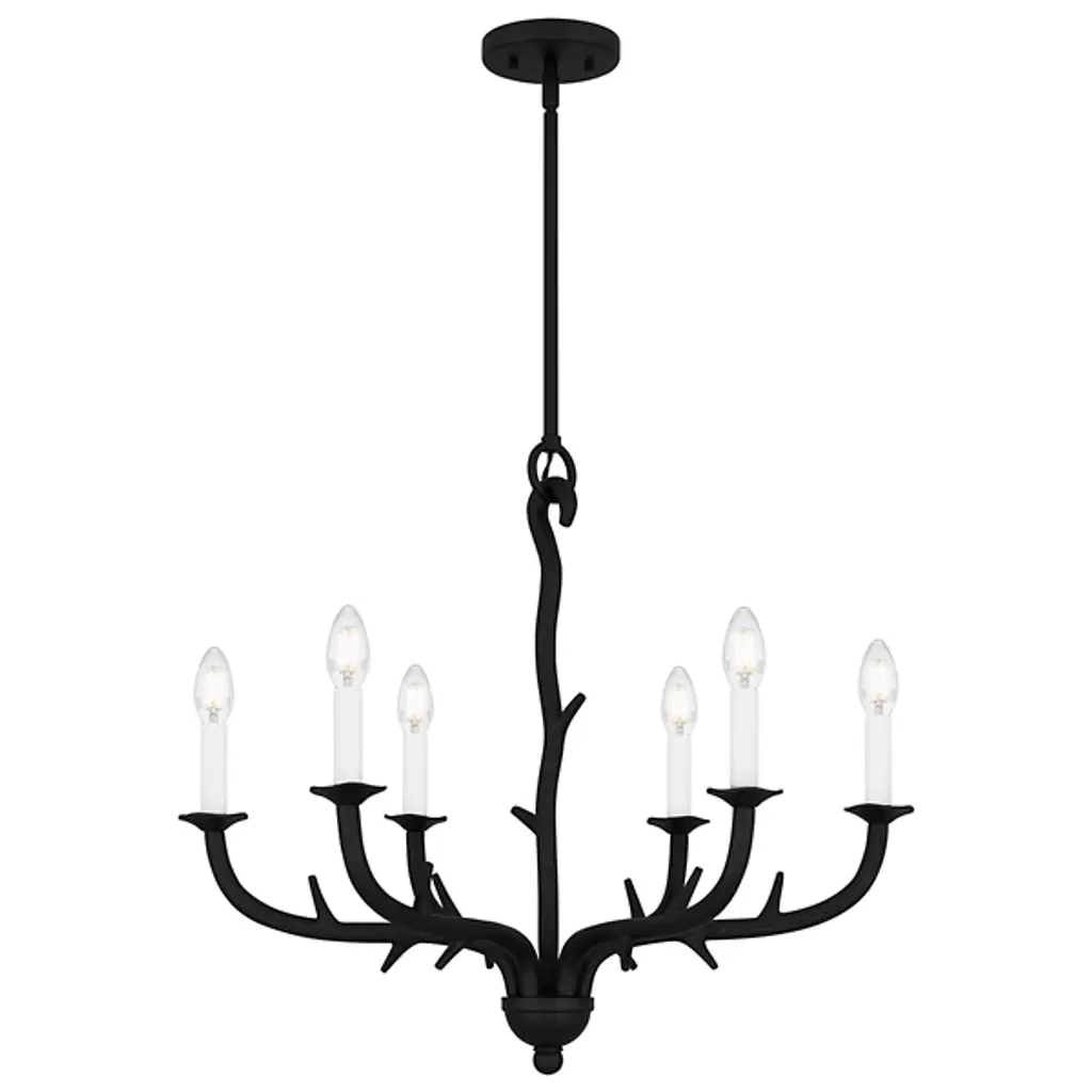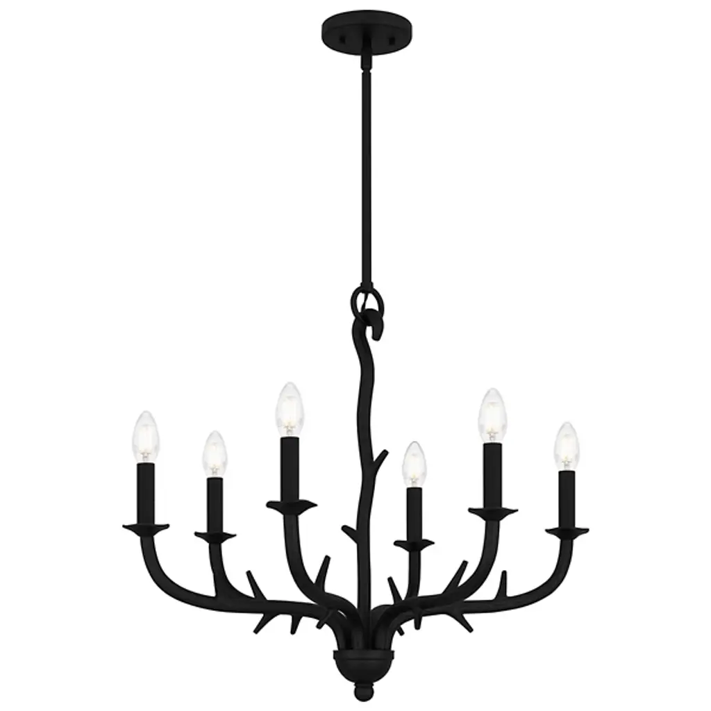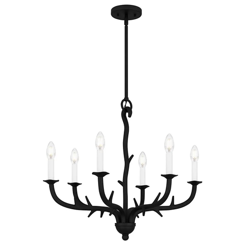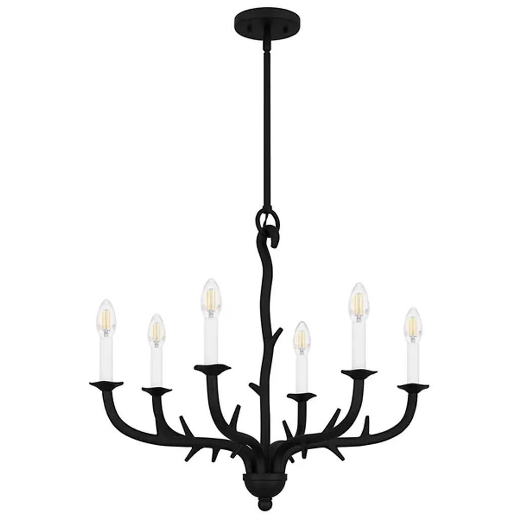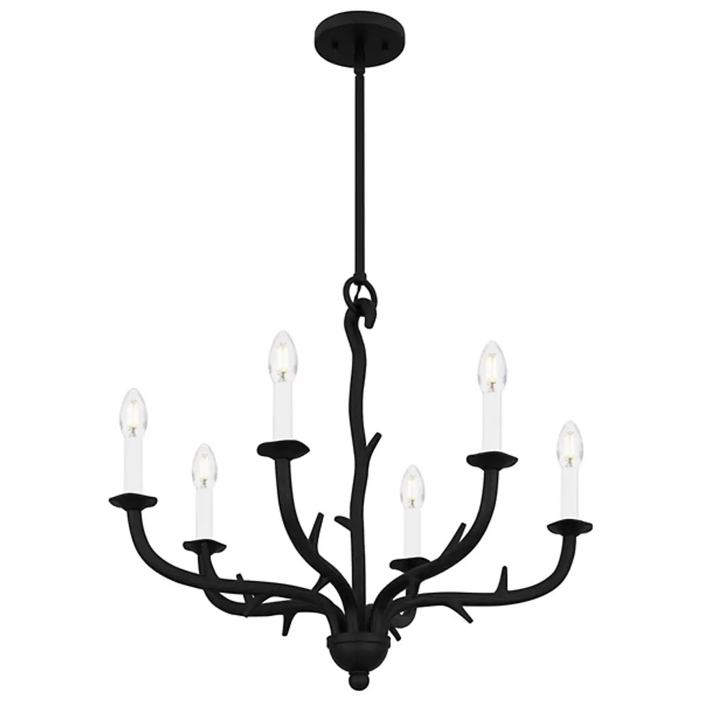 The Oakley Chandelier from Quoizel captures the essence of castle living. It is composed of durable steel that neatly wends for a fluid appearance. The eye is drawn to the spiky framework and the hook securing a downrod to a ceiling canopy. Elegant bobeches provide foundational support for LEDs that bring candelabra-style ambiance to your living space. This sloped-ceiling adaptable fixture combines transitional and farmhouse styles, making this fixture distinctive.