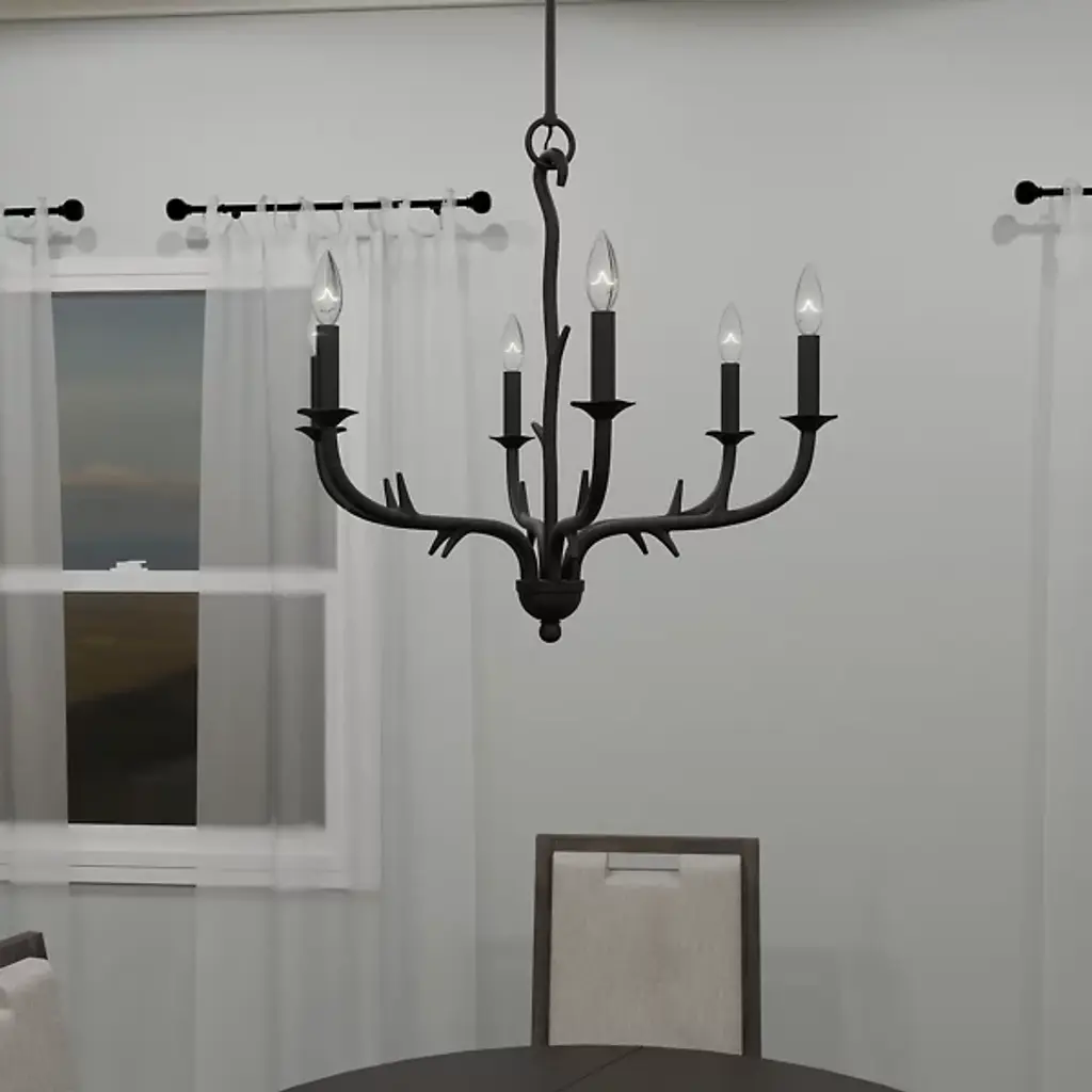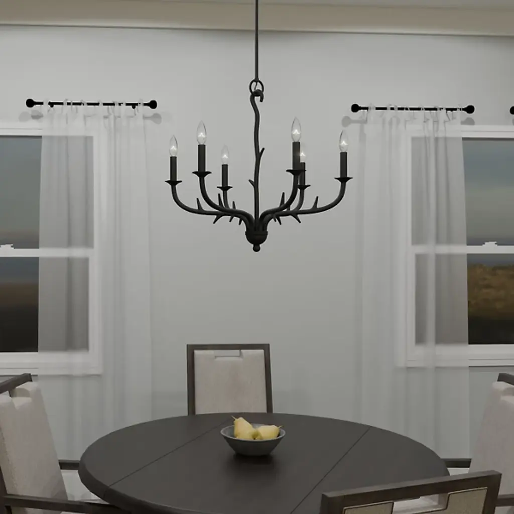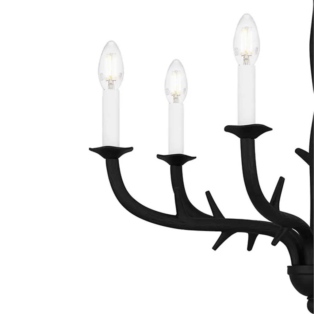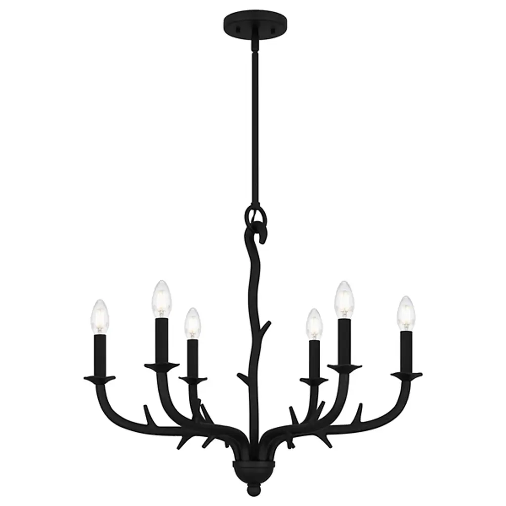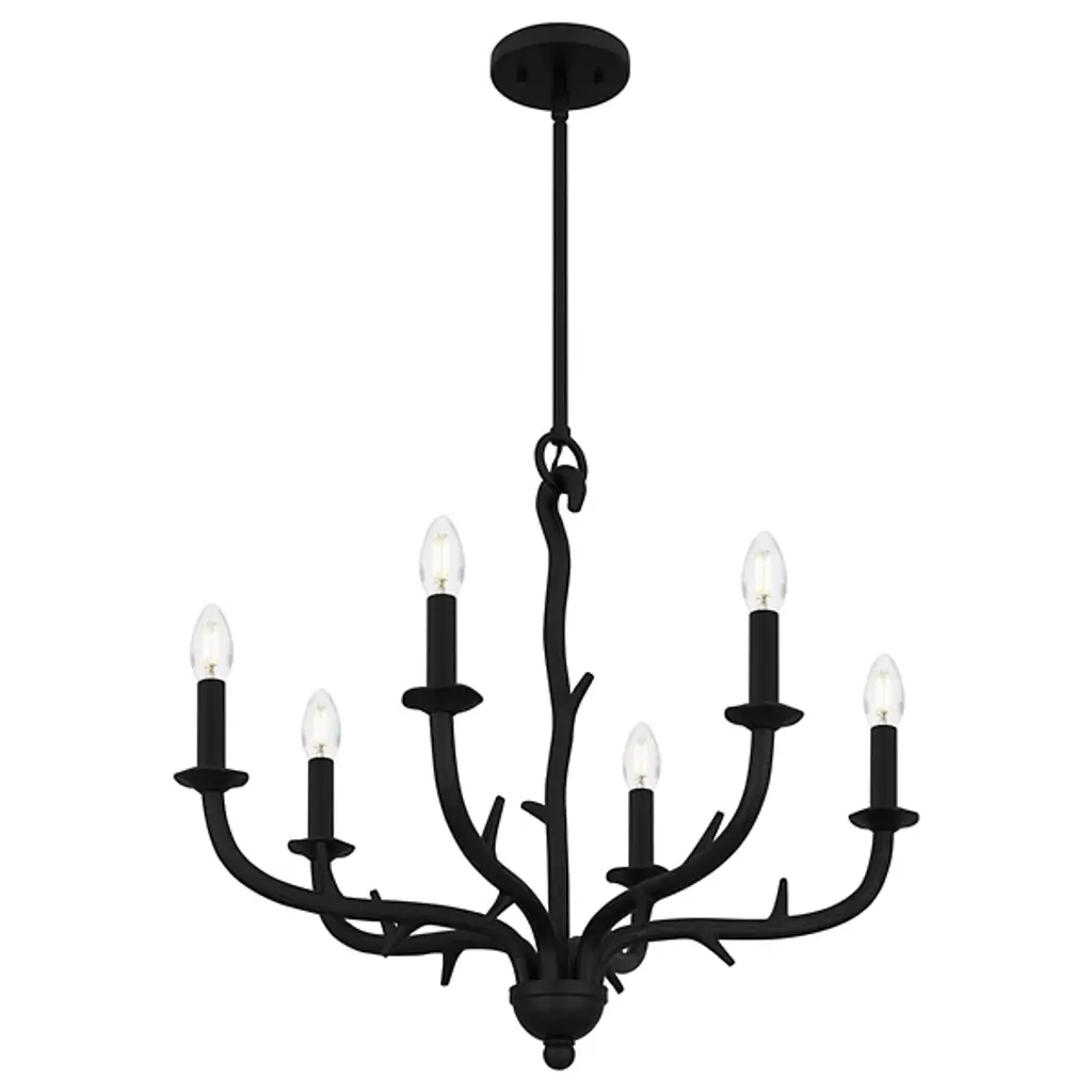 The Oakley Chandelier from Quoizel captures the essence of castle living. It is composed of durable steel that neatly wends for a fluid appearance. The eye is drawn to the spiky framework and the hook securing a downrod to a ceiling canopy. Elegant bobeches provide foundational support for LEDs that bring candelabra-style ambiance to your living space. This sloped-ceiling adaptable fixture combines transitional and farmhouse styles, making this fixture distinctive.