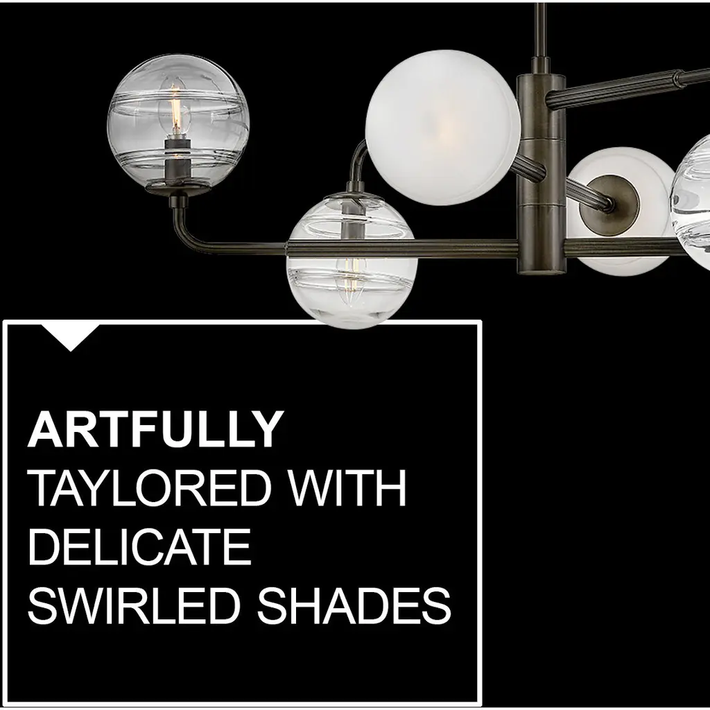 Artfully combining unexpected materials and innovative technology, Oberon's ribbed stems and articulating arms in Black Oxide allow for a tailored, transitional silhouette. Delicate swirls detail spherical shades in amber, clear, and smoke glass. Artfully combining unexpected materials, Oberon's ribbed stems create a tailored, transitional silhouette. Delicate swirls detail spherical shades in multicolored glass.