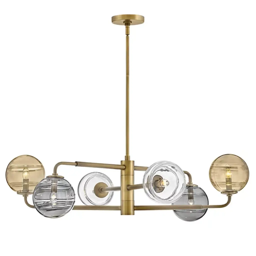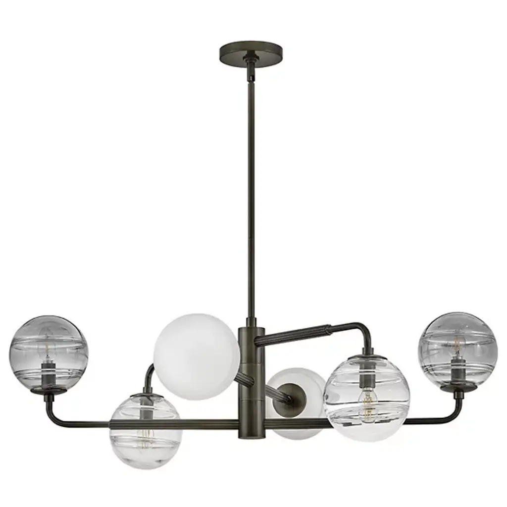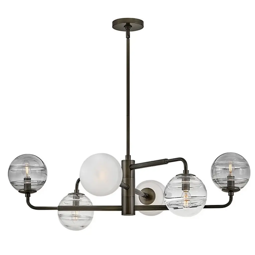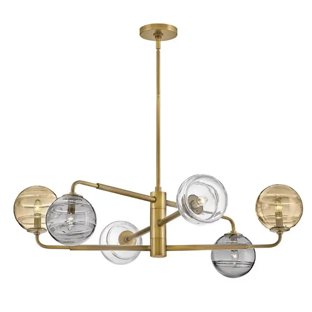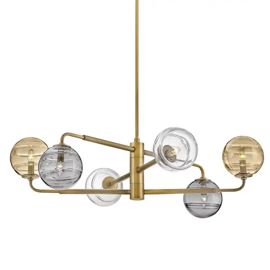 Artfully combining unexpected materials and innovative technology, the Oberon Chandelier by Fredrick Ramond features ribbed stems and articulating arms. A fine framework of metal gives this fixture a transitional silhouette. Delicate swirls detail spherical shades of delicate glass. The Oberon Chandelier is defined by its linear shape. This furnishment’s globes are brilliantly illuminated by a collection of LEDs.