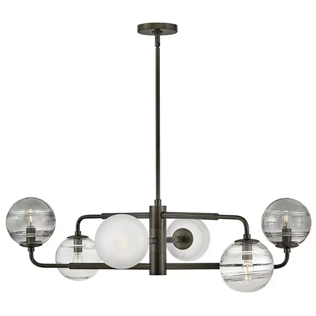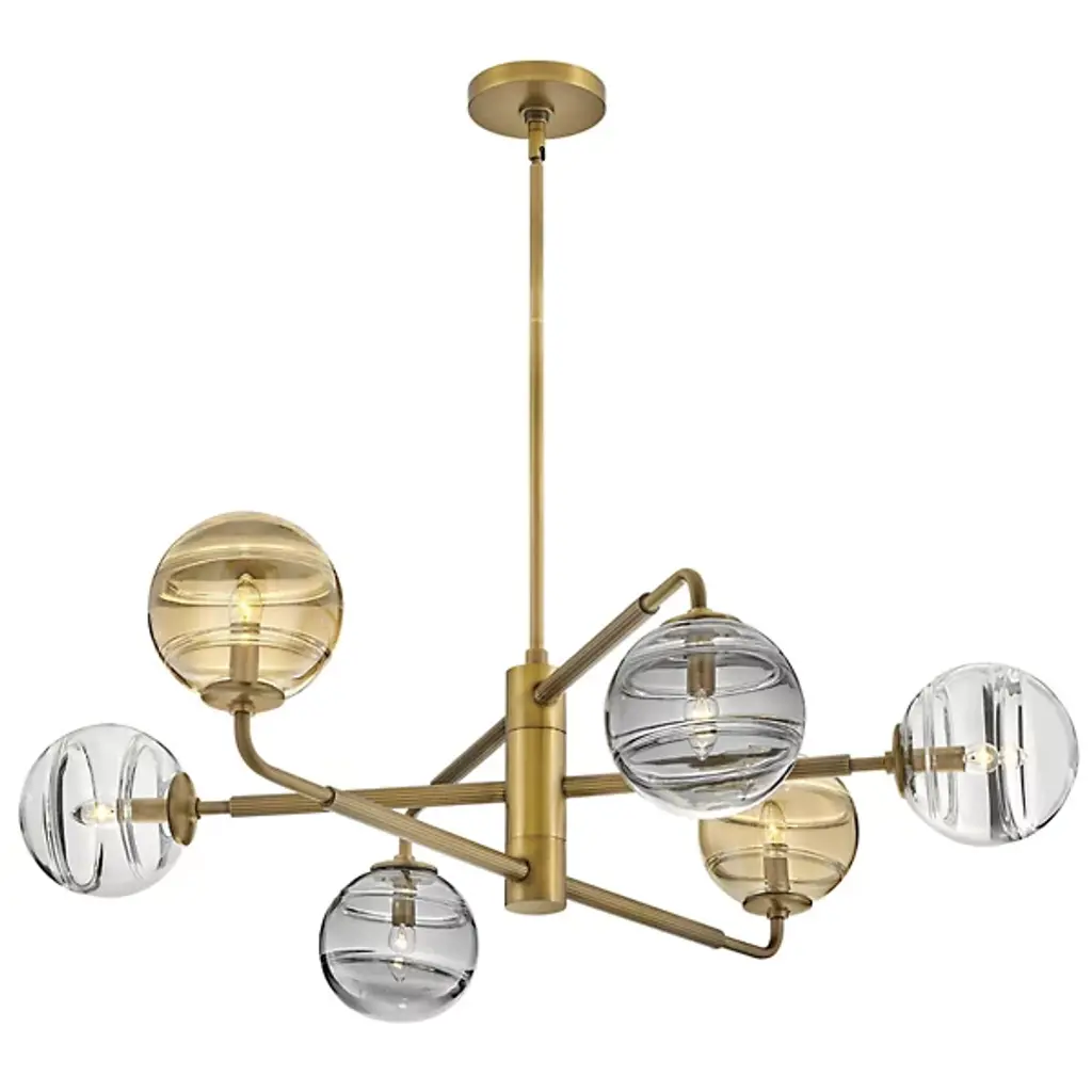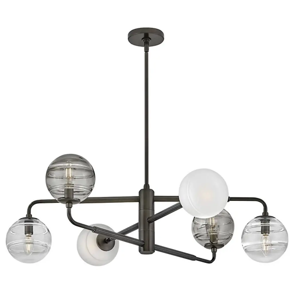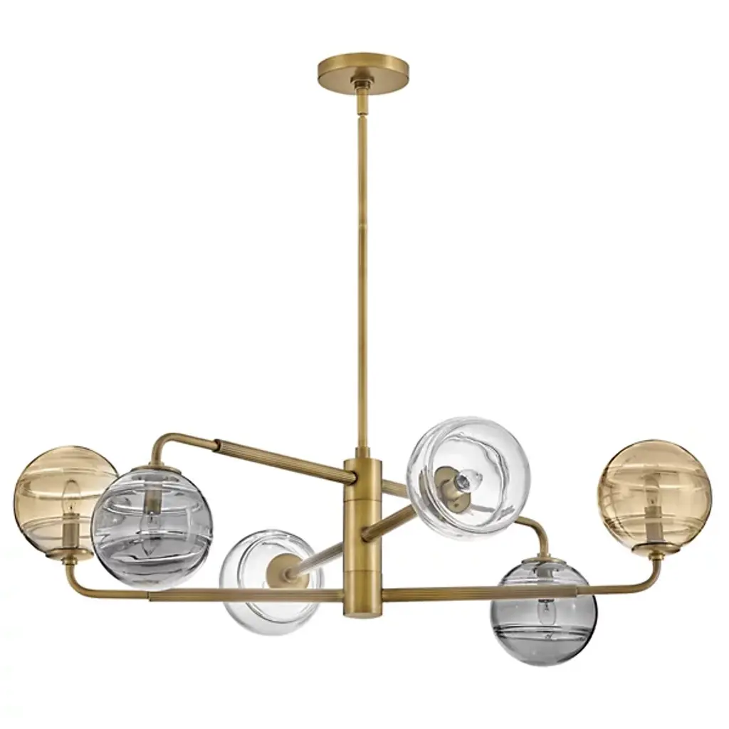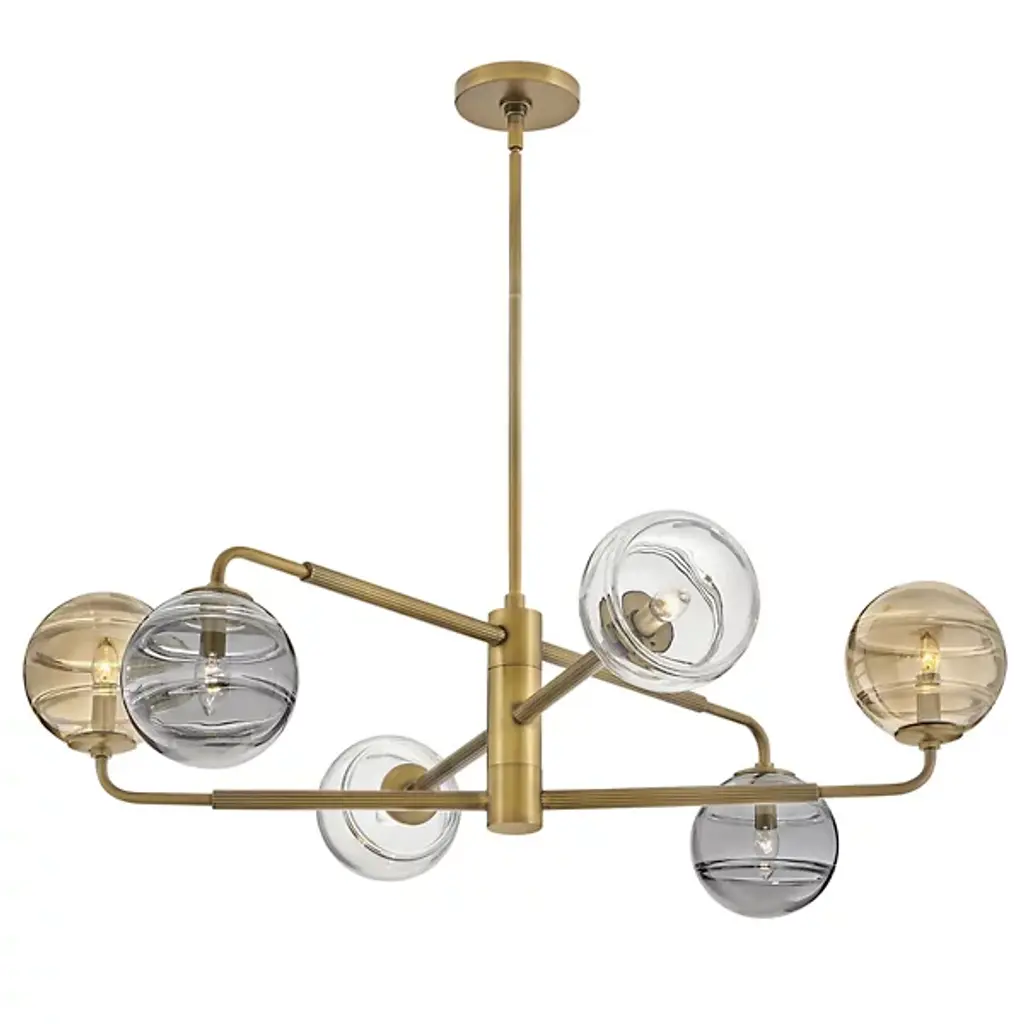 Artfully combining unexpected materials and innovative technology, the Oberon Chandelier by Fredrick Ramond features ribbed stems and articulating arms. A fine framework of metal gives this fixture a transitional silhouette. Delicate swirls detail spherical shades of delicate glass. The Oberon Chandelier is defined by its linear shape. This furnishment’s globes are brilliantly illuminated by a collection of LEDs.