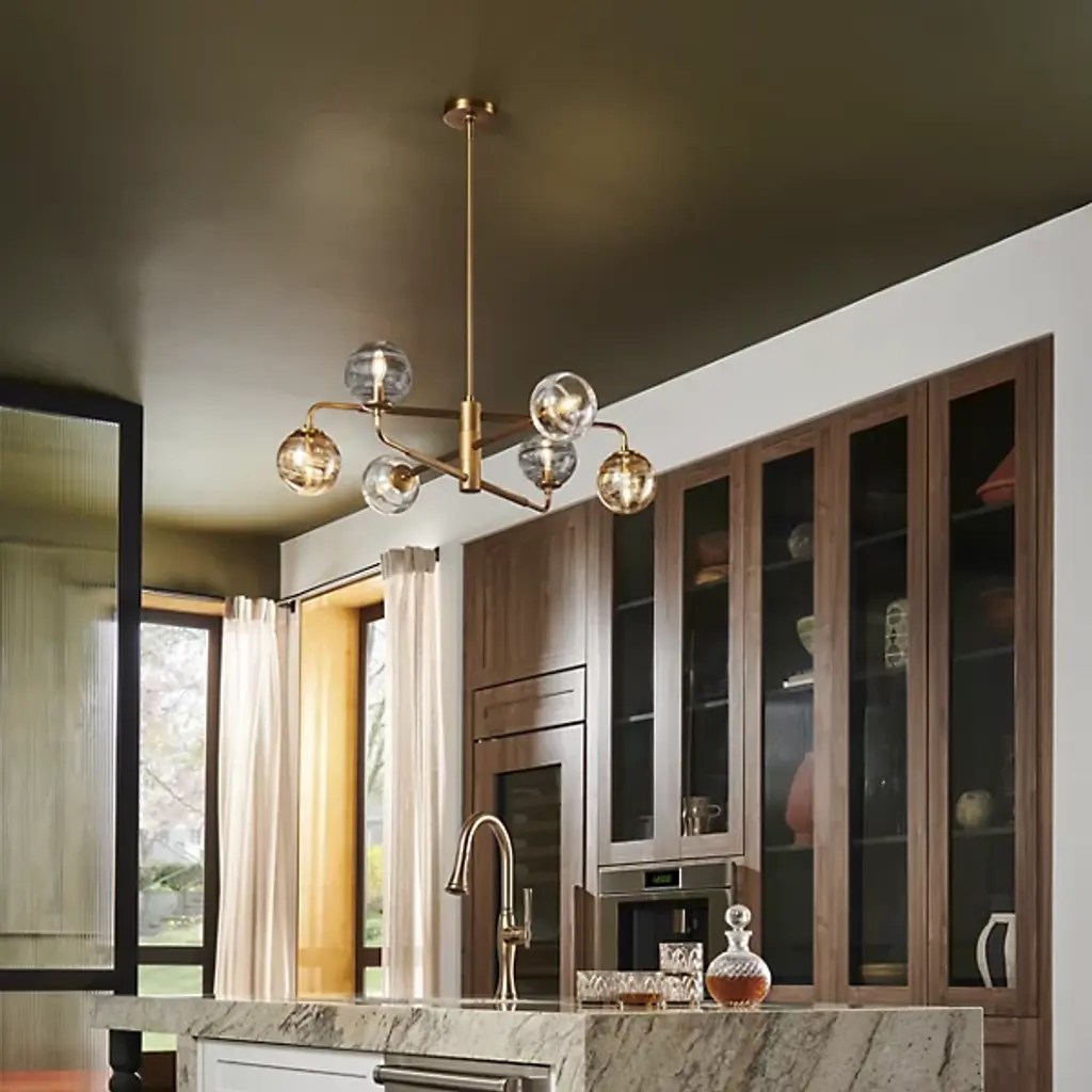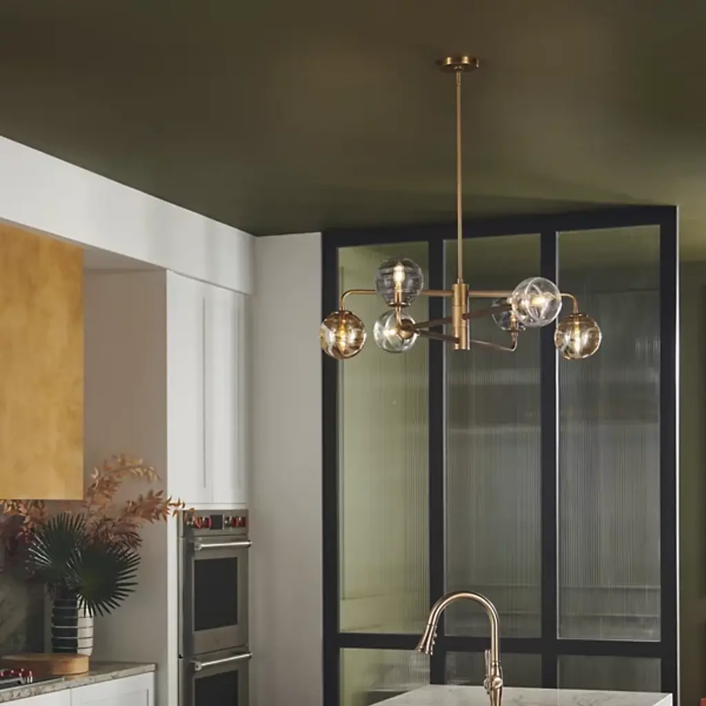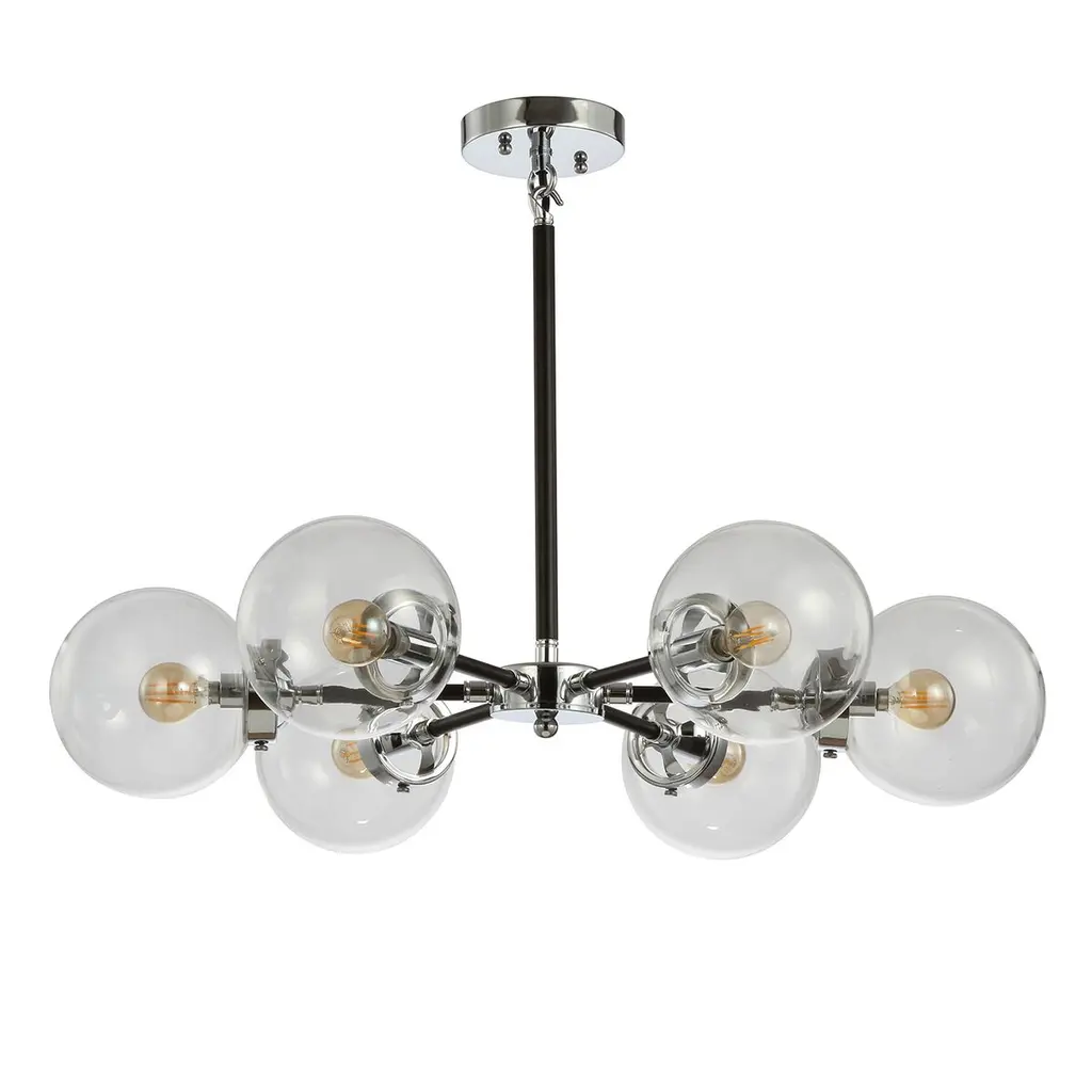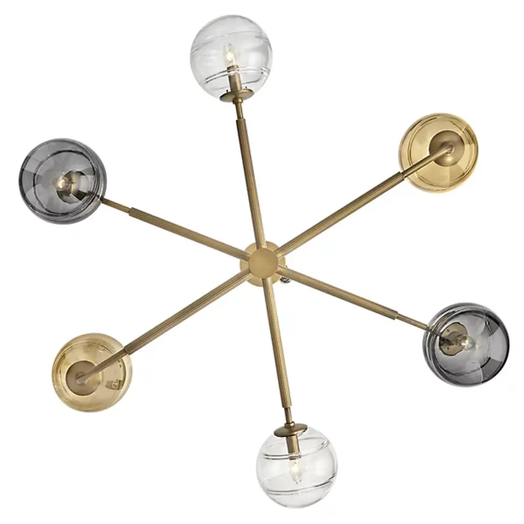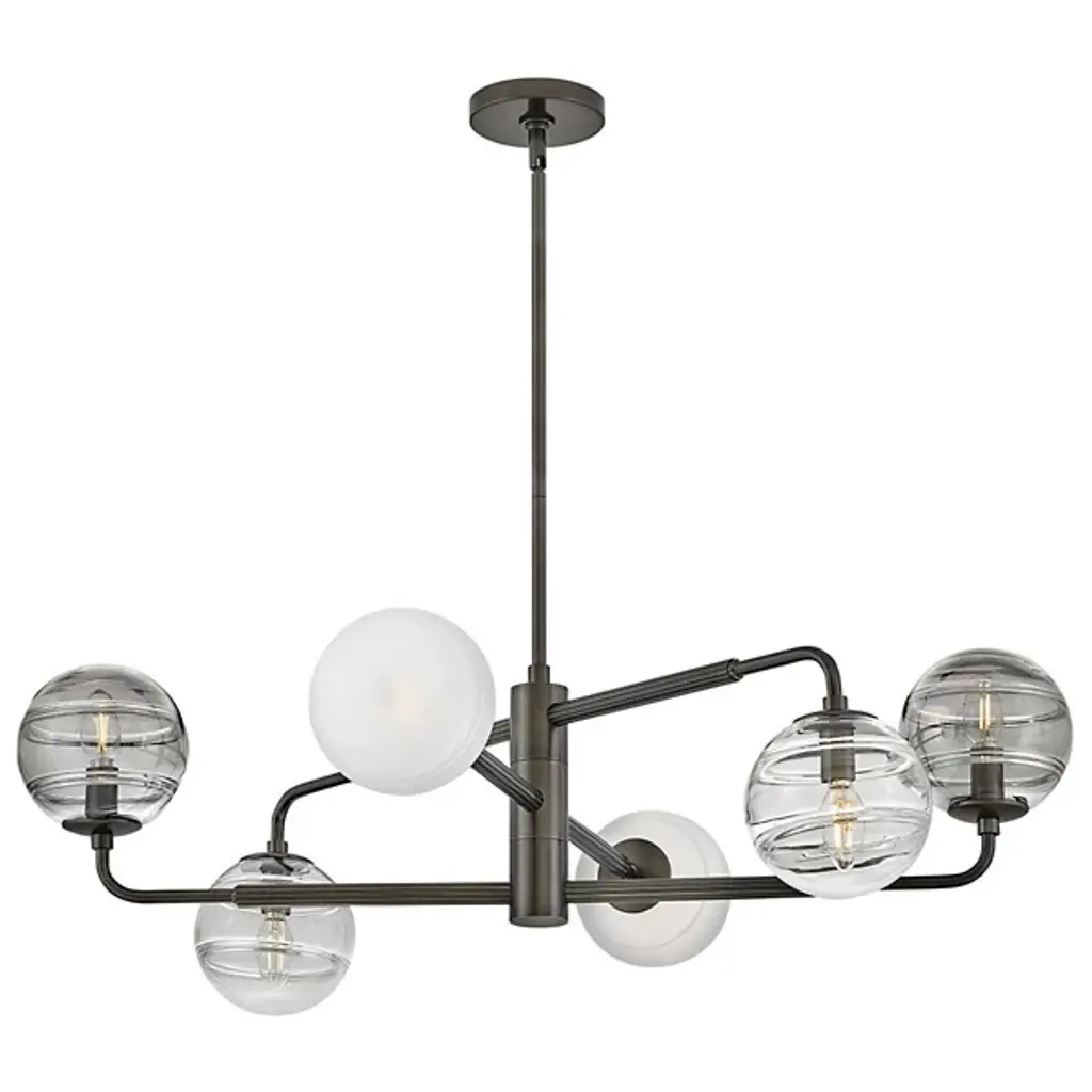 Artfully combining unexpected materials and innovative technology, the Oberon Chandelier by Fredrick Ramond features ribbed stems and articulating arms. A fine framework of metal gives this fixture a transitional silhouette. Delicate swirls detail spherical shades of delicate glass. The Oberon Chandelier is defined by its linear shape. This furnishment’s globes are brilliantly illuminated by a collection of LEDs.