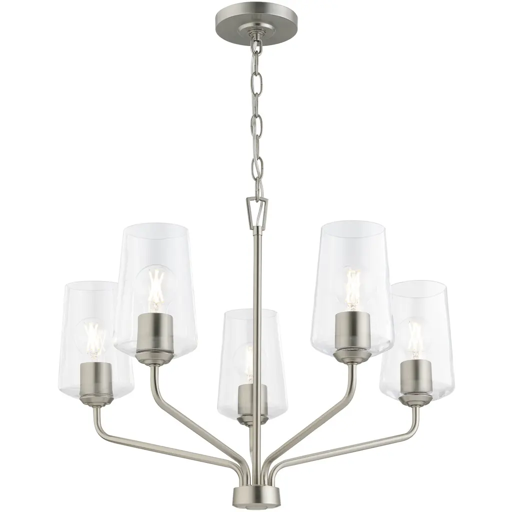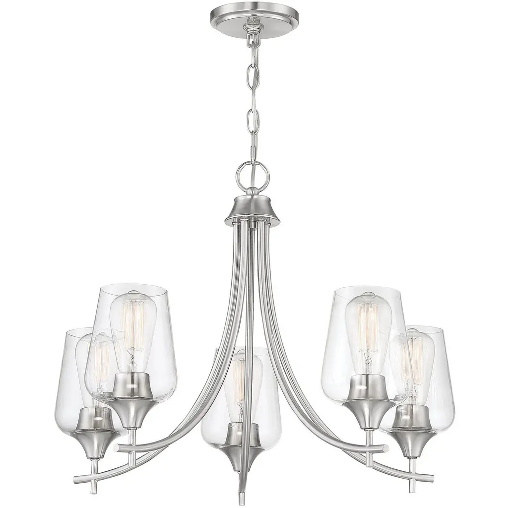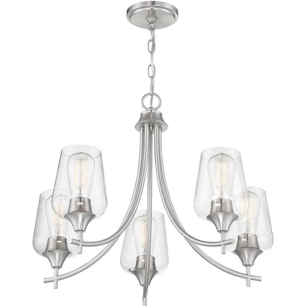 In the Savoy House Octave 5-light chandelier, a bold, light-colored frame and streamlined silhouette create an air of elegance and sophistication. The satin nickel finish and large clear glass shades go with everything. Whether you have transitional, contemporary, bohemian or other decor styles in your home, youll love the way this Octave fixture will stylishly fit right in. The chandelier measures 23 wide and 18.5 high with a classic chain to connect to the ceiling. Curved light arms hold curved glass shades for a graceful, uncluttered look. Five 60W standard size bulbs will provide lovely illumination in your space for clean, casual style in a dining area, living room, entryway, bedroom, kitchen, family room, office or great room.