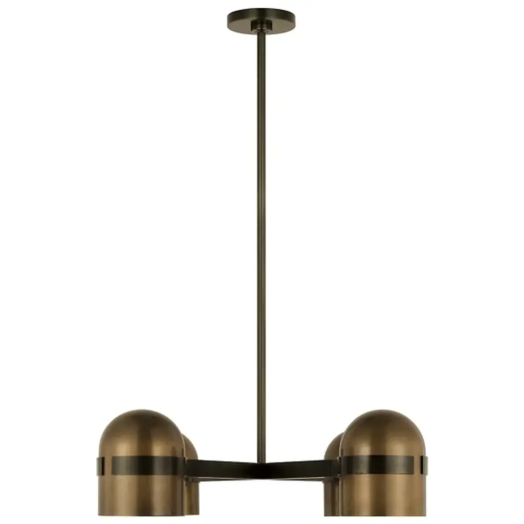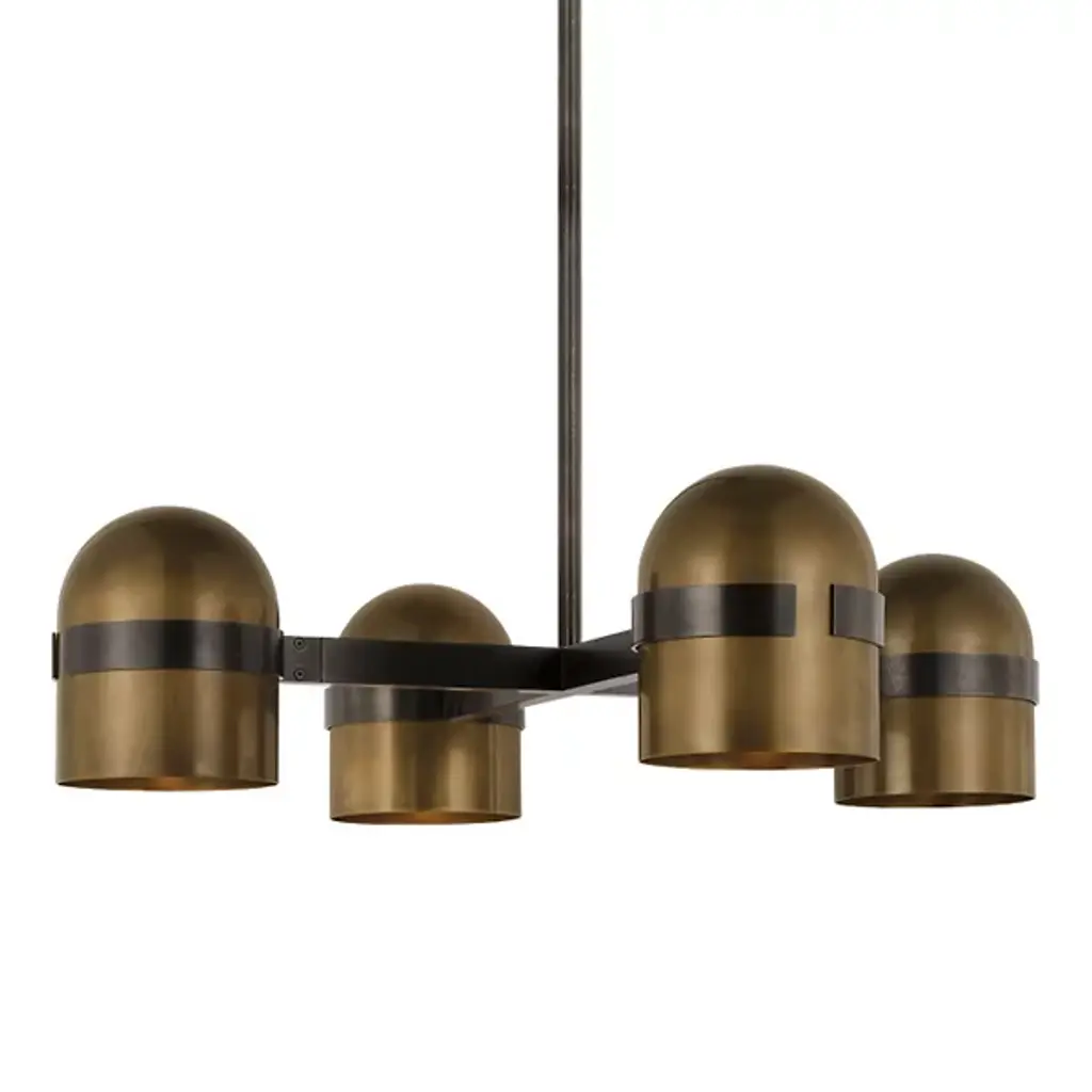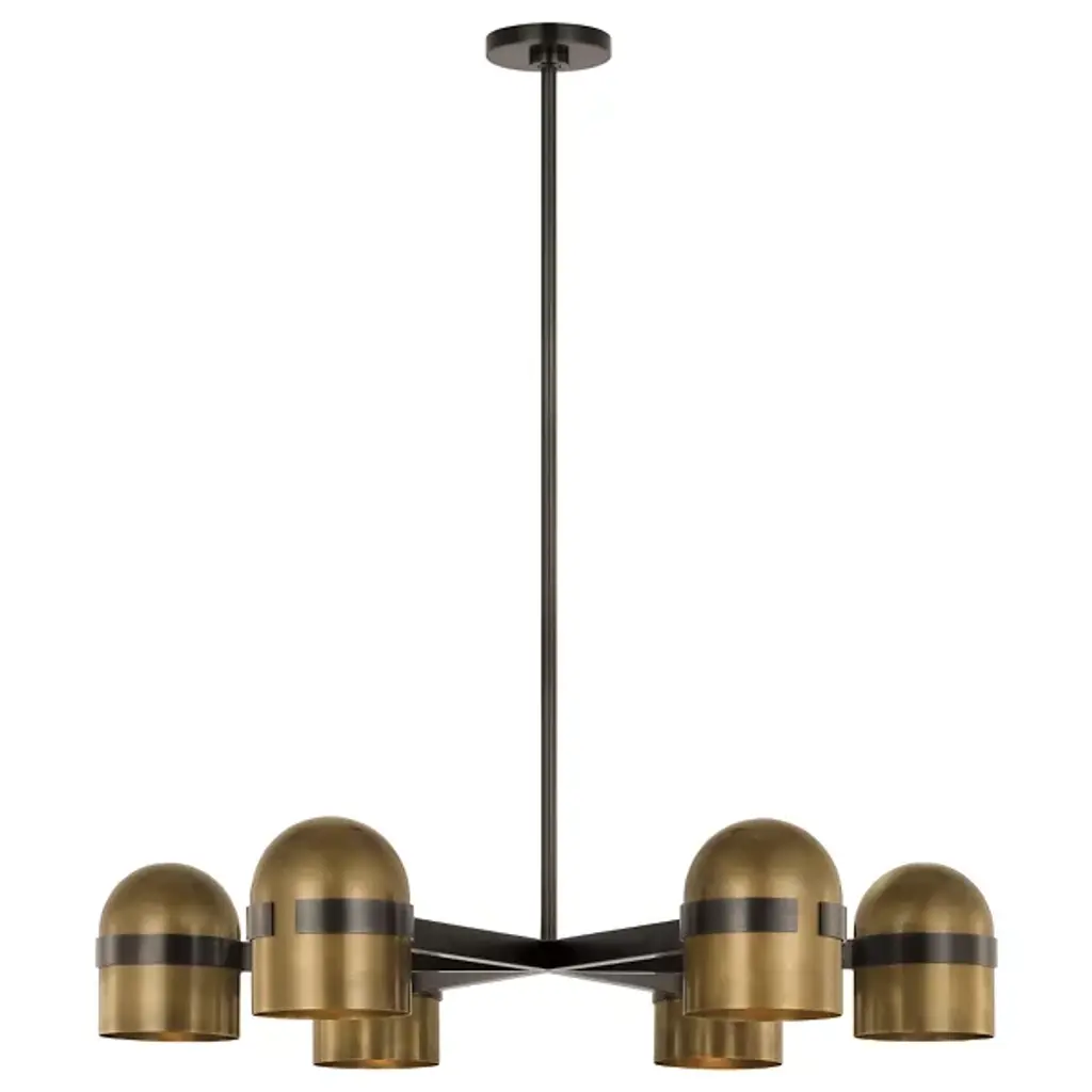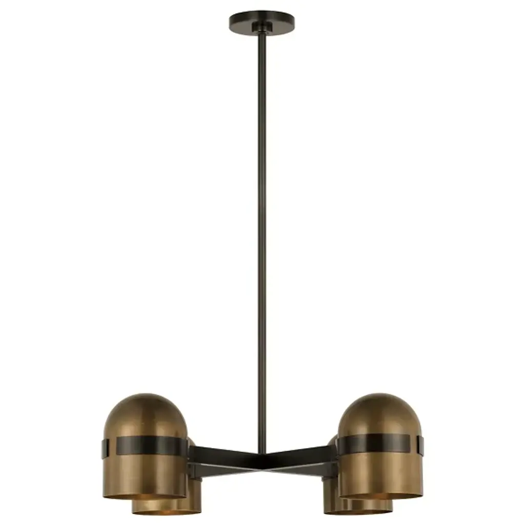 Illuminate your home with the stylish, industrial-inspired Octavia LED Chandelier by Visual Comfort Modern. This striking centerpiece suspends from a circular canopy and slender downrod, culminating in a cross of outstretched metal arms with polished brass dome shades on each end. Each shade contains integrated LED lamping, providing energy-efficient, expressive lighting ideal for living rooms and dining spaces. This piece is also sloped ceiling adaptable, up to 22.5 degrees, to accommodate those tricky, vaulted ceilings.