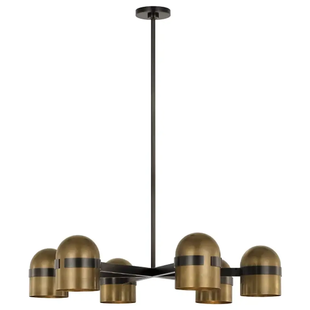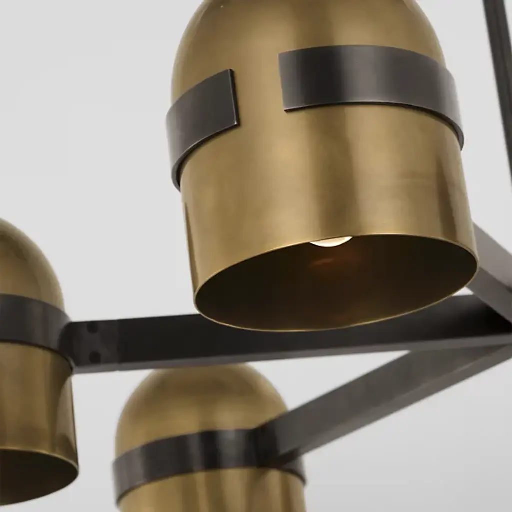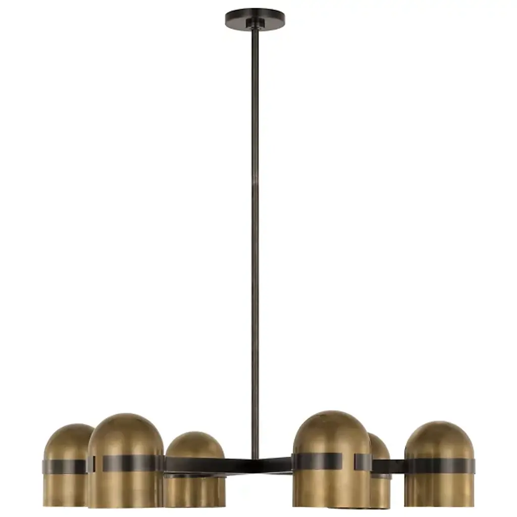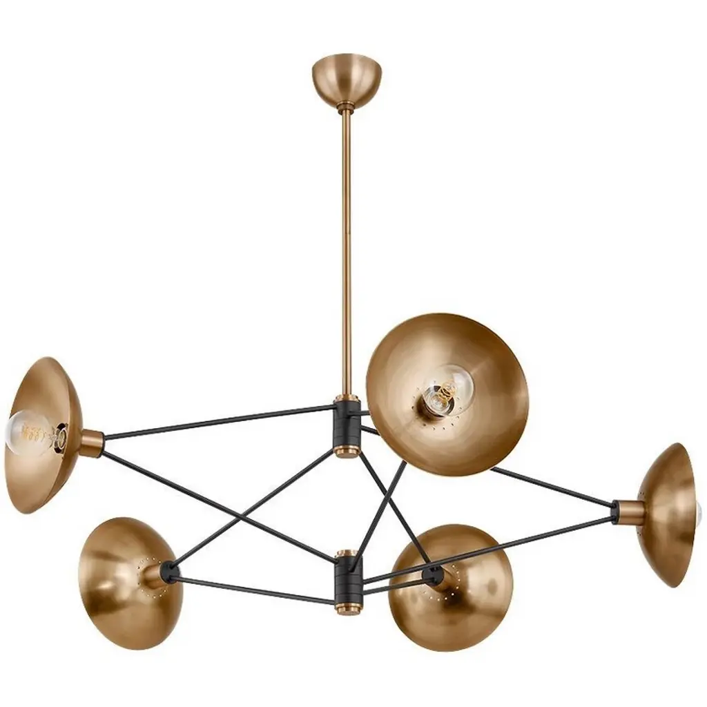 Illuminate your home with the stylish, industrial-inspired Octavia LED Chandelier by Visual Comfort Modern. This striking centerpiece suspends from a circular canopy and slender downrod, culminating in a cross of outstretched metal arms with polished brass dome shades on each end. Each shade contains integrated LED lamping, providing energy-efficient, expressive lighting ideal for living rooms and dining spaces. This piece is also sloped ceiling adaptable, up to 22.5 degrees, to accommodate those tricky, vaulted ceilings.
