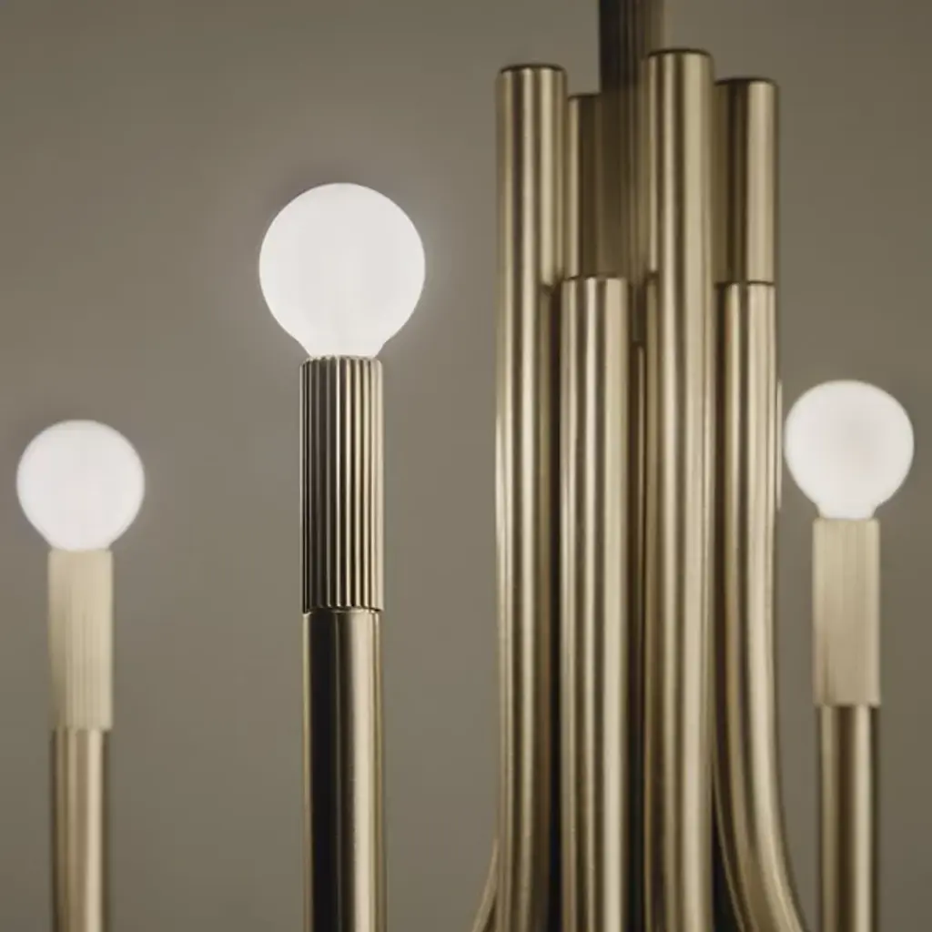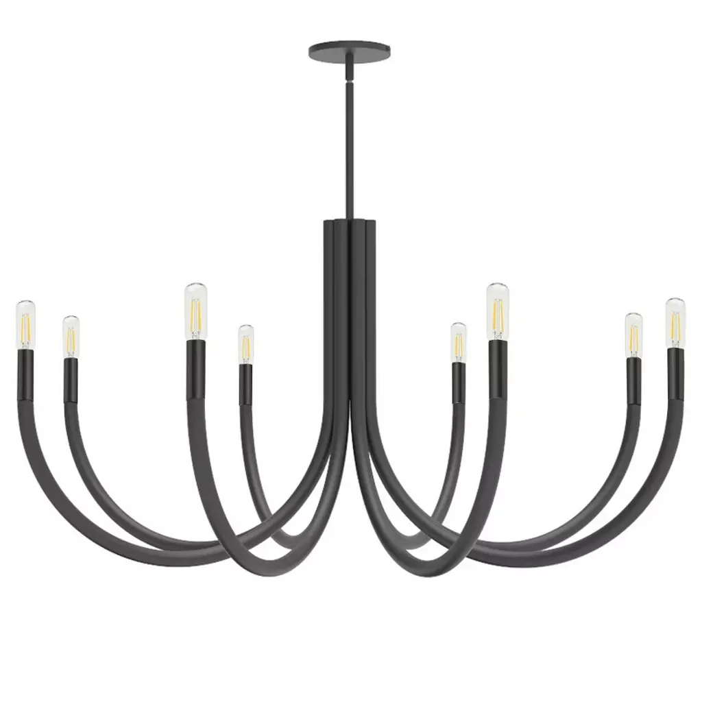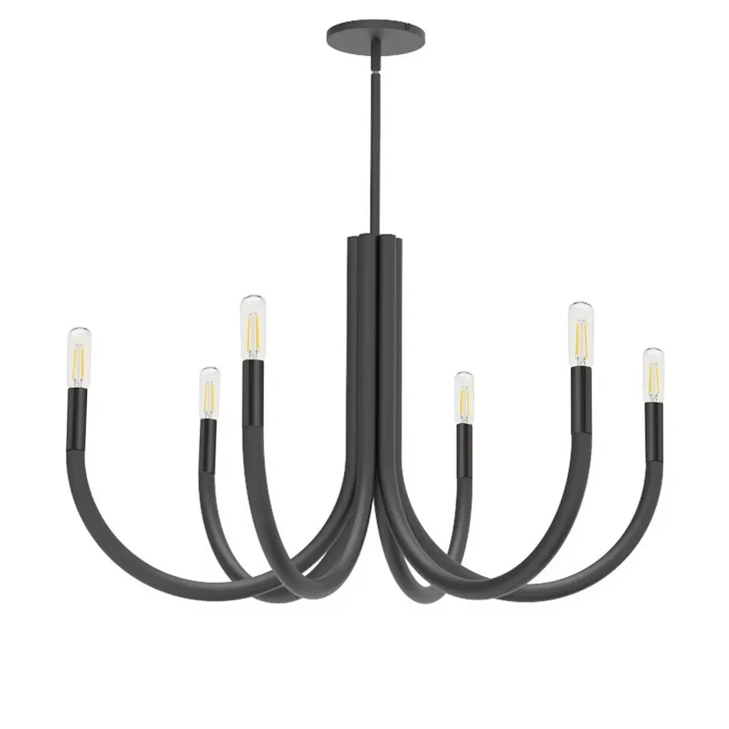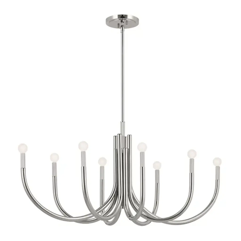 The Odensa Oval Chandelier by Kichler is a modern and stylish chandelier featuring downwardly curved arms arranged in a circular pattern and topped with bulbs, and it is sloped ceiling compatible. It features bold tubing, fluting under each bulb. It is dimmable, so you can create a welcoming ambiance for any occasion, whether that be in a living room, dining room, bedroom, foyer, or entryway.