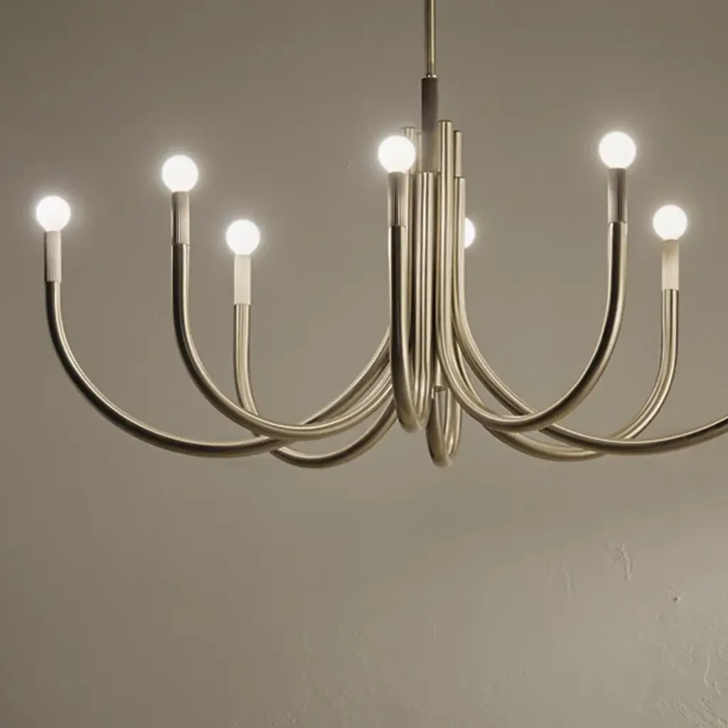 The Odensa Oval Chandelier by Kichler is a modern and stylish chandelier featuring downwardly curved arms arranged in a circular pattern and topped with bulbs, and it is sloped ceiling compatible. It features bold tubing, fluting under each bulb. It is dimmable, so you can create a welcoming ambiance for any occasion, whether that be in a living room, dining room, bedroom, foyer, or entryway.