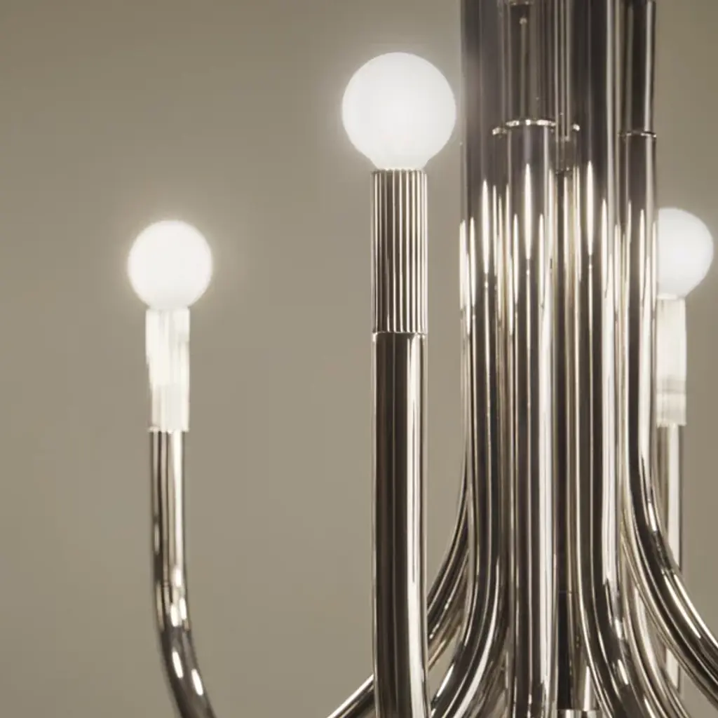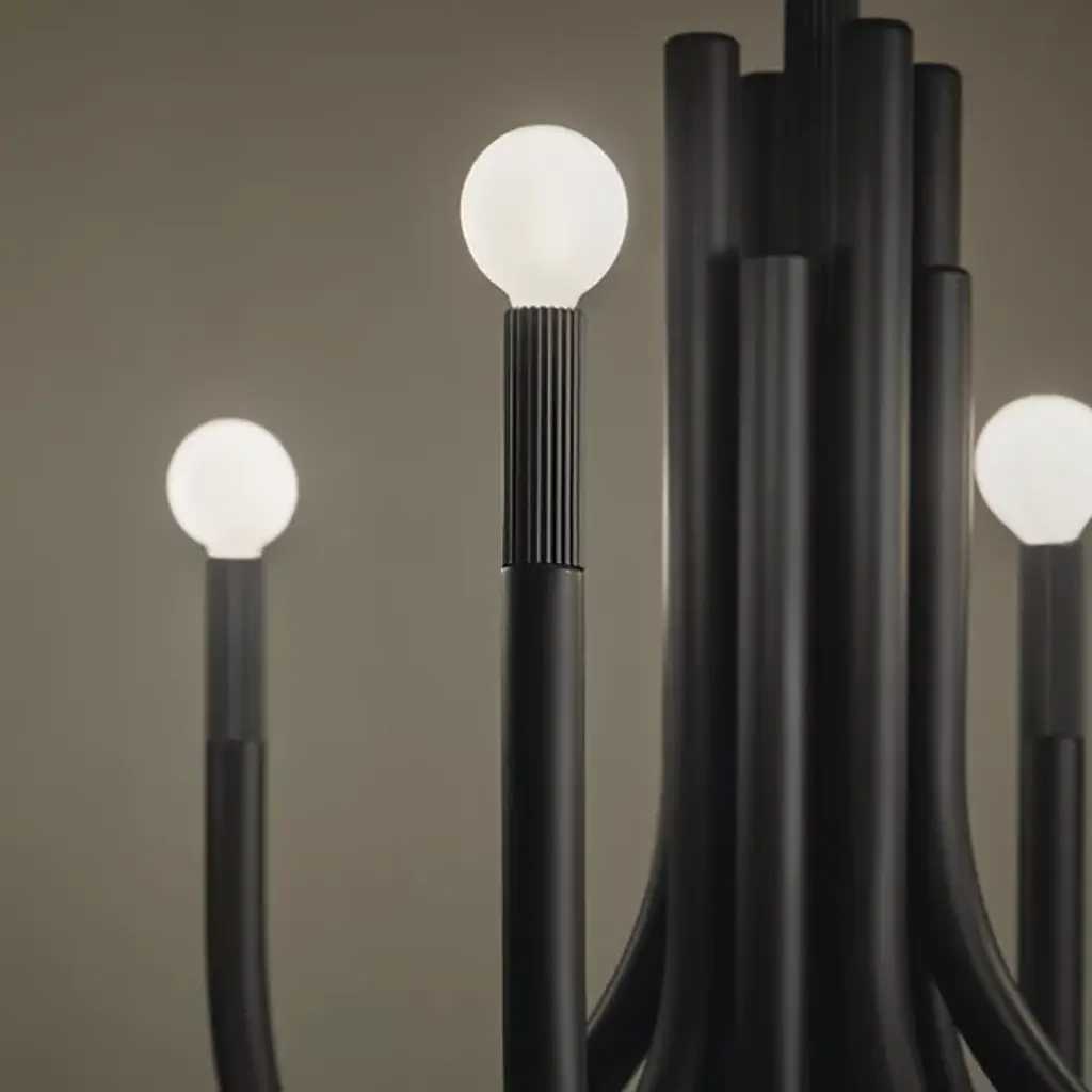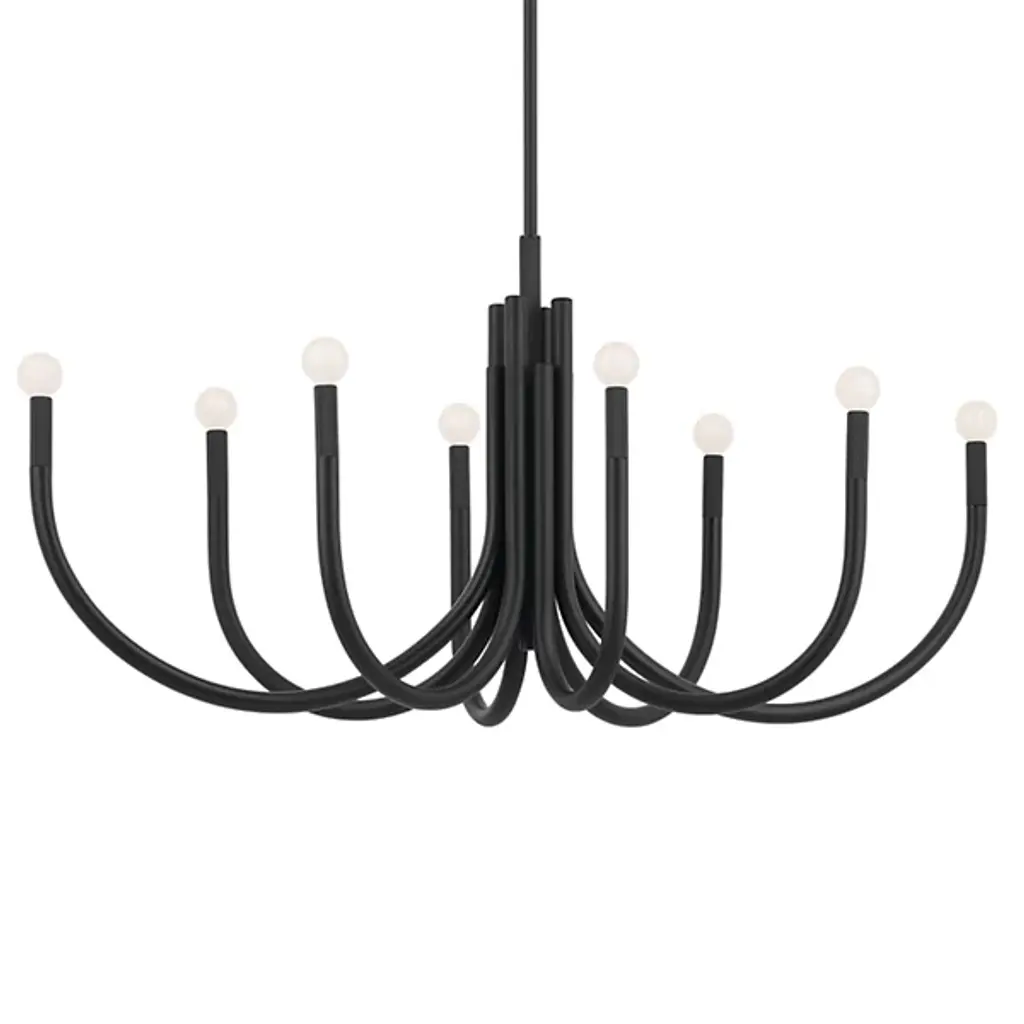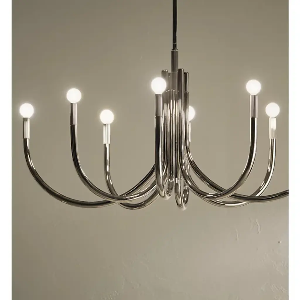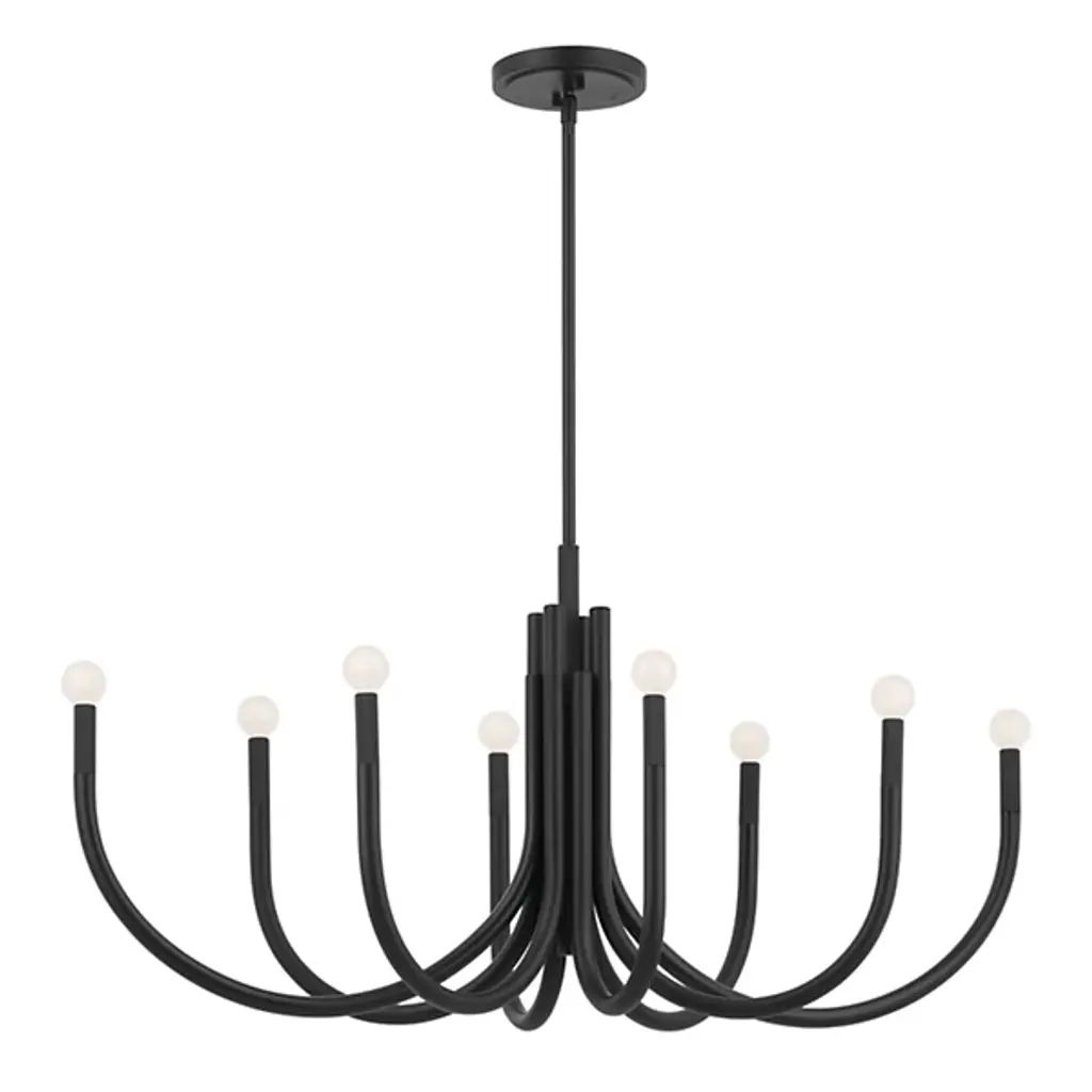 The Odensa Oval Chandelier by Kichler is a modern and stylish chandelier featuring downwardly curved arms arranged in a circular pattern and topped with bulbs, and it is sloped ceiling compatible. It features bold tubing, fluting under each bulb. It is dimmable, so you can create a welcoming ambiance for any occasion, whether that be in a living room, dining room, bedroom, foyer, or entryway.