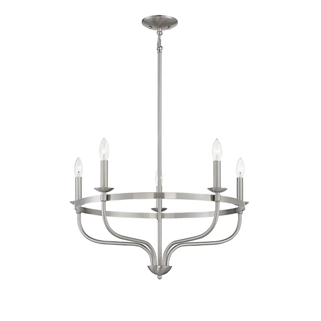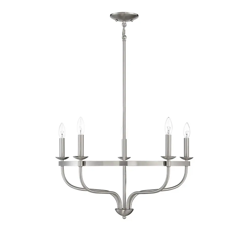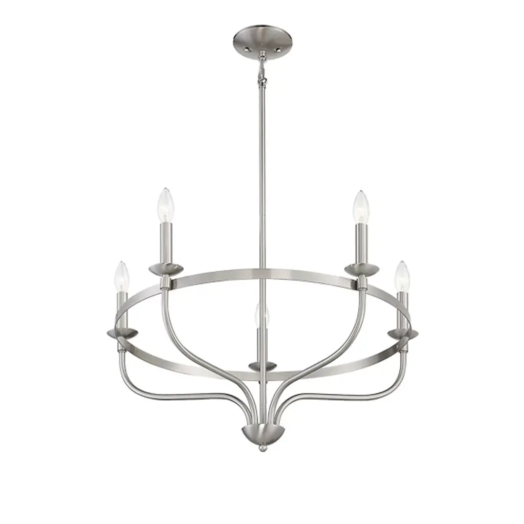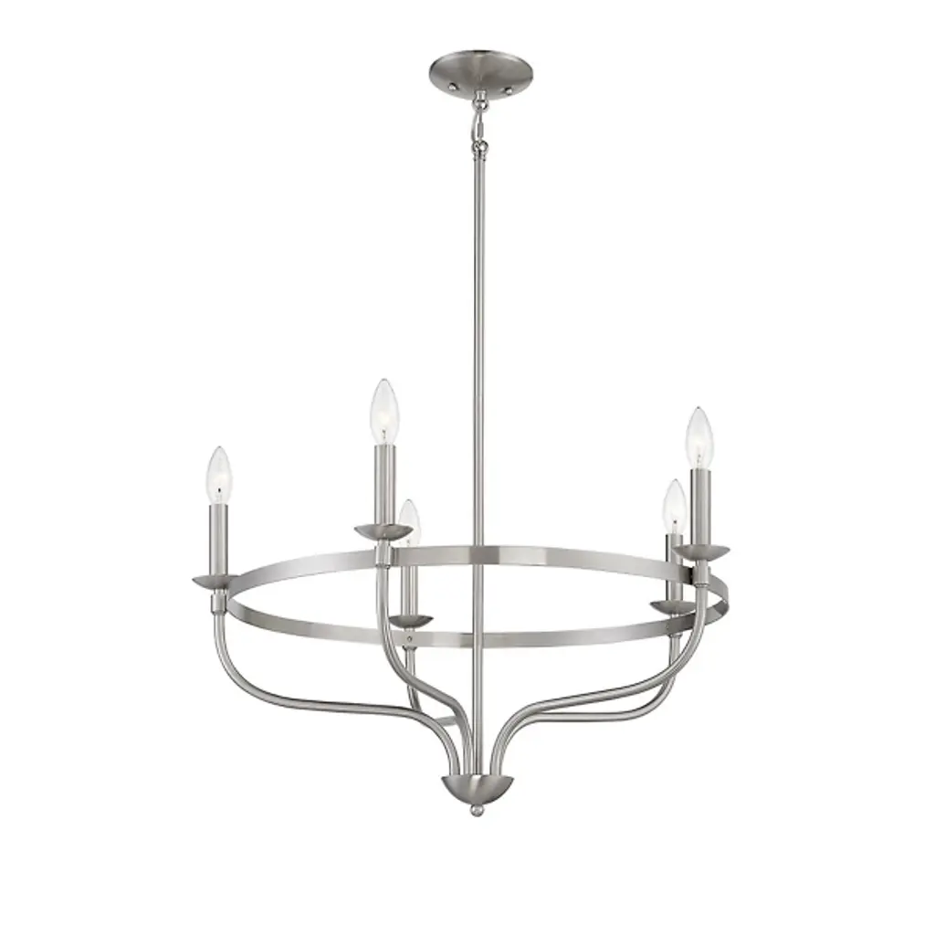 Brighten up your indoor areas with the Olivia Chandelier from Alder & Ore. A clean-surfaced mix of contemporary style and transitional substance, it’s anchored by a smooth metal canopy and uses a short chain link to extend a single downrod from above. This single stem ends in a rounded finial, which then extends a series of curved arms upward, each of which blooms a single, candelabra-style lamp secured along the outside of a single round ring. The open lamping blazes out from above, burnishing the metalwork while distributing a bright, even ambiance around the fixture.