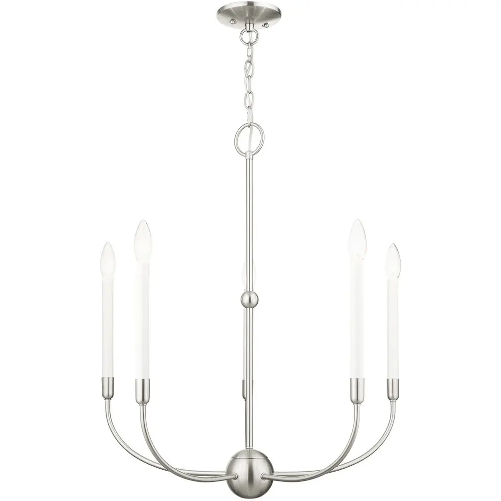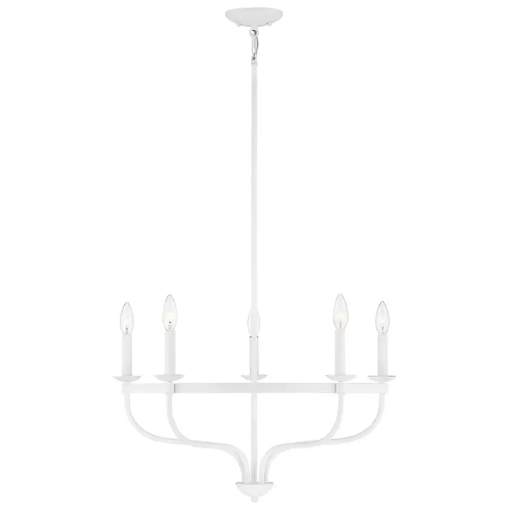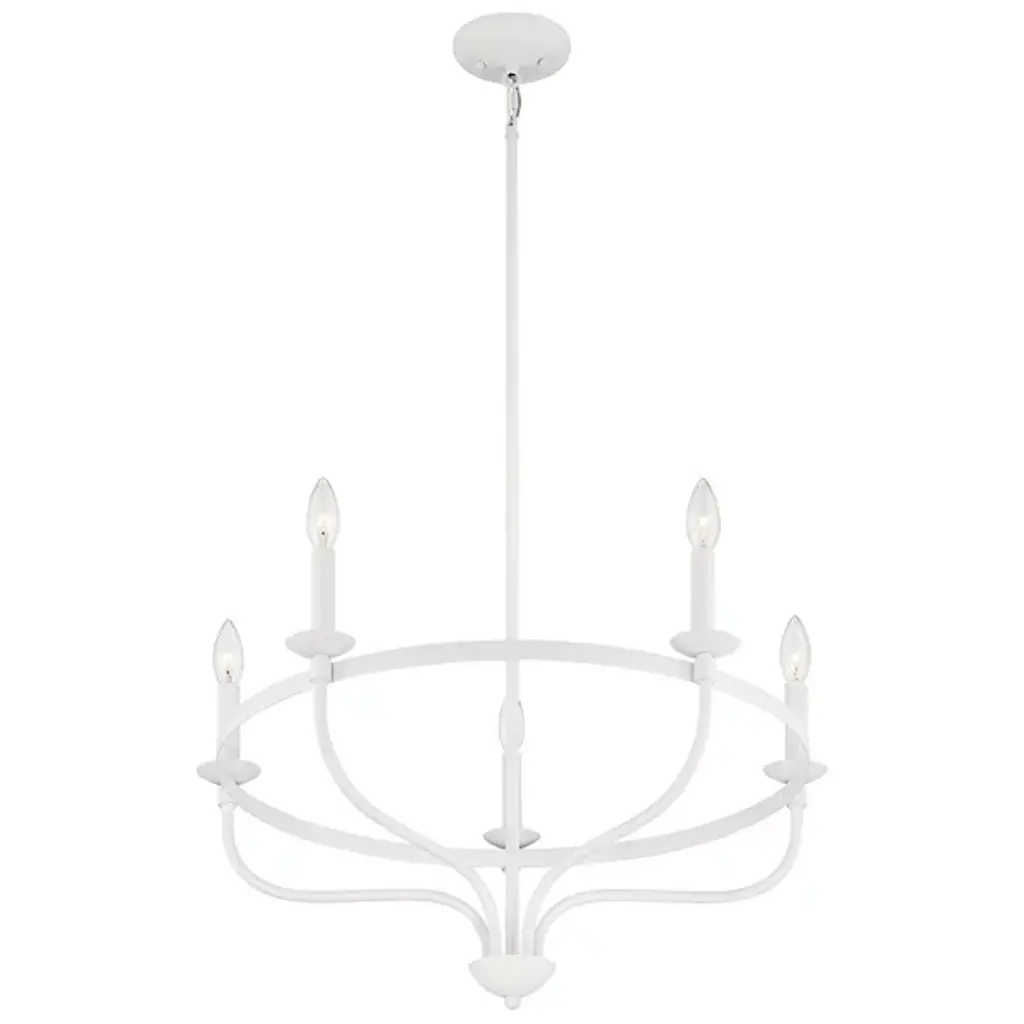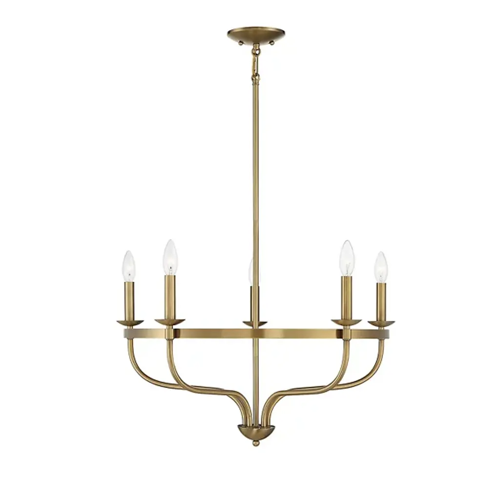 Brighten up your indoor areas with the Olivia Chandelier from Alder & Ore. A clean-surfaced mix of contemporary style and transitional substance, it’s anchored by a smooth metal canopy and uses a short chain link to extend a single downrod from above. This single stem ends in a rounded finial, which then extends a series of curved arms upward, each of which blooms a single, candelabra-style lamp secured along the outside of a single round ring. The open lamping blazes out from above, burnishing the metalwork while distributing a bright, even ambiance around the fixture.