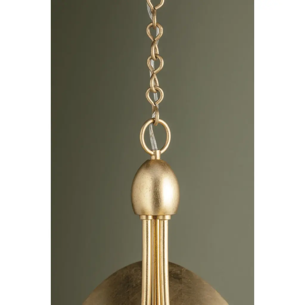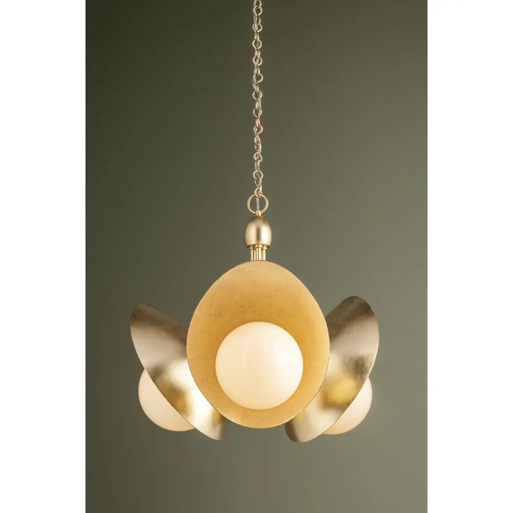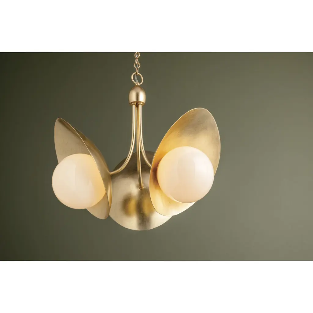 The opal shiny glass globes of this chandelier resemble pearls nestled within shell-shaped reflectors. Finished in Vintage Gold Leaf, Olsons sculptural curved arms provide a flourish of timeless glamor. This eye-catching fixture comes in a 3 or 5-light version, illuminating spaces of all sizes with an ethereal glow.