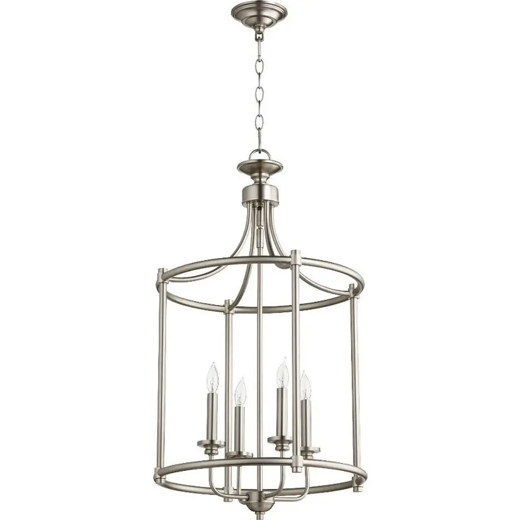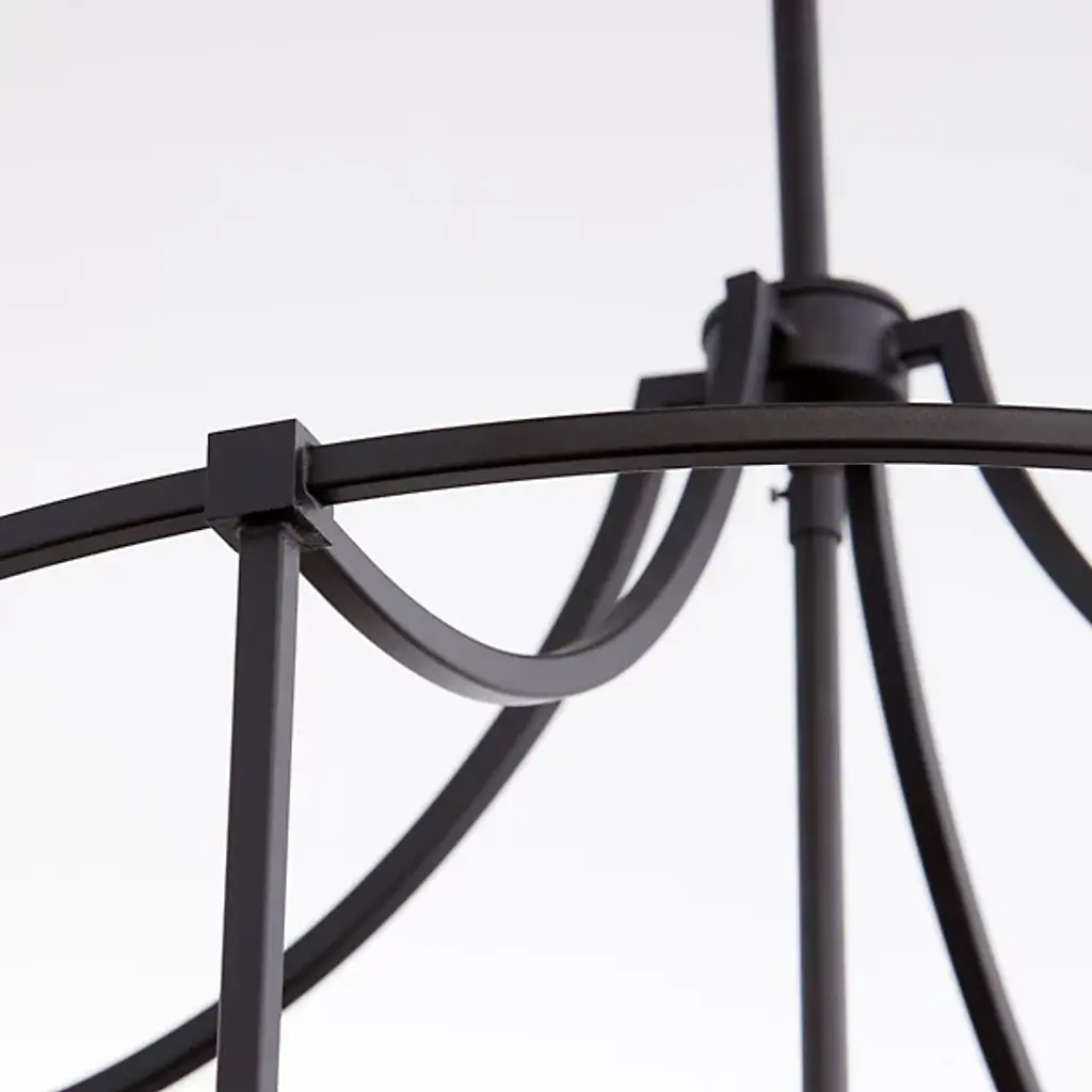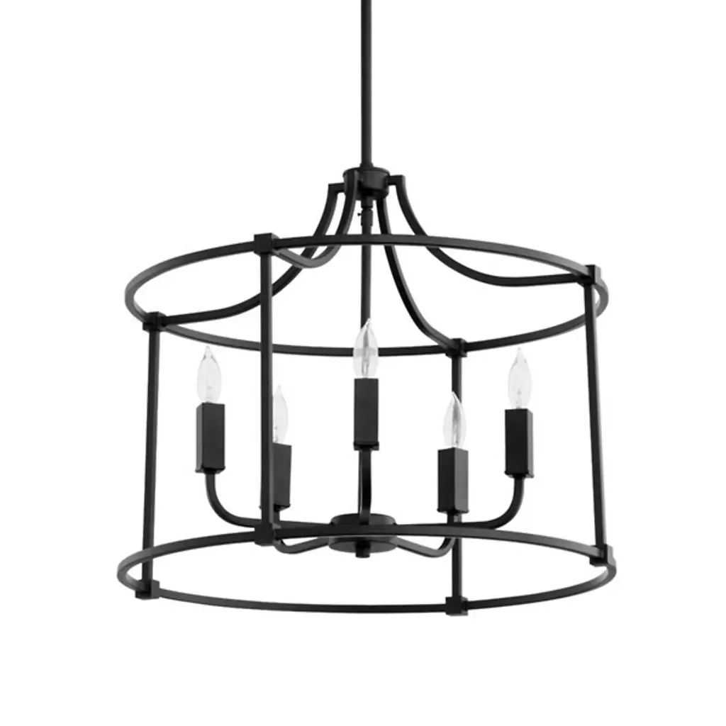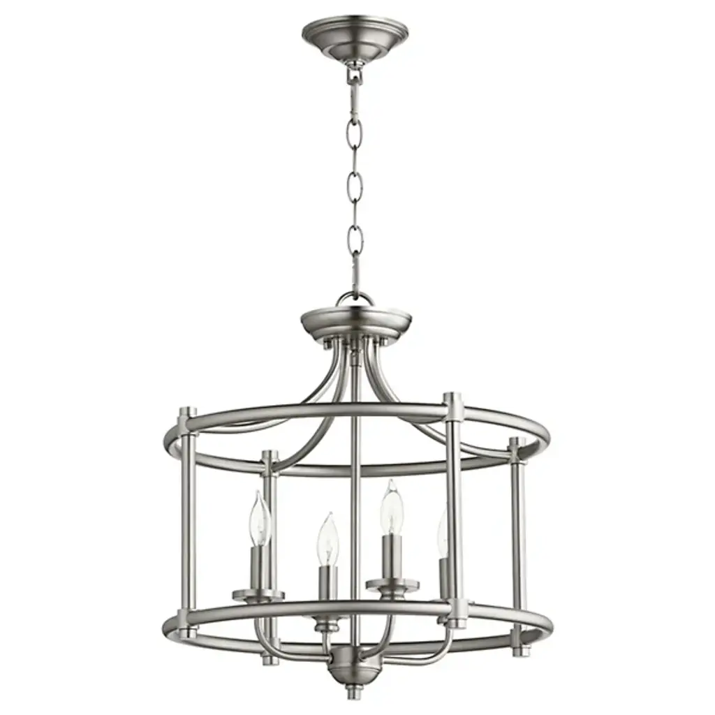 A clean and open modern piece, the Olympus Round Chandelier from Quorum International uses smooth metal to elevate the décor of your home. Hanging from the ceiling by a chainlink and downrod combination, this piece features a drum-shaped silhouette hollowed out and containing a series of thin metal lines and a set of five candelabra-style bulbs. The light is bright and even, spreading beyond the metal and throughout the space with ease.