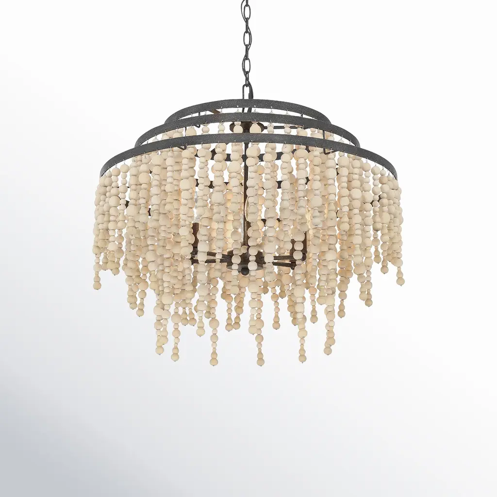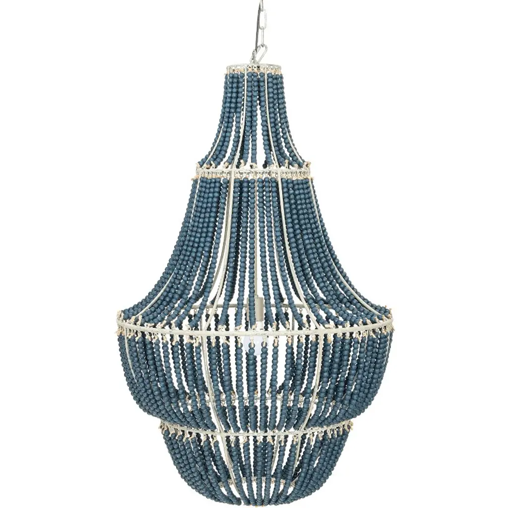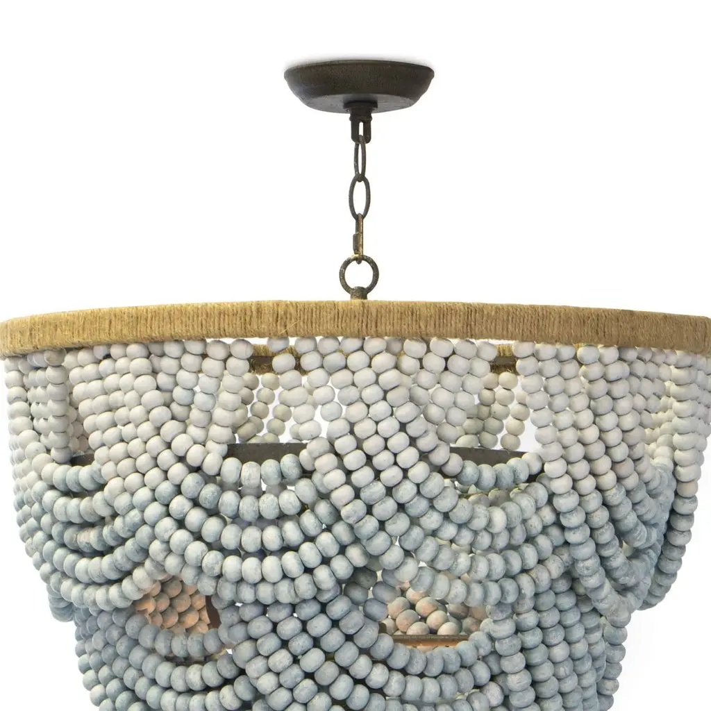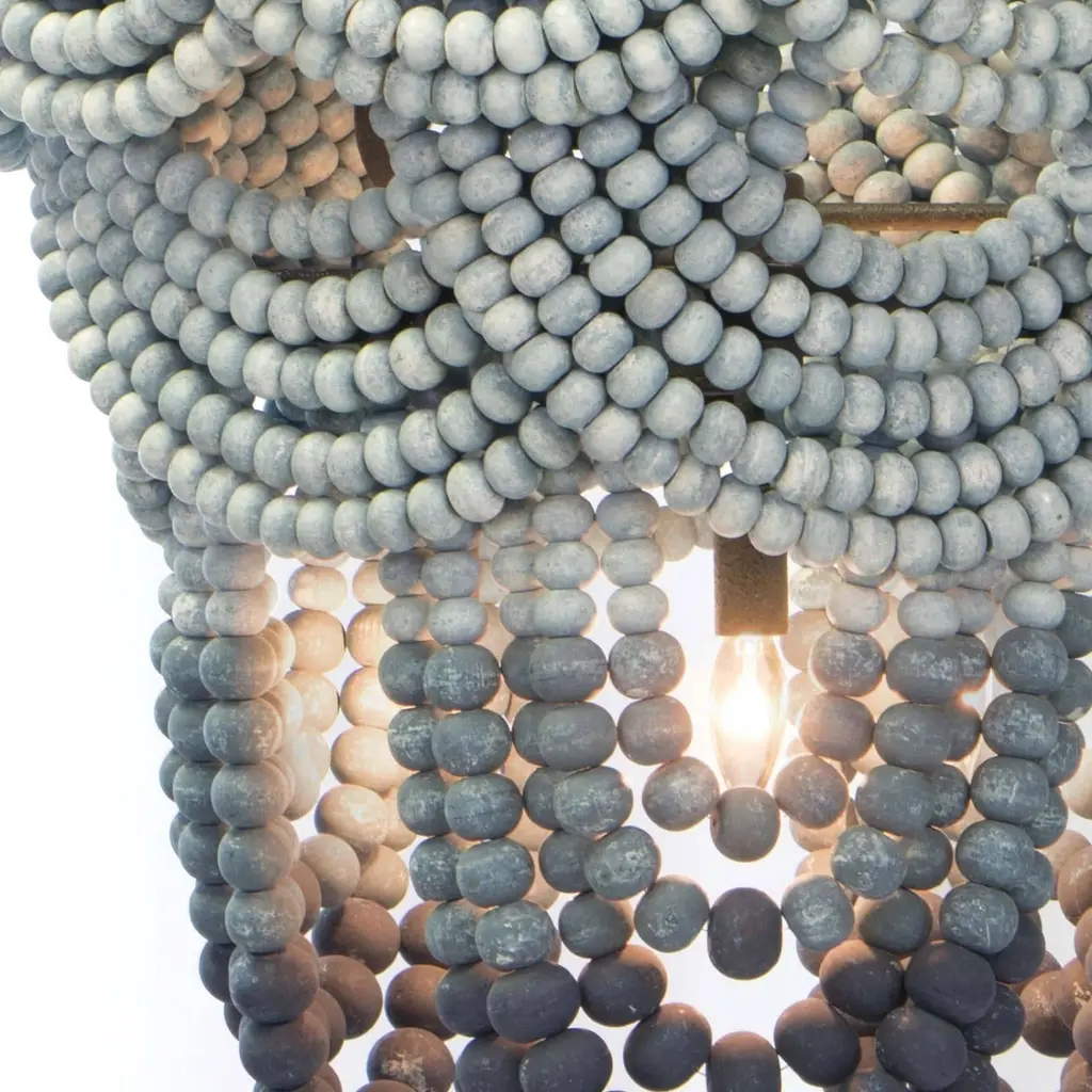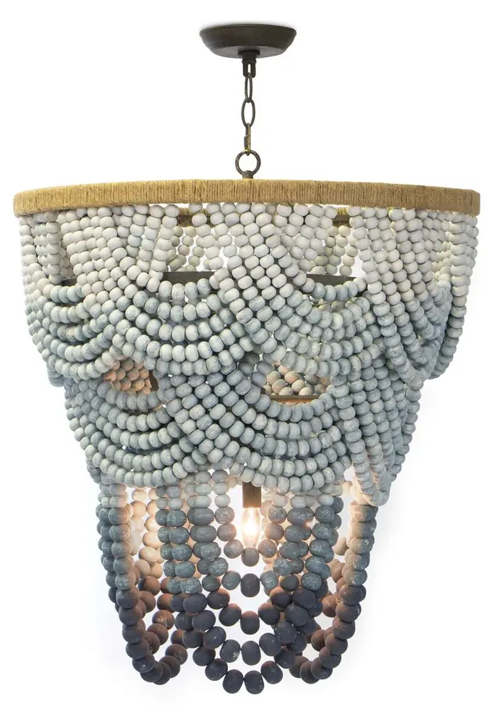 We’ve ombre’d lighting in this latest coastal chic chandelier. Wooden beads in various shades of blue drape gracefully in gradient layers, capped with a rattan-wrapped circular frame. This would look serene in a living room or breakfast nook.This product has proudly been finished by hand. Because of its unique hand craftsmanship, subtle differences should be expected and appreciated as part of its creative design. These differences are not considered a defect.