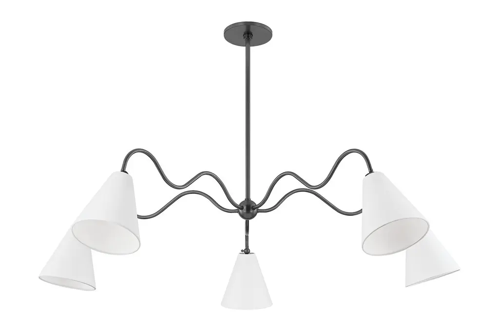 Squiggly arms reminiscent of freehand doodles are Ondas main draw. A sense of movement is implied, reinforced by the fact that the shades pivot. The fresh white linen gently diffuses light, casting a warm glow from counter to corner. Onda is available as a 3 or 5-light chandelier or 1 or 2-light plug-in sconce. Part of our Tali Roth x Mitzi Tastemakers collection.