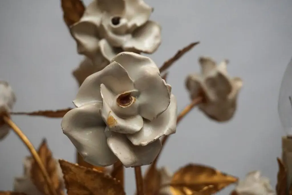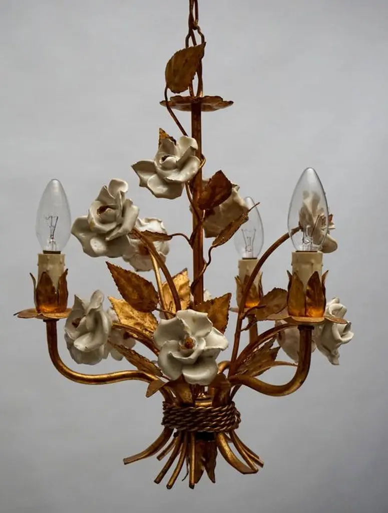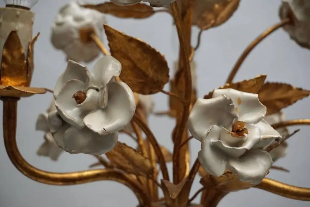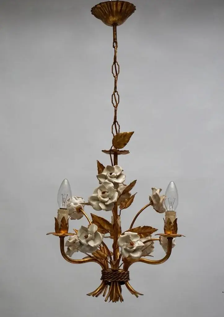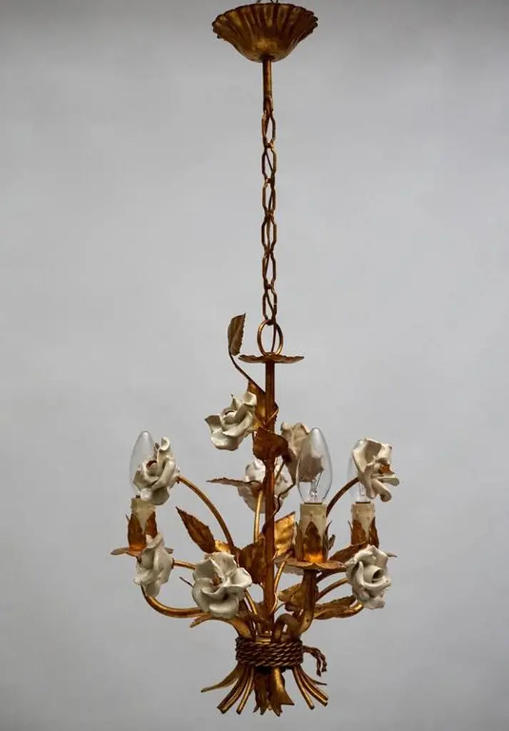 One Of Two French Gilt Metal Chandeliers With Porcelain Flowers