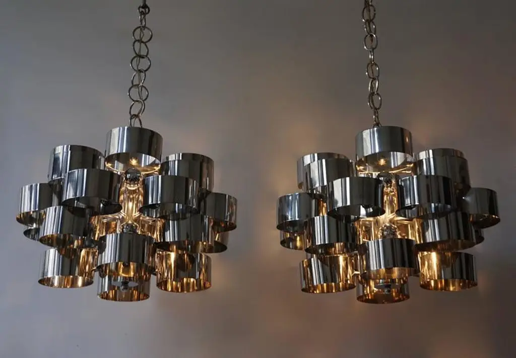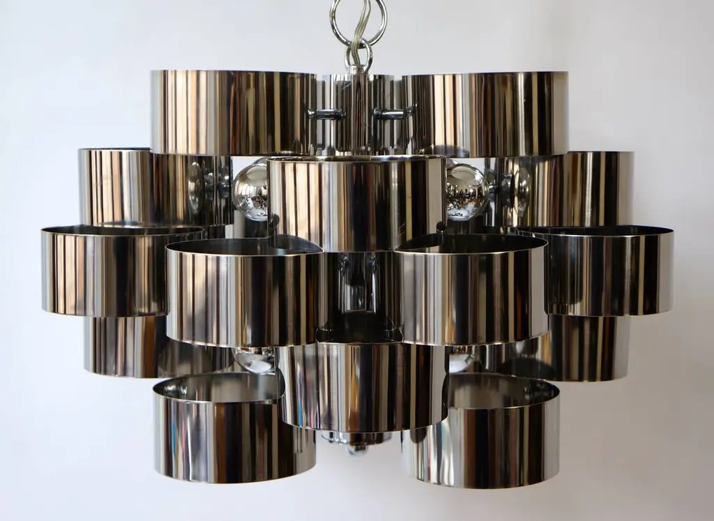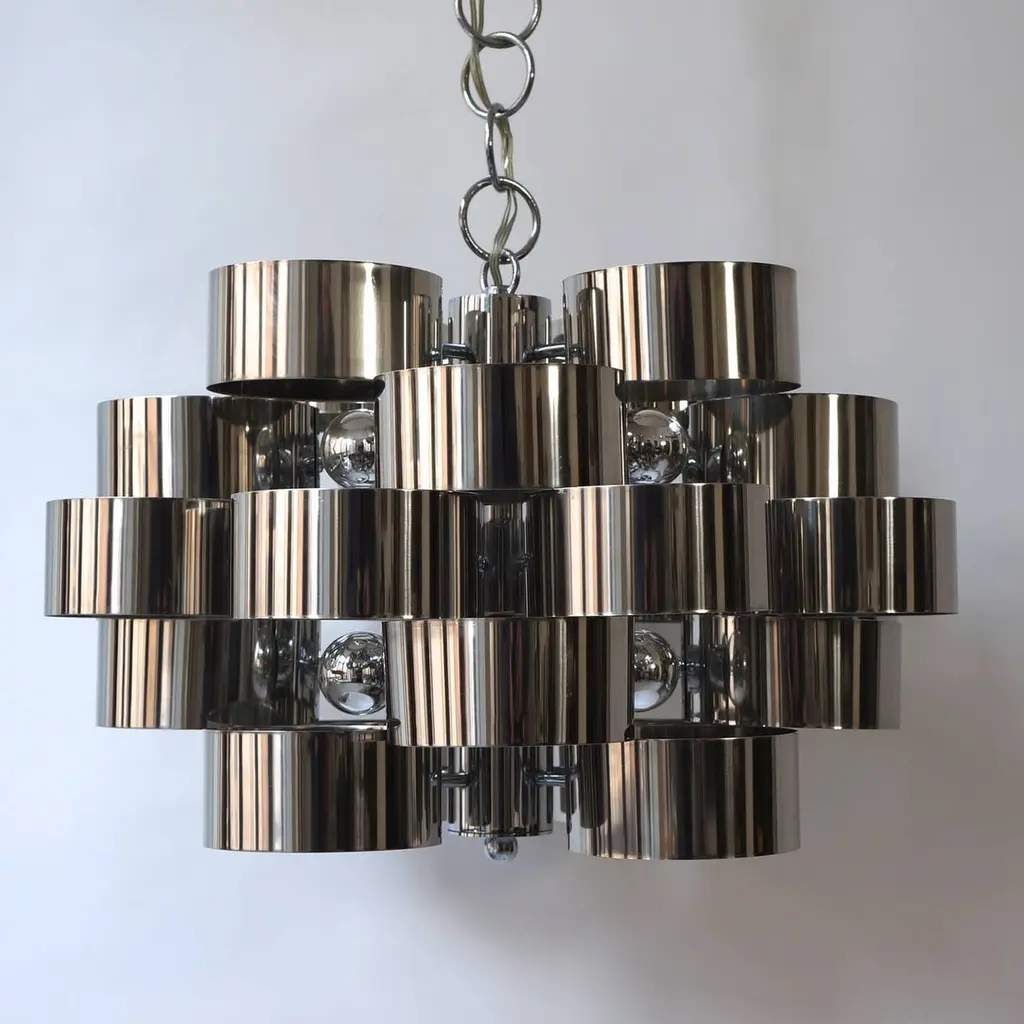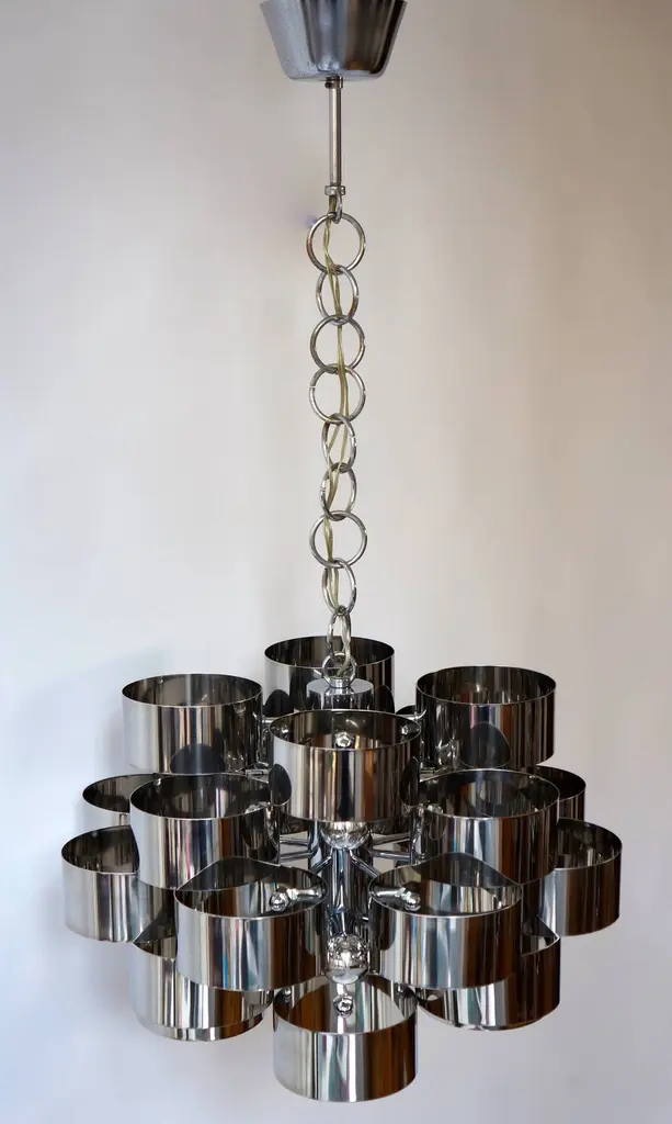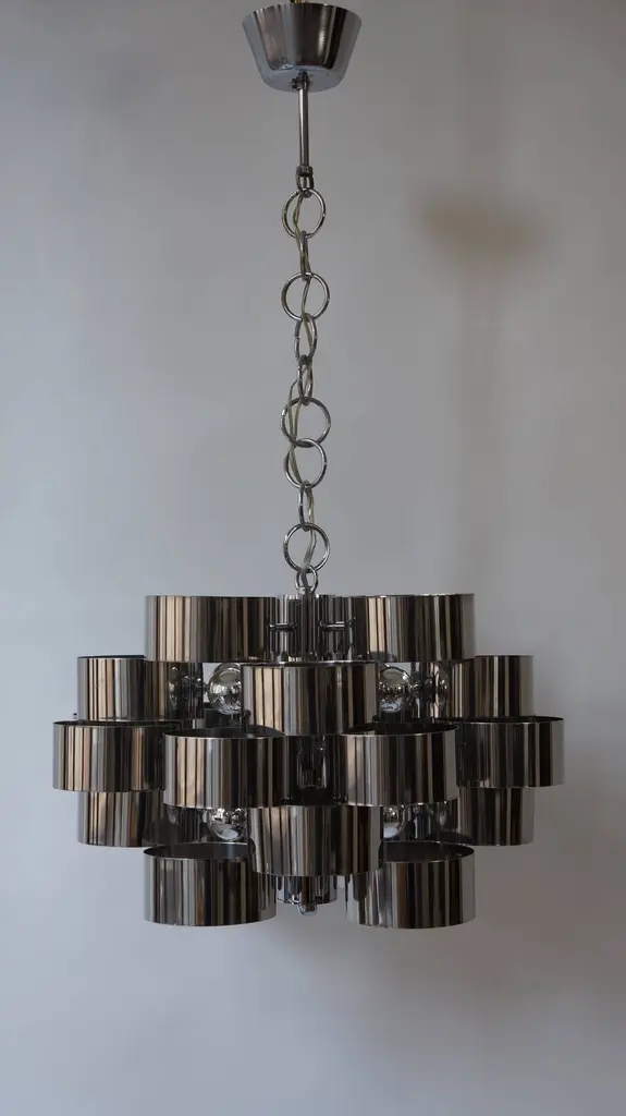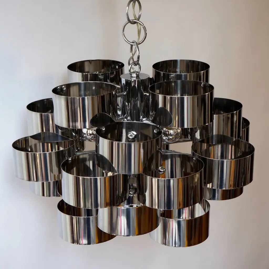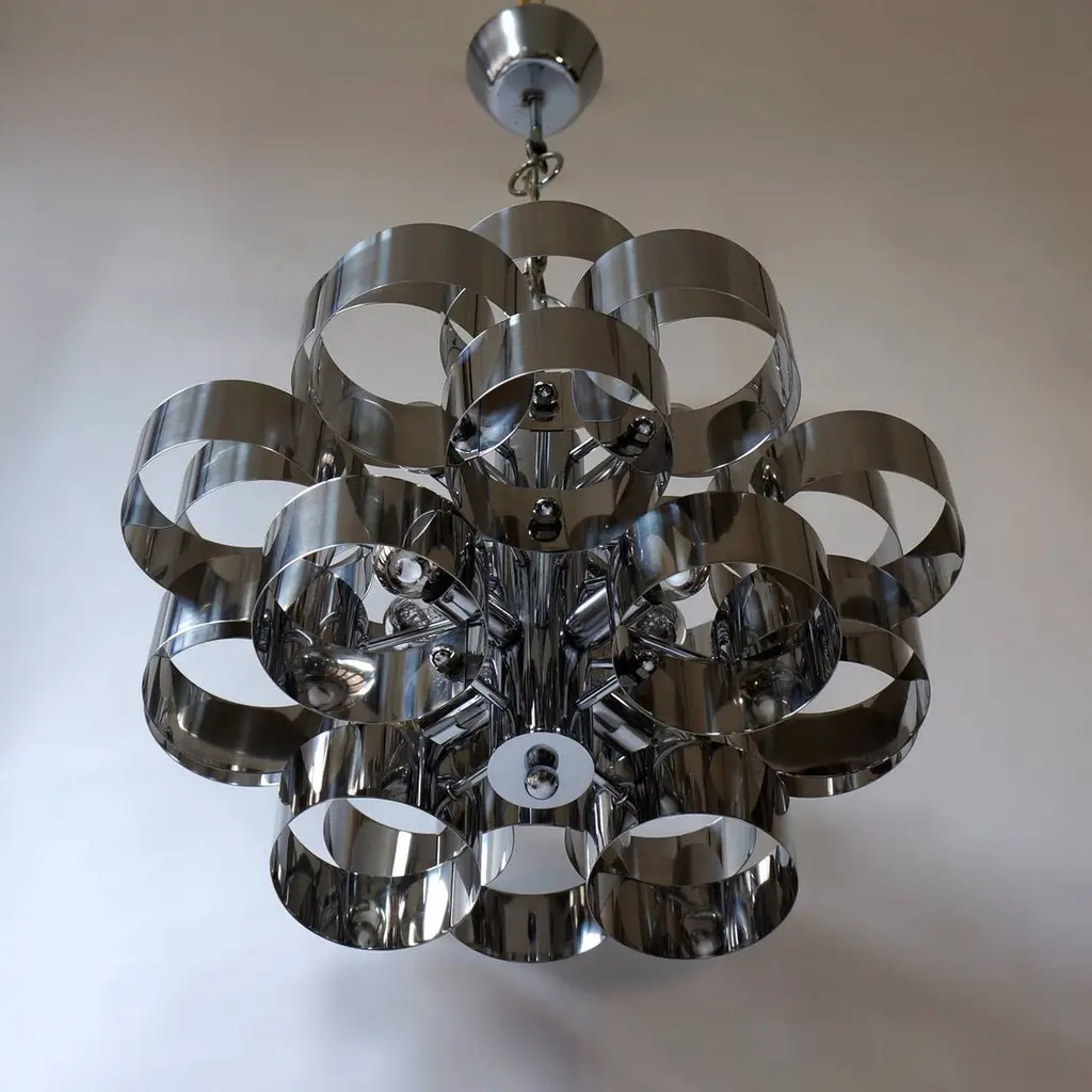 One of two of 1970s chrome band loop chandeliers by Gaetano Sciolari.Diameter 50 cm.Height fixture 31 cm.Please note that price is per item not for the set.