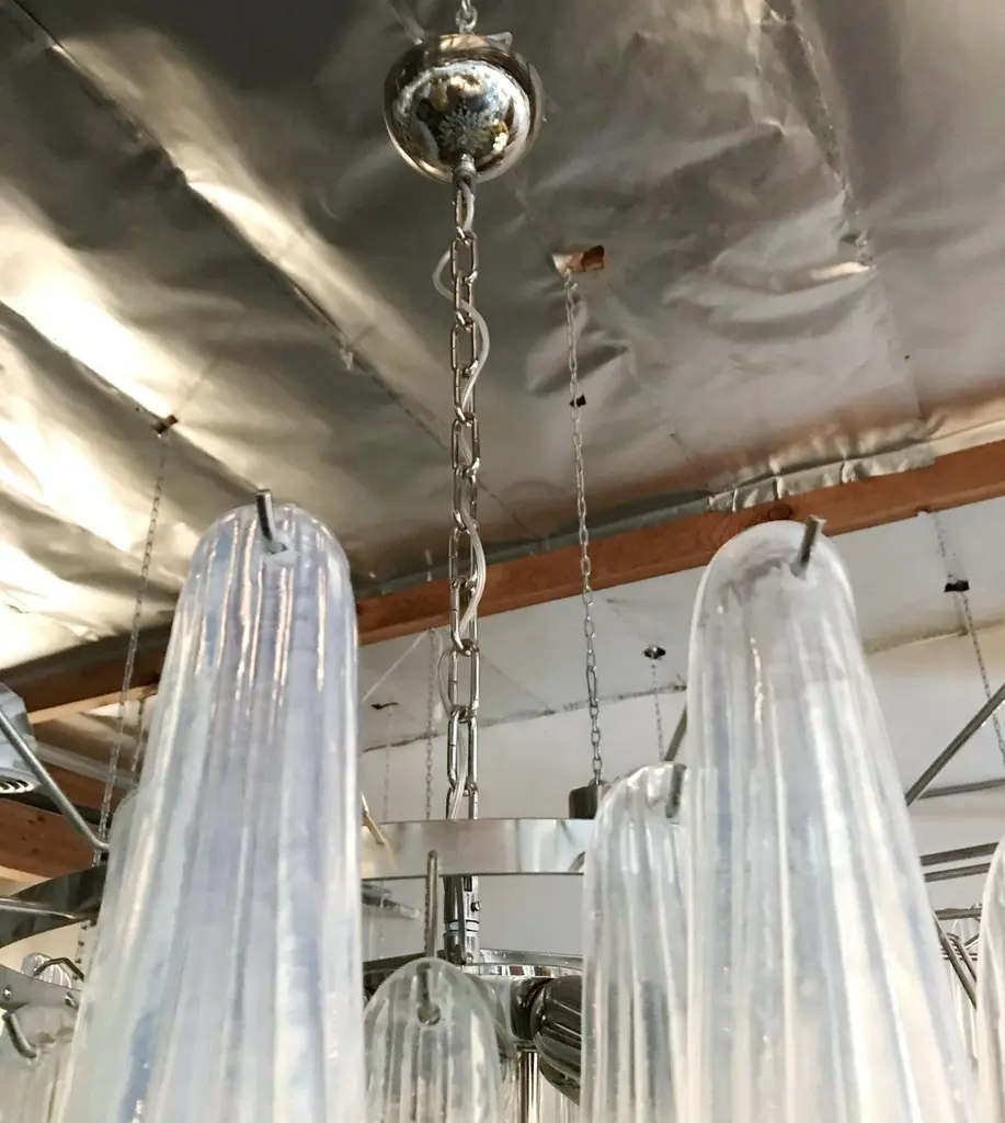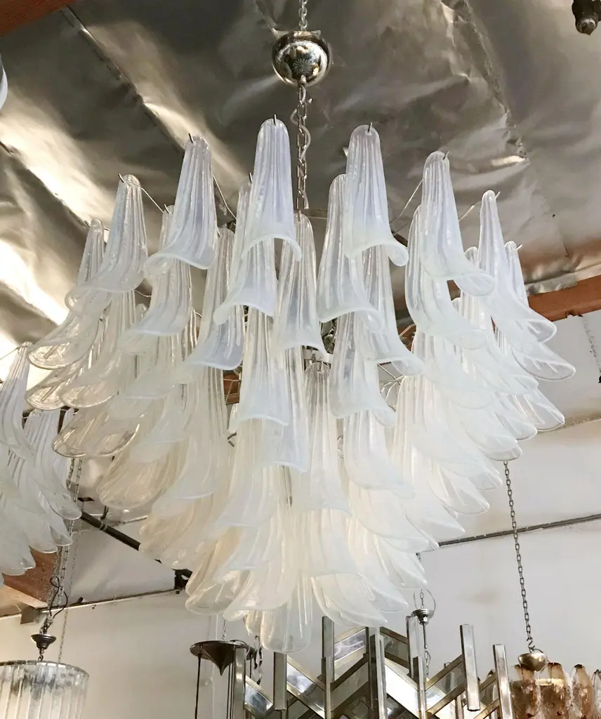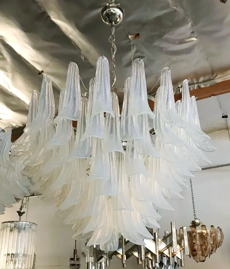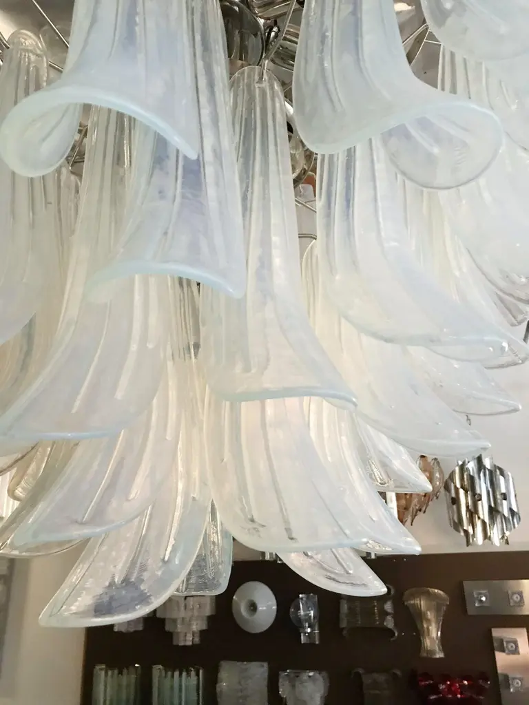 Italian chandelier shown with iridescent opaline Murano glass petals mounted on chrome finish frame / Designed by Fabio Bergomi for Fabio Ltd, inspired by Mazzega / Made in Italy13 lights / E26 or E27 type / max 60W eachMeasures: diameter 35.5 inches / height 27.5 inches plus chain and canopyOrder only / This item ships from Italy.