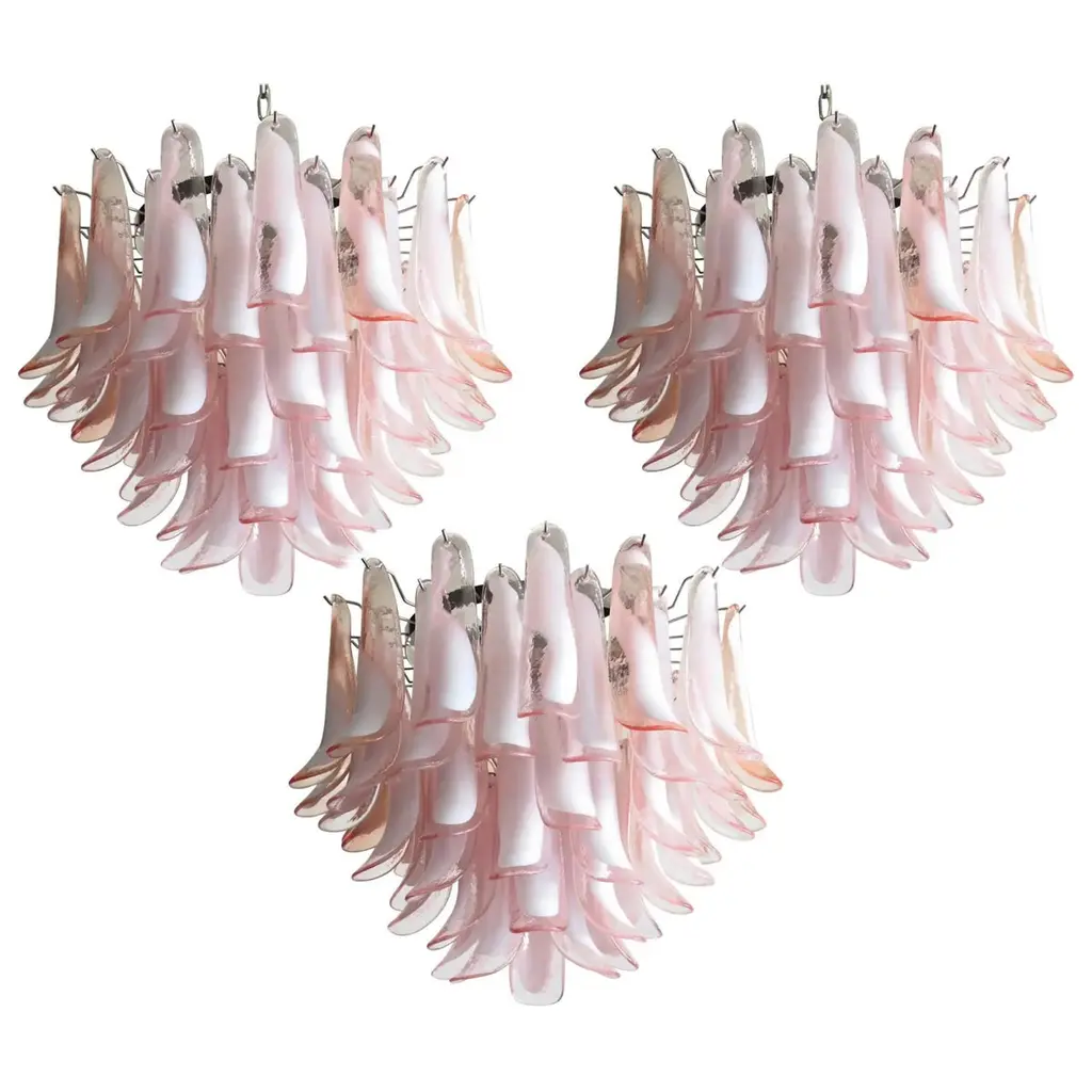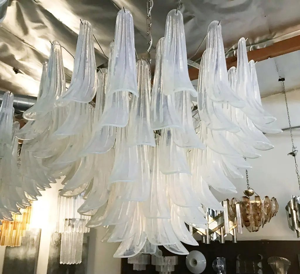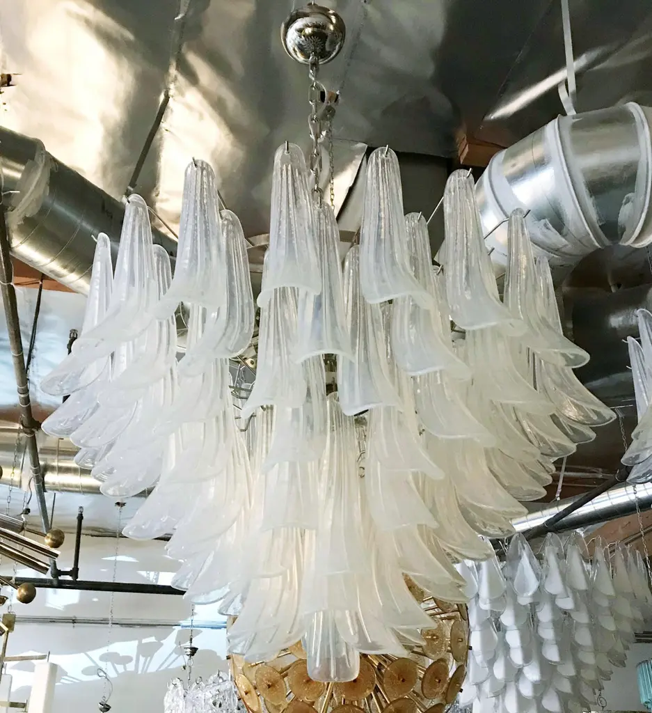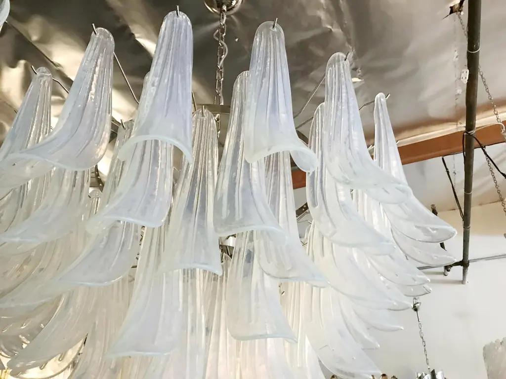 Italian chandelier shown with iridescent opaline Murano glass petals mounted on chrome finish frame / Designed by Fabio Bergomi for Fabio Ltd, inspired by Mazzega / Made in Italy13 lights / E26 or E27 type / max 60W eachMeasures: diameter 35.5 inches / height 27.5 inches plus chain and canopyOrder only / This item ships from Italy.