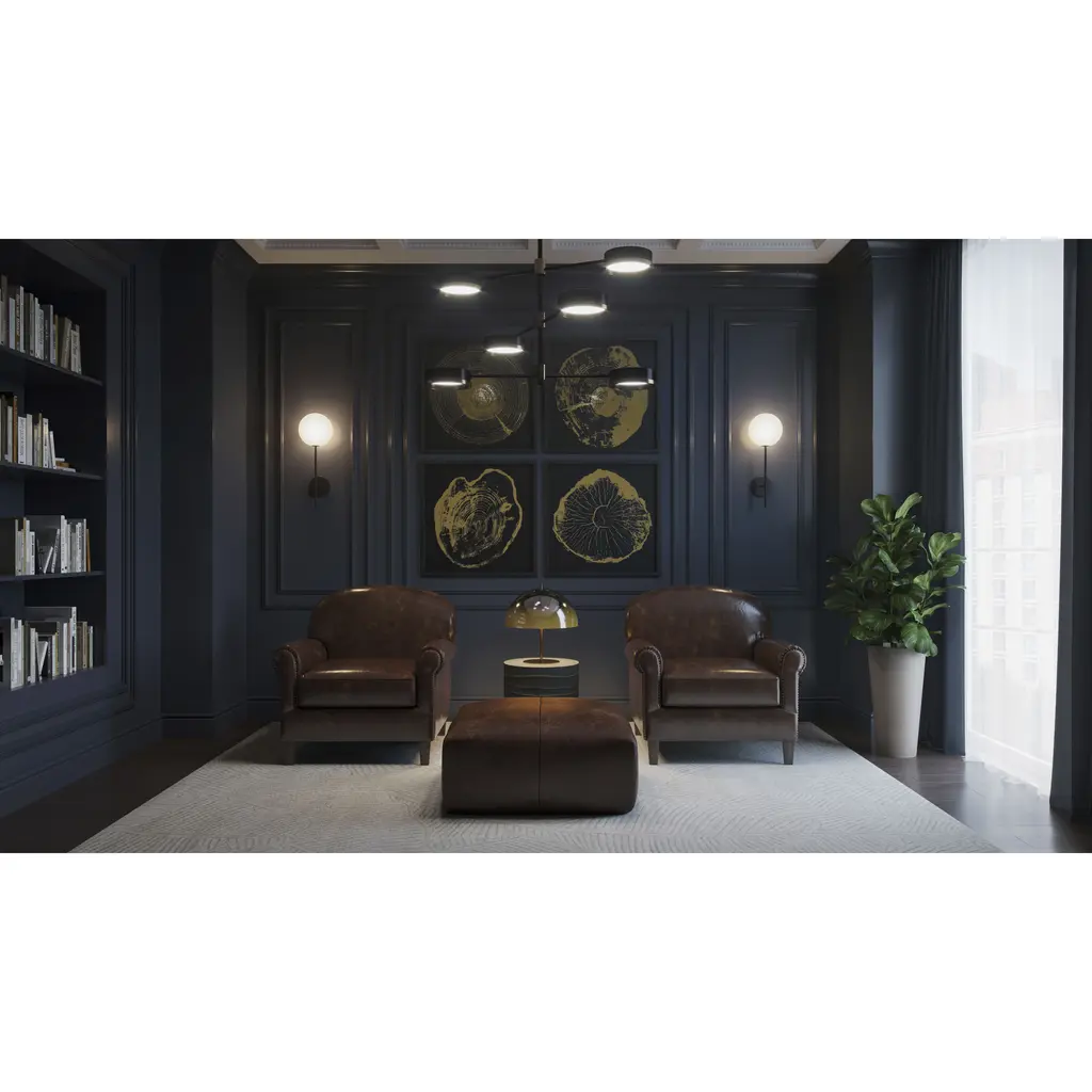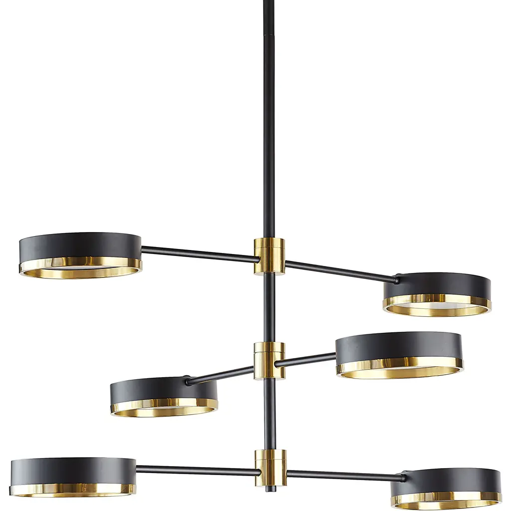 Bring together any space with this marvelous chandelier that will add modern style. Features a black metal frame with six flat cylindrical lamp shades. Arms can be adjusted horizontally for added design versatility. Completed with accenting brass plating.