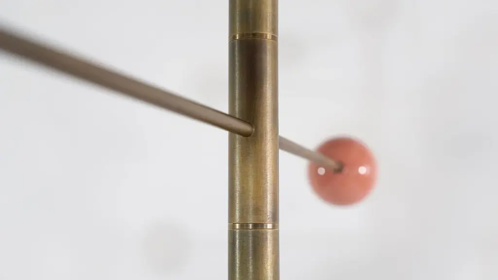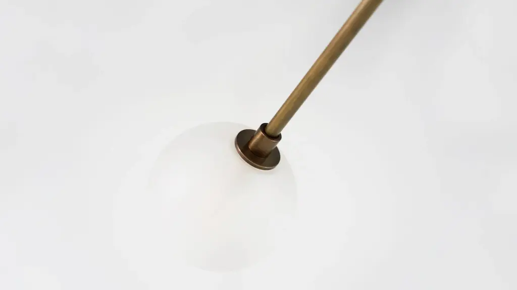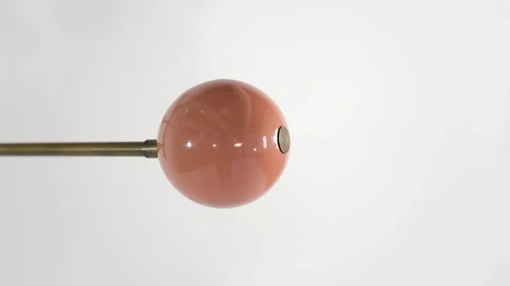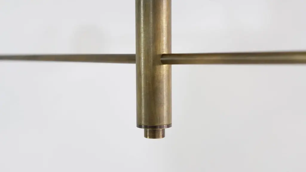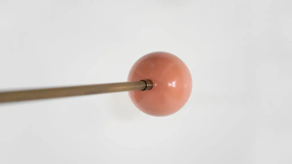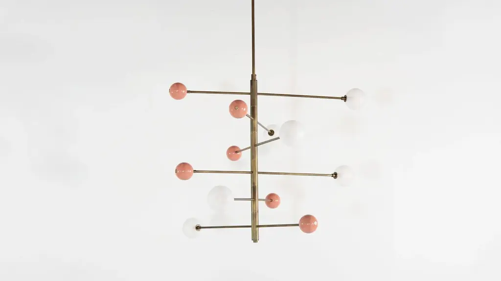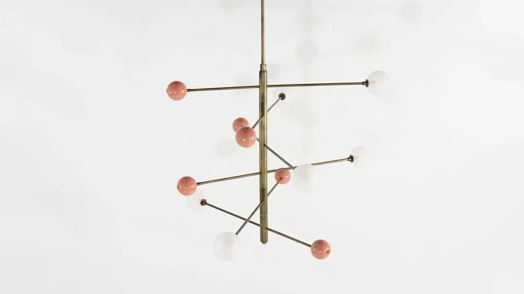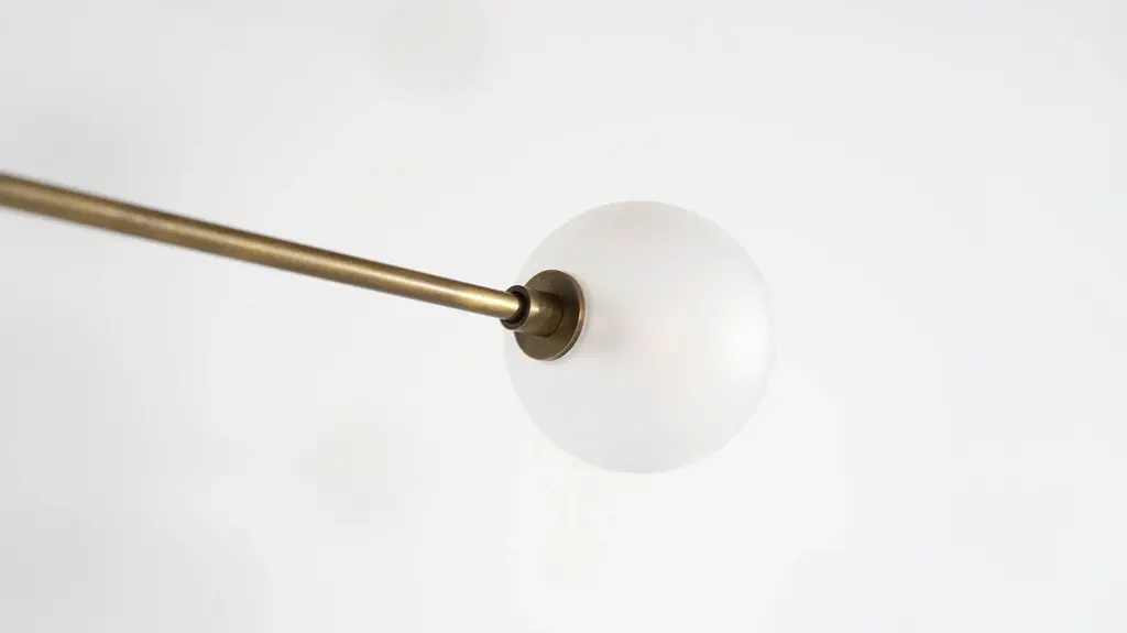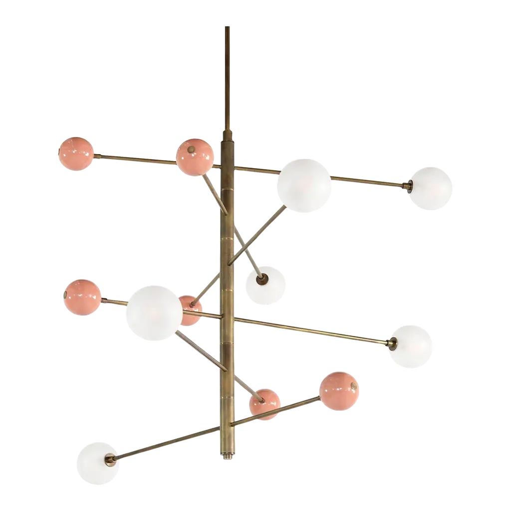 "Orbital" is a commanding statement piece with design elements of both Italian and French modernism as well as Hollywood Glam and is a stunning study in mixed materials. All arms of this chandelier are articulated with approximately a 320 degree horizontal rotation. The 4 inch satin glass globes are hand blown. The body of the chandelier as shown is 32 inches tall with a 40 inch diameter. The decorative globes are 3 inches and are shown here in "Mannequin" enamel. G9 socket (halogen-style socket with 2 pins). Dimmable. We recommend G9 LED bulbs: 5w LED with 60 watt equivalent. Bulbs not included. Handcrafted in NYC by Blueprint Lighting, UL certified.