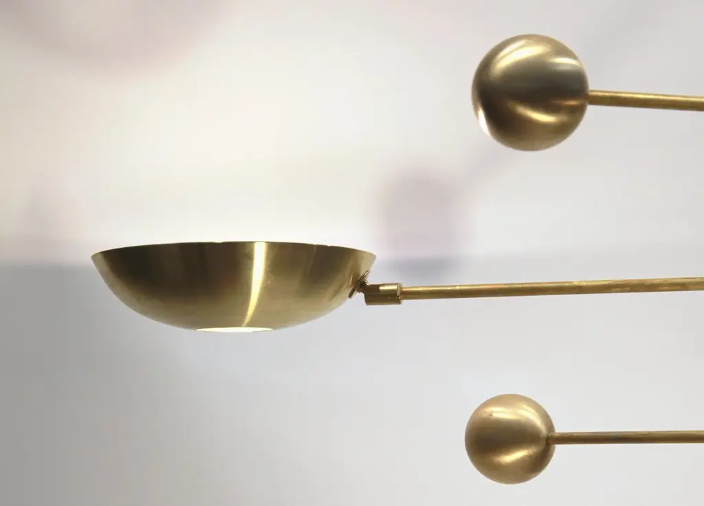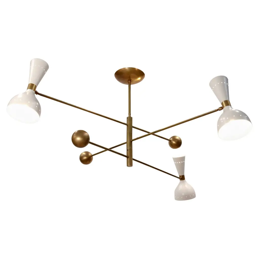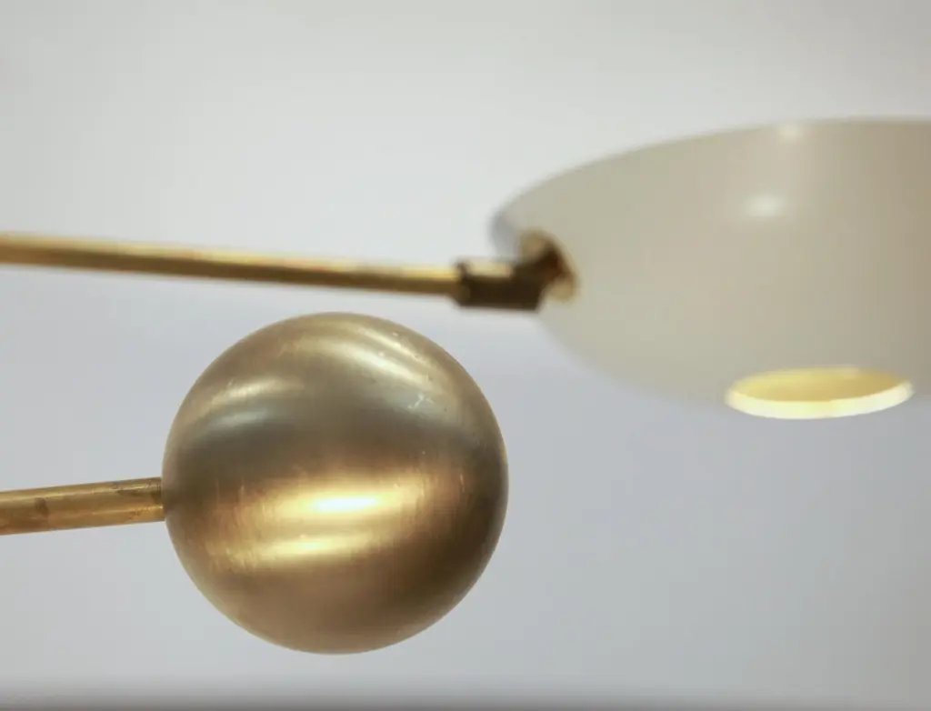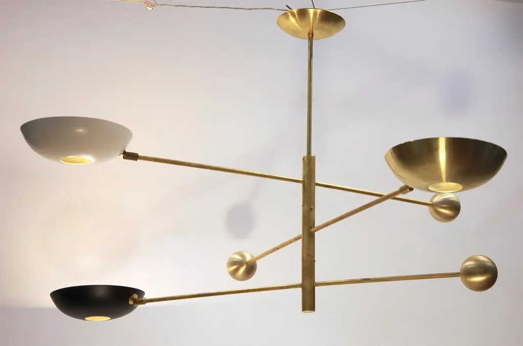 This exquisite bespoke brass chandelier features three rotating arms skillfully balanced on a heavy cast brass sphere that rotate in an orbital movement along the stem. To achieve perfect balance, each sphere is filled with sand, creating a point of no leverage.The shades are connected to the arms with pivot joints so that the light can be oriented in different ways.Although it provides mostly ambient light reflected towards the ceiling with the shades acting as reflectors, each shade has a hole in it which shines some direct light downwards, highlighting the tips of reflecting objects such as silverware and crystalware and giving them depth.In order to create a uniform, warm light output, the brass shades, even the lacquered ones, are left in natural brass. This provides a warm ambient light.The arms and the body are made in natural solid brass and hand finished. The standard shade colors are ivory, black and natural brass. Natural patina brass comes as standard.The outline of the shades was designed to echo the iconic 1950s pieces by mid-century modern Italian studios Arteluce and Stilnovo, but with a unique and distinctive design that will add elegance and sophistication to any home.The arms have a diameter of 12 mm, with thick walls to make them perfectly rigid. The stems are made with a system that can rotate 180 degrees on each arm, making any position possible. The chandelier can be rotated when it is already lit.The lightbulb recommended is an A15 with an E26 (US) or E27 (EU) base. The shade was designed so that if an A15 bulb is used (one of the most common on the market), it will be centered with the hole. This chandelier is currently only made to order. Please contact us for any special size requirements.This fixture must only be installed by someone who is familiar with how the product is constructed and operated.