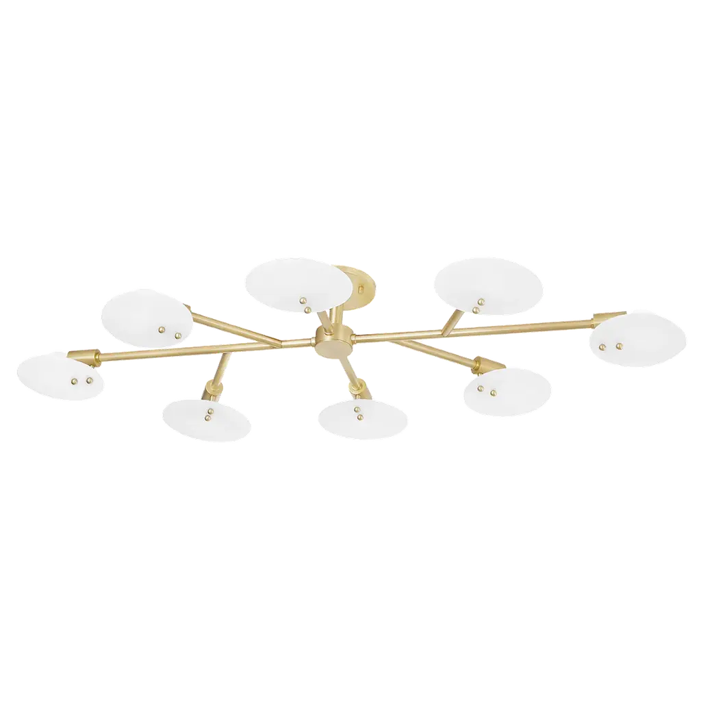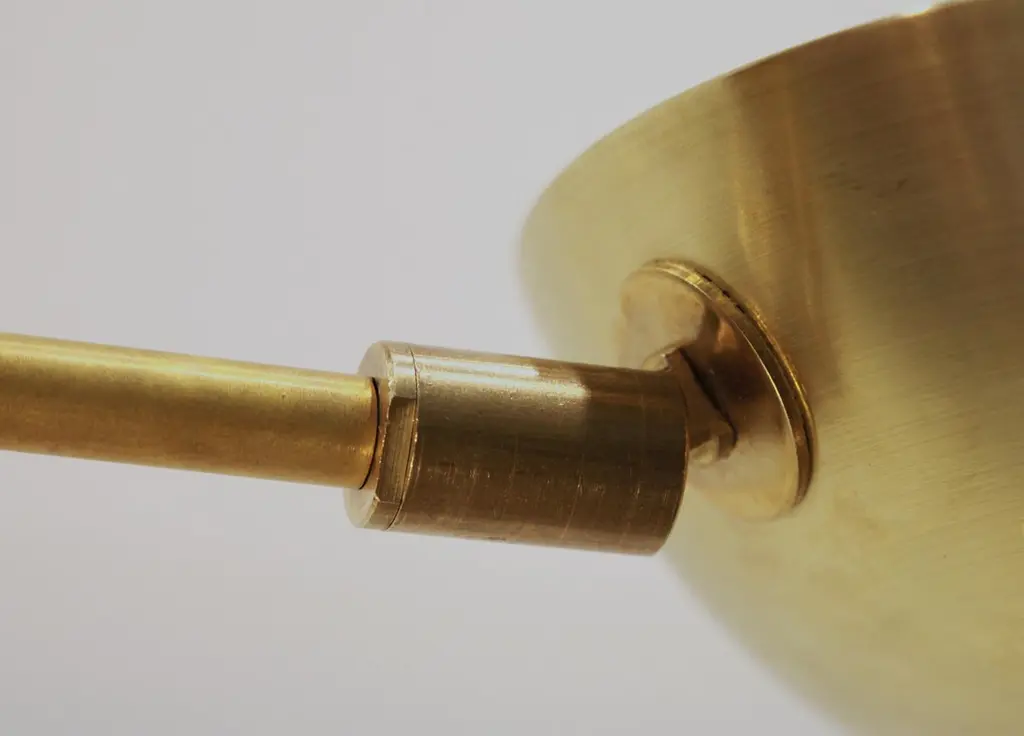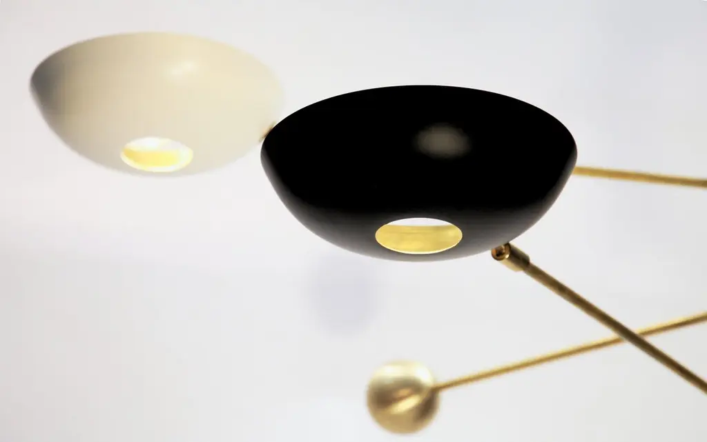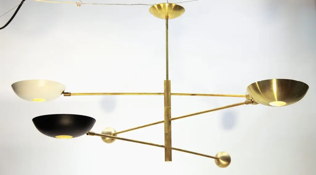 This exquisite bespoke brass chandelier features three rotating arms skillfully balanced on a heavy cast brass sphere that rotate in an orbital movement along the stem. To achieve perfect balance, each sphere is filled with sand, creating a point of no leverage.The shades are connected to the arms with pivot joints so that the light can be oriented in different ways.Although it provides mostly ambient light reflected towards the ceiling with the shades acting as reflectors, each shade has a hole in it which shines some direct light downwards, highlighting the tips of reflecting objects such as silverware and crystalware and giving them depth.In order to create a uniform, warm light output, the brass shades, even the lacquered ones, are left in natural brass. This provides a warm ambient light.The arms and the body are made in natural solid brass and hand finished. The standard shade colors are ivory, black and natural brass. Natural patina brass comes as standard.The outline of the shades was designed to echo the iconic 1950s pieces by mid-century modern Italian studios Arteluce and Stilnovo, but with a unique and distinctive design that will add elegance and sophistication to any home.The arms have a diameter of 12 mm, with thick walls to make them perfectly rigid. The stems are made with a system that can rotate 180 degrees on each arm, making any position possible. The chandelier can be rotated when it is already lit.The lightbulb recommended is an A15 with an E26 (US) or E27 (EU) base. The shade was designed so that if an A15 bulb is used (one of the most common on the market), it will be centered with the hole. This chandelier is currently only made to order. Please contact us for any special size requirements.This fixture must only be installed by someone who is familiar with how the product is constructed and operated.