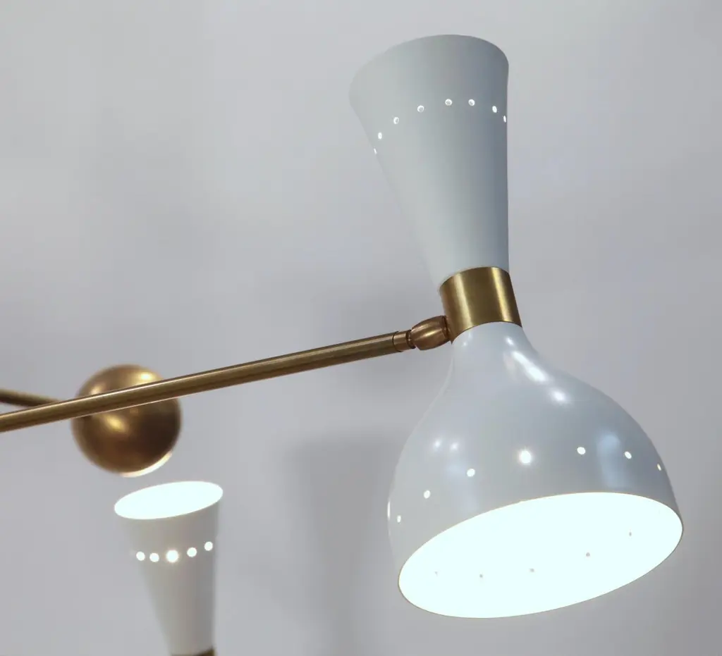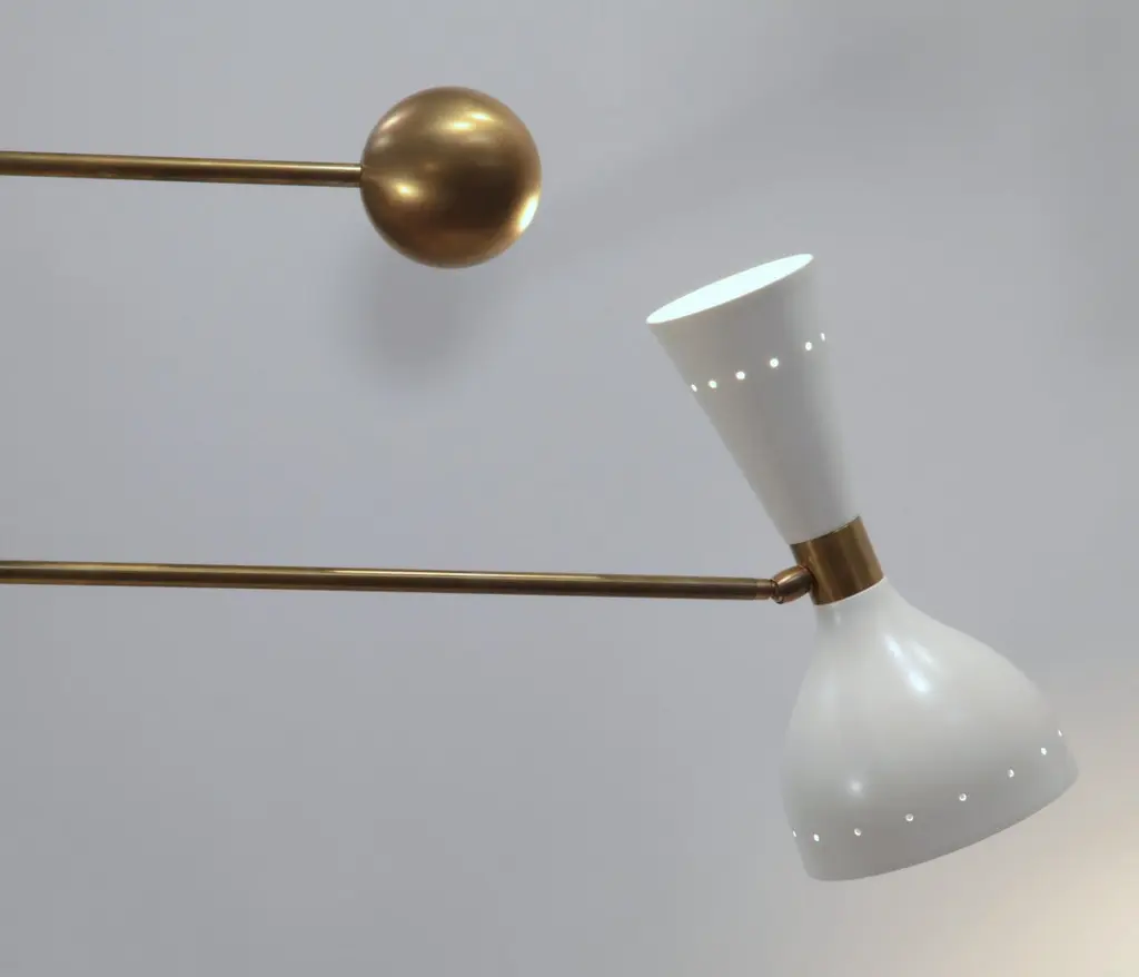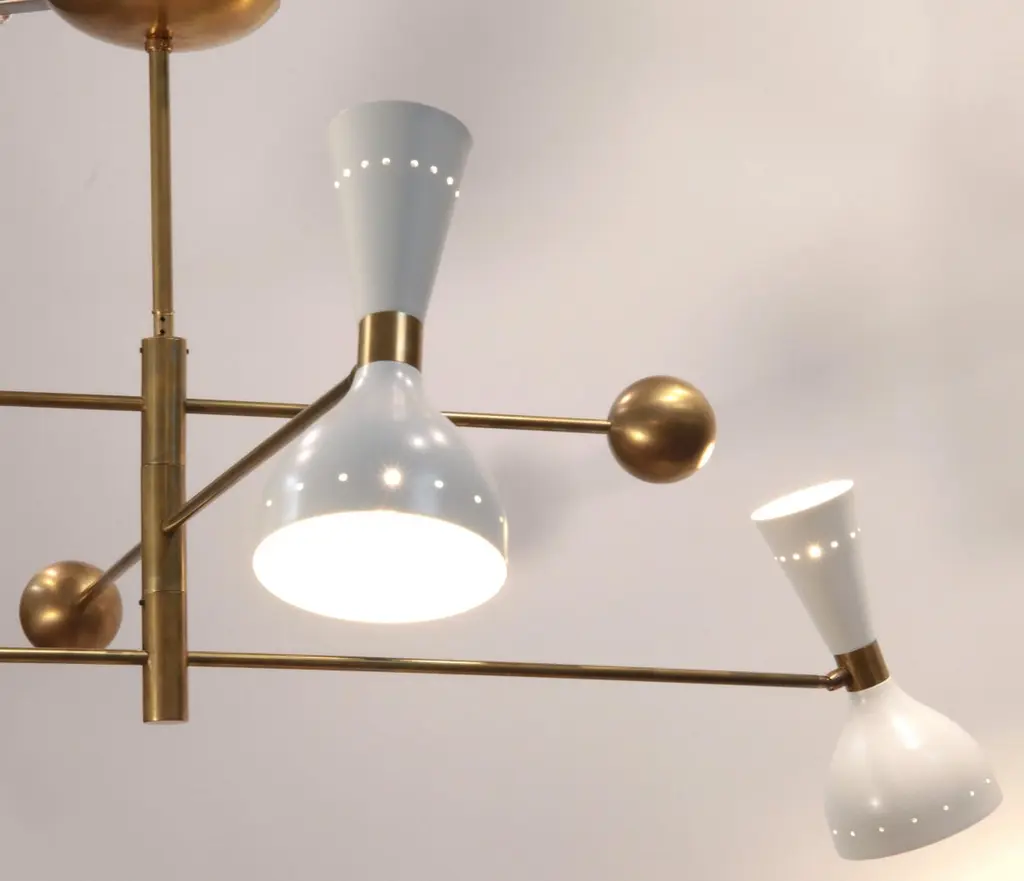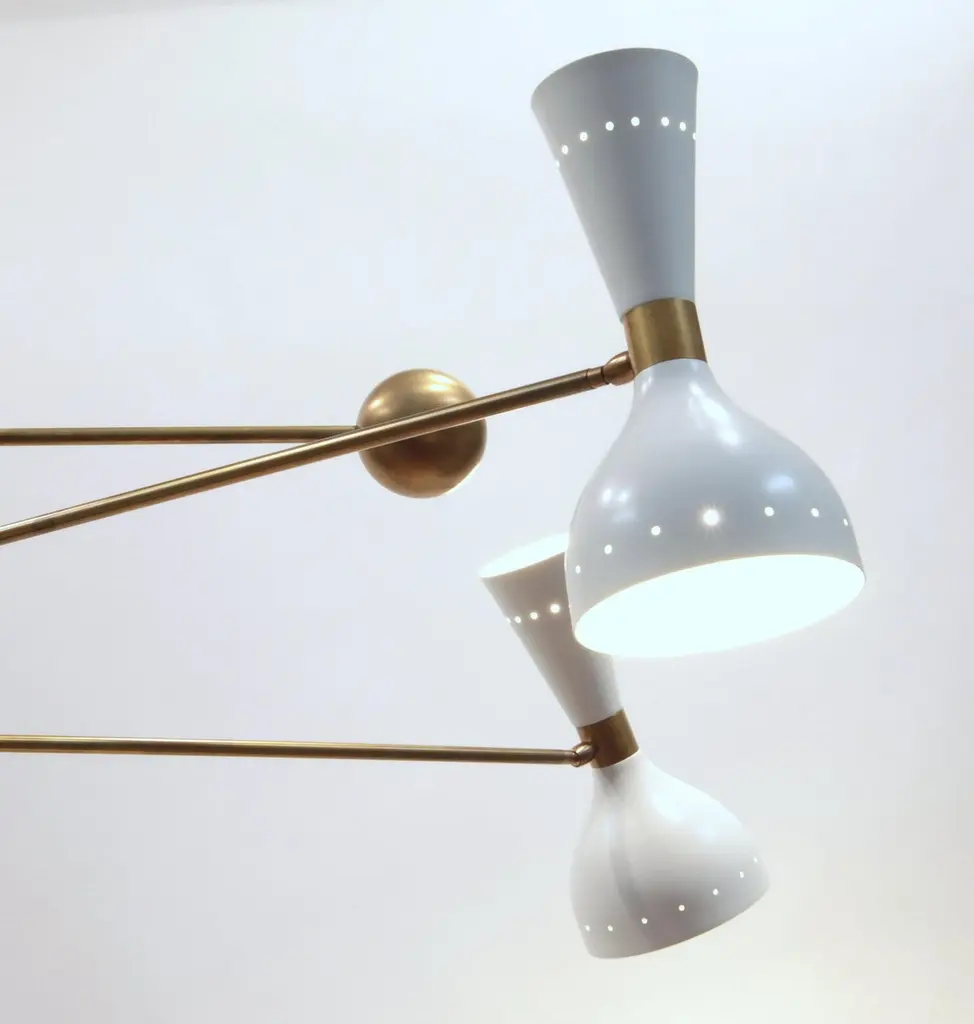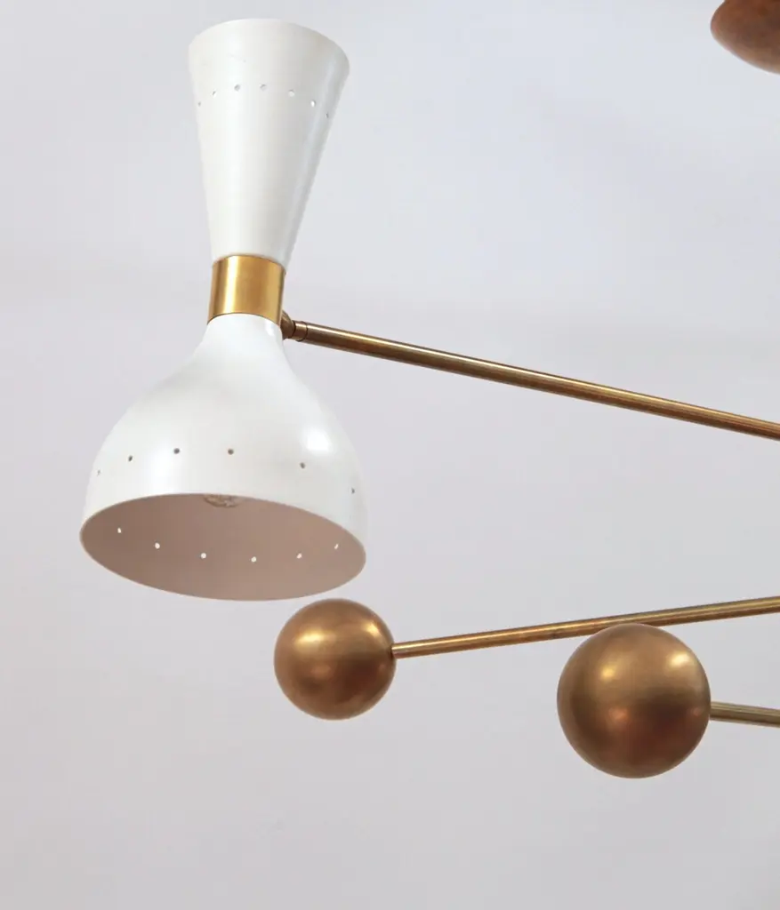 This 3-armed chandelier with twin shades is a versatile and elegant fixture perfect above a kitchen island, over a counter, dining table, or in a living room. The chandelier's three rotating arms and adjustable shades provide task lighting and customizable illumination options.The arms are balanced with a heavy cast brass sphere and rotate in an orbital movement around the stem. To ensure perfect balance, the sphere is filled with sand, reaching the point of no leverage. The hand-spun aluminum shades are lacquered with ivory powder paint and finished with an eggshell semi-matte sheen. They are connected to the arm with a pivot joint, allowing for a range of light orientations. Each shade holds two bulbs, with the larger shade fitting an E27/E26 A15 bulb for direct or task lighting, and the smaller cone holding a candelabra E14/E12 bulb for ambiance.The outline of the shades has been designed to echo the iconic 1950s pieces made by mid-century modern Italian studios Arteluce and Stilnovo, but with a unique and distinctive design that will add elegance and sophistication to any home.They can be customized with colors from the 1950s palette, such as ivory, sage and black. Other colors are available upon request.The stem features a rotating system with 180 degrees of motion on each arm, allowing for safe and easy adjustment of the chandelier's position. The standard brass finish features a beautiful noisette hazelnut patina achieved through the restorer technique of liver sulfur and uniformed with a polishing pad. Alternatively, the chandelier can be made with regular polished brass. The arms and body are crafted from natural solid brass and hand-finished.This chandelier is currently only made to order. Please contact us for any special size requirements.This fixture must only be installed by someone familiar with how the product is constructed and operated.